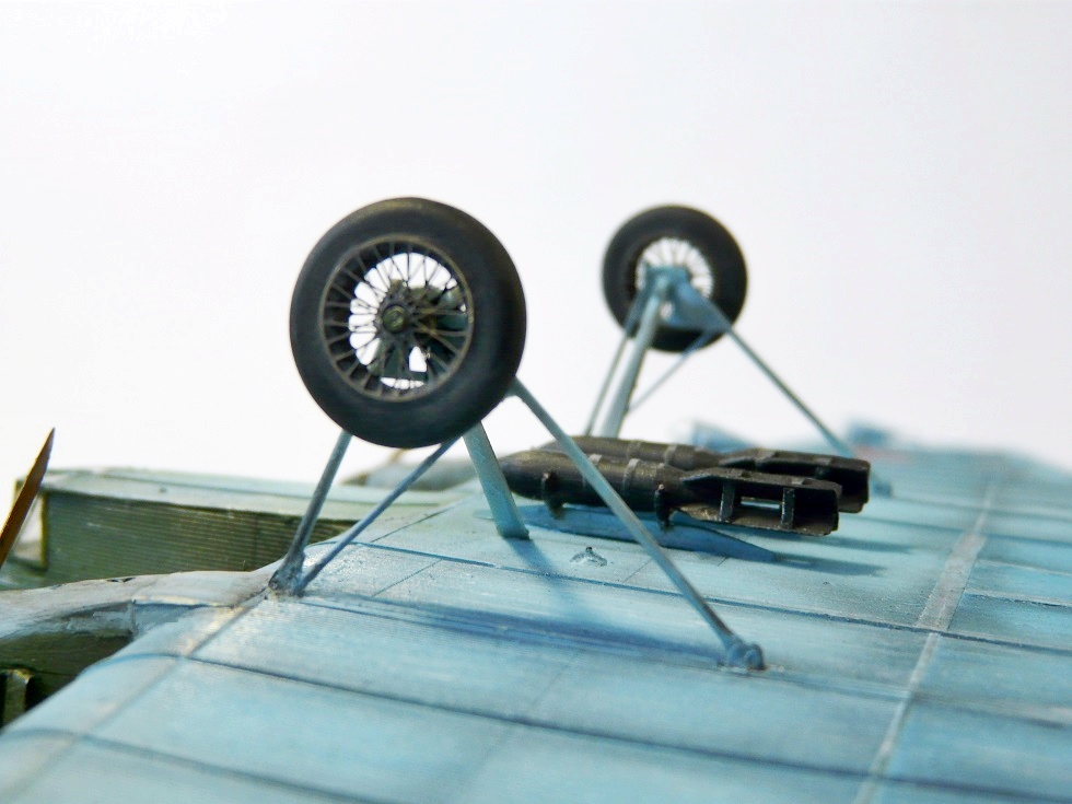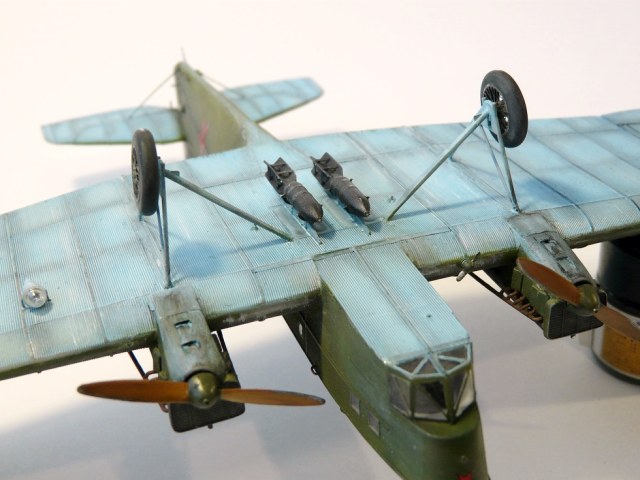 Мешаю краску из балонов самостоятельно. Основные опоры из набора, вспомогательные (принимают на себя всю нагрузку) - проволока и иглы. Зеленый винт - допустимо, но тогда лопасти должны быть без металлических накладок, они обклеивались полотном и полировались.