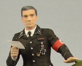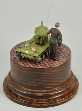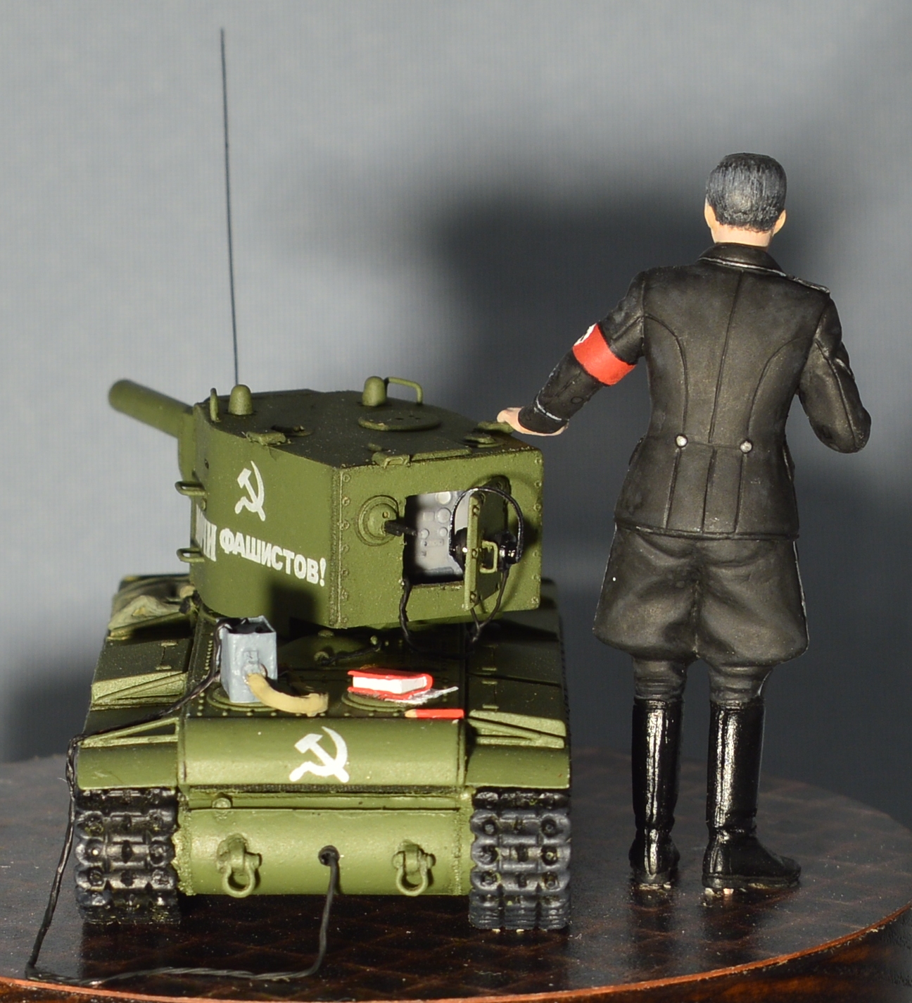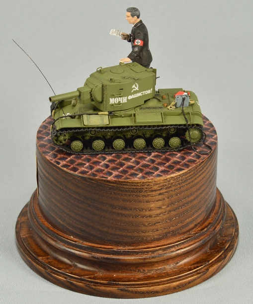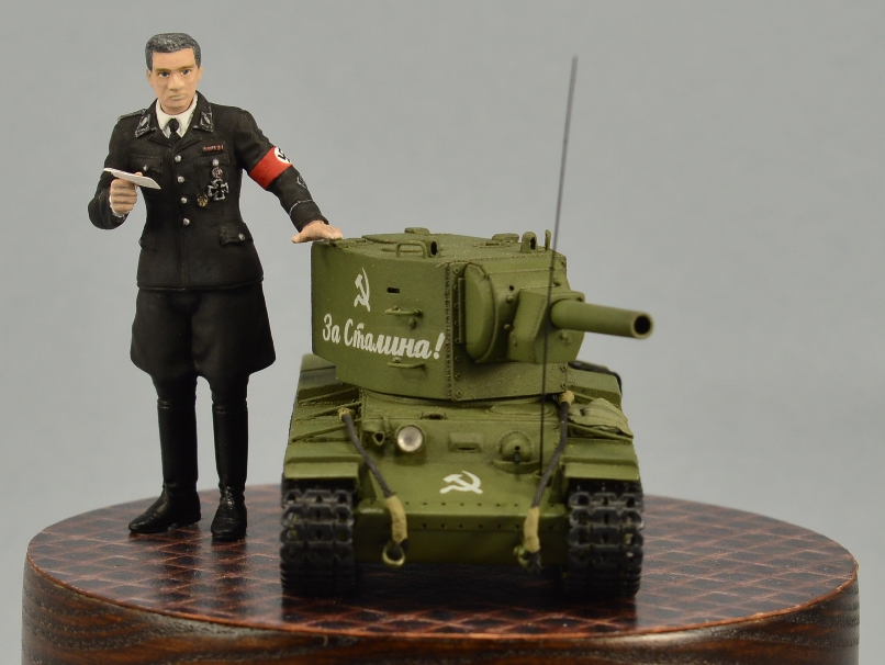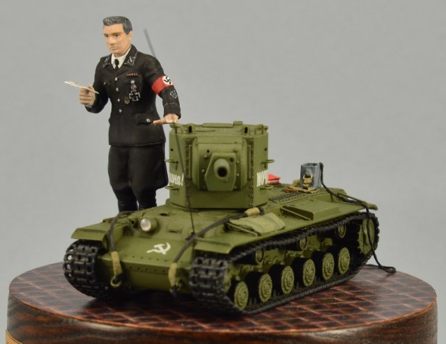 Дяденька, стоящий возле модельки танчика, по задумке автора, должен изображать из себя Штирлица. При сборке этого персонажа использовались различные части фигурок ICM и Master Box в масштабе 1/35. Покраска производилась ПВА темперой.