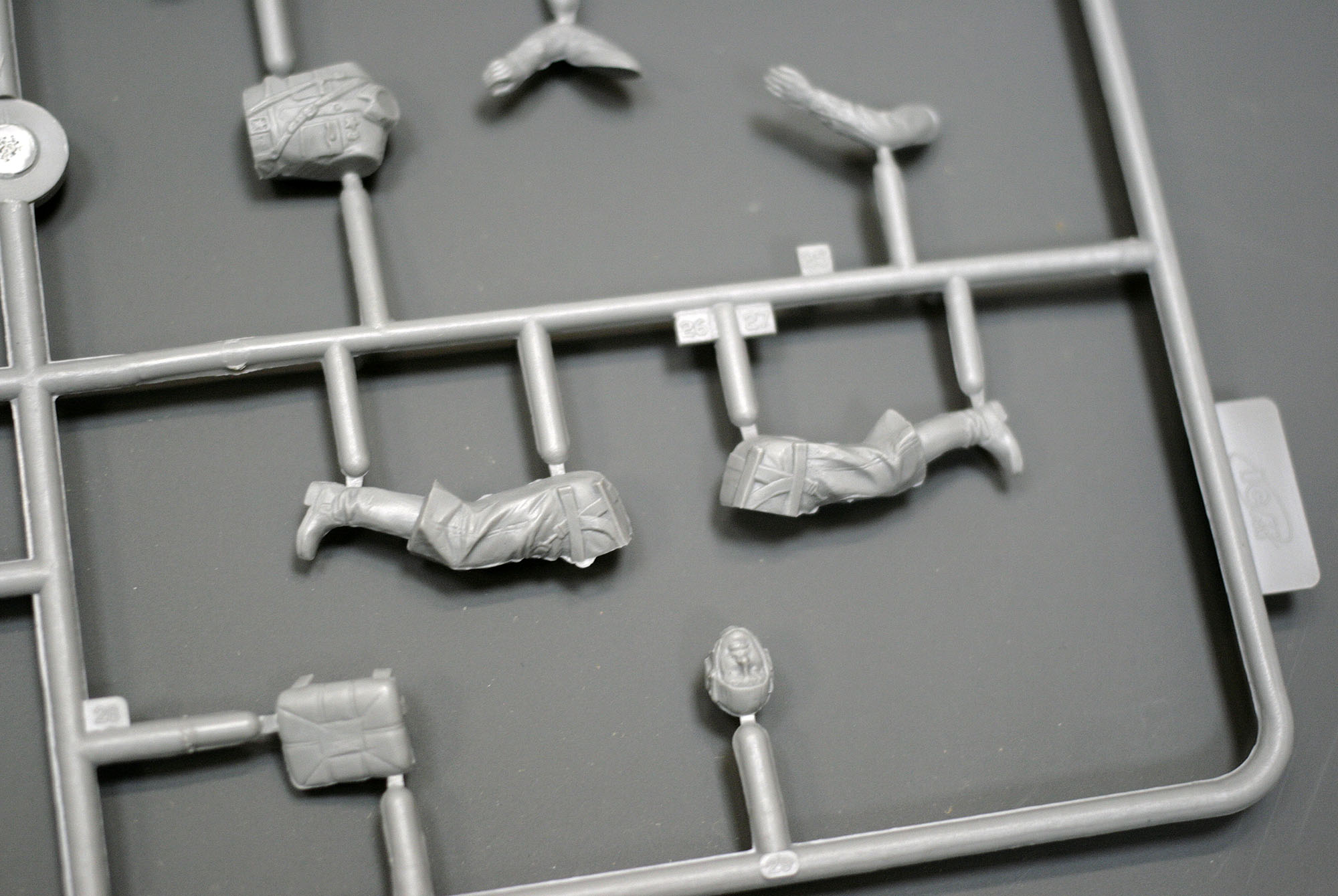 Деталировка фигур традиционно для ICM хорошая. Складки одежды, пряжки ремней и прочие мелочи выглядят хорошо. Живыми вышли и лица, хотя последние выглядят куда старше, чем на бокс-арте или в инструкции. Не очень хорошо выглядят ремни парашютов, слишком сильно они прилегают к одежде. Те части ремней, которые даны отдельными деталями лучше будет заменить на самодельные.