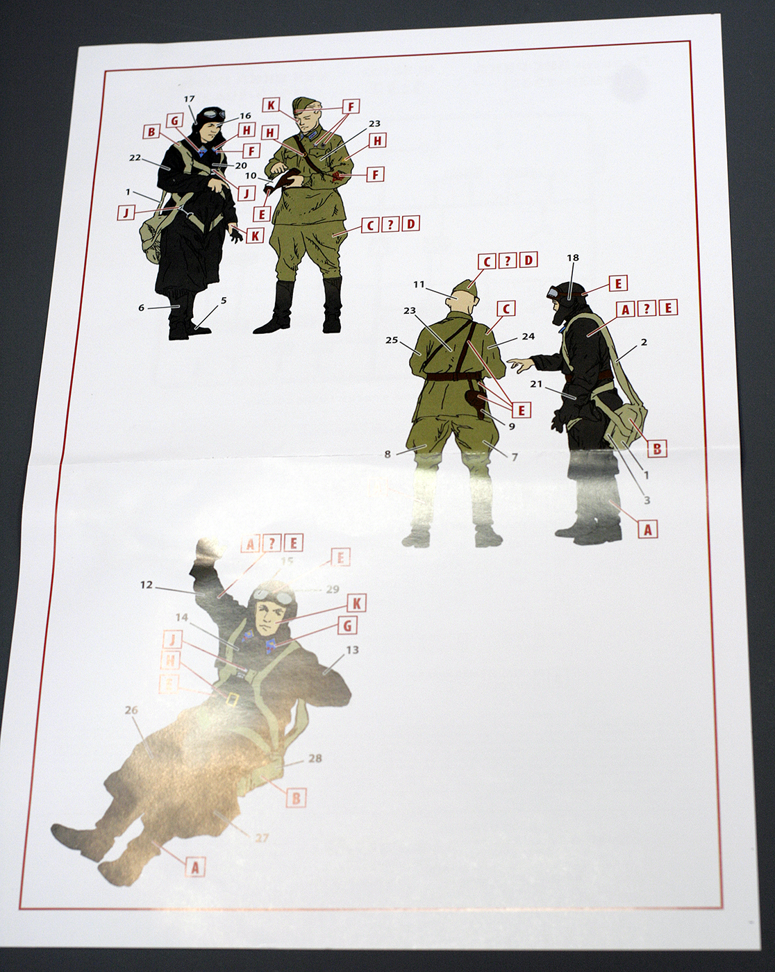 Набор содержит три фигуры пилотов в летней форме, двое из которых облачены в летную форму с пальто-регланом, а одна фигура одета в повседневную форму. Одна из фигур в летной форме дана в сидячем положении - можно смело сажать её в кабину.