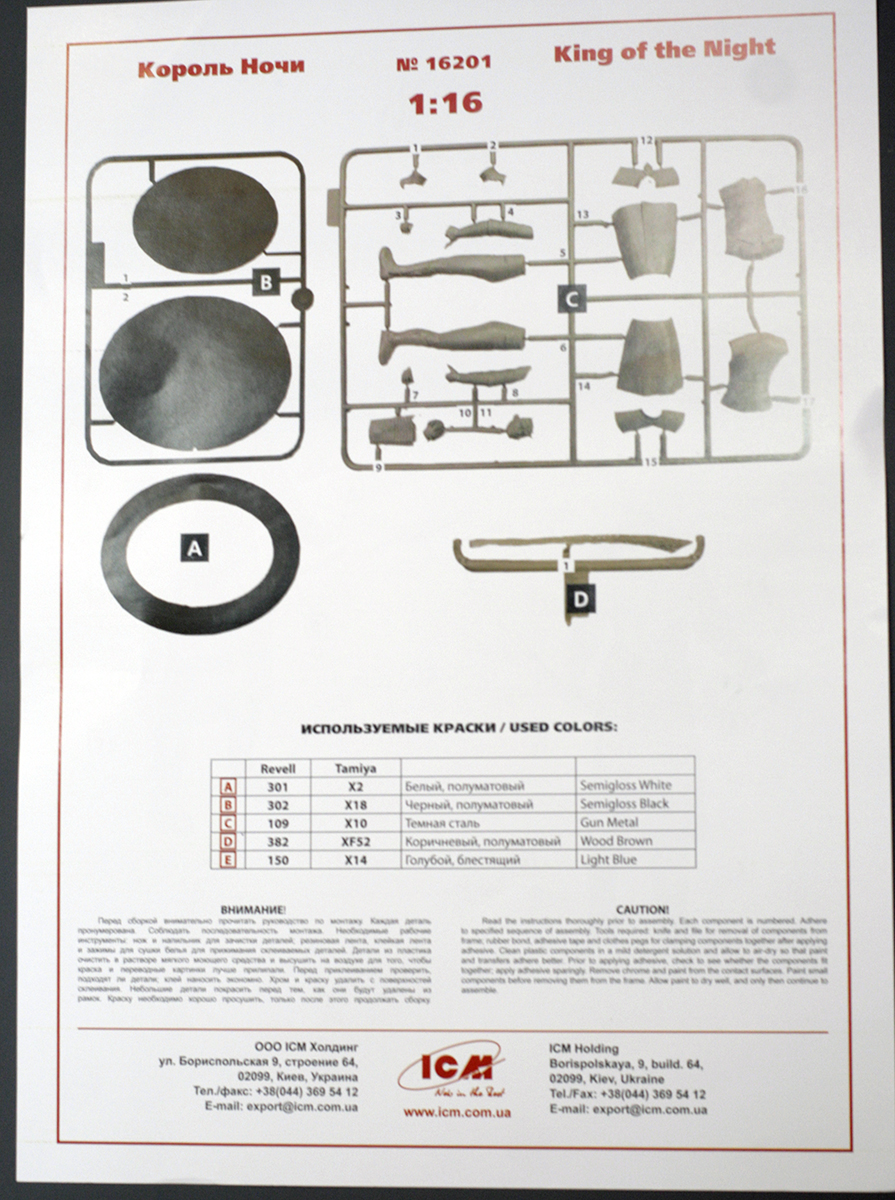 Инструкция простая (даже исторической справки нет, караул!), но понятная. Совмещает в себе схему окраски и сборки. Рекомендации цветам даны в палитре Revell и Tamiya, правда рекомендация красить кожу Короля в нежно-голубой X-14 от Тамии - довольно странное решение)