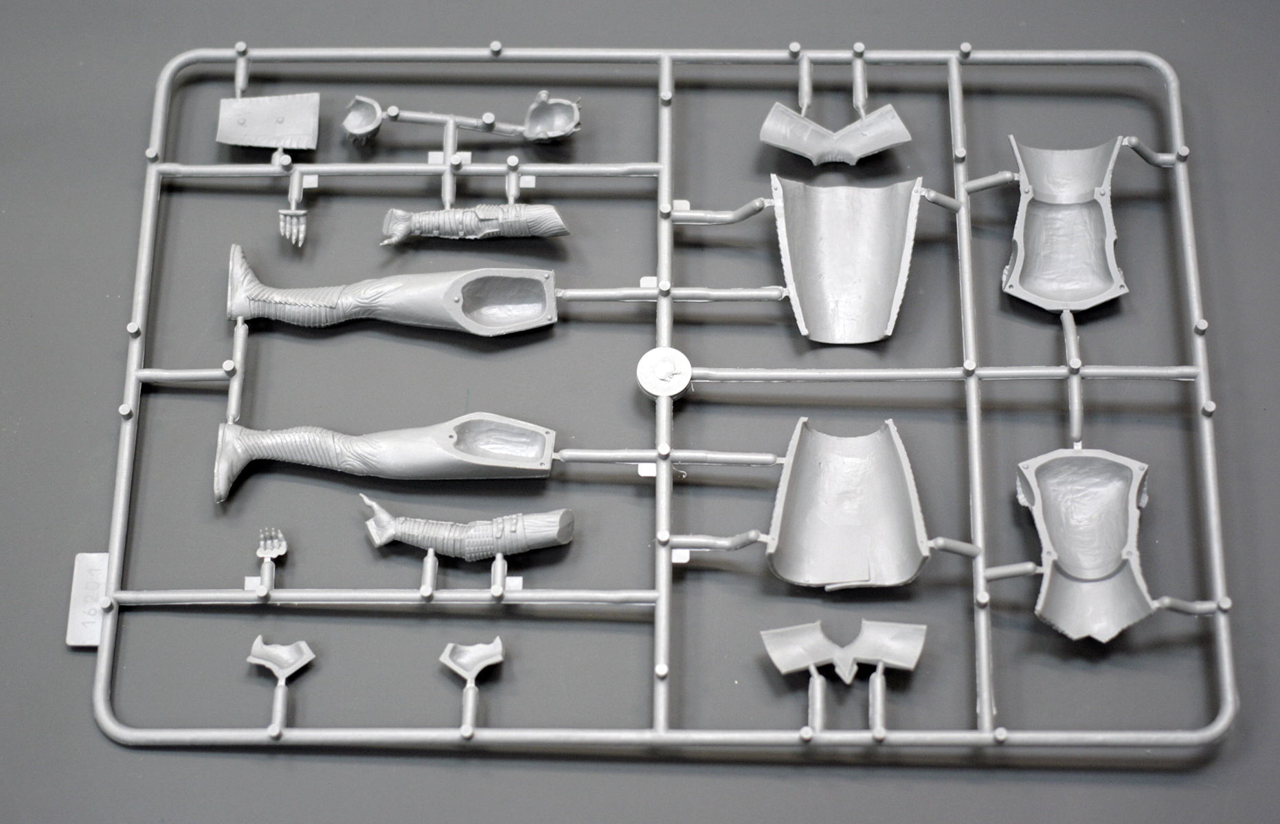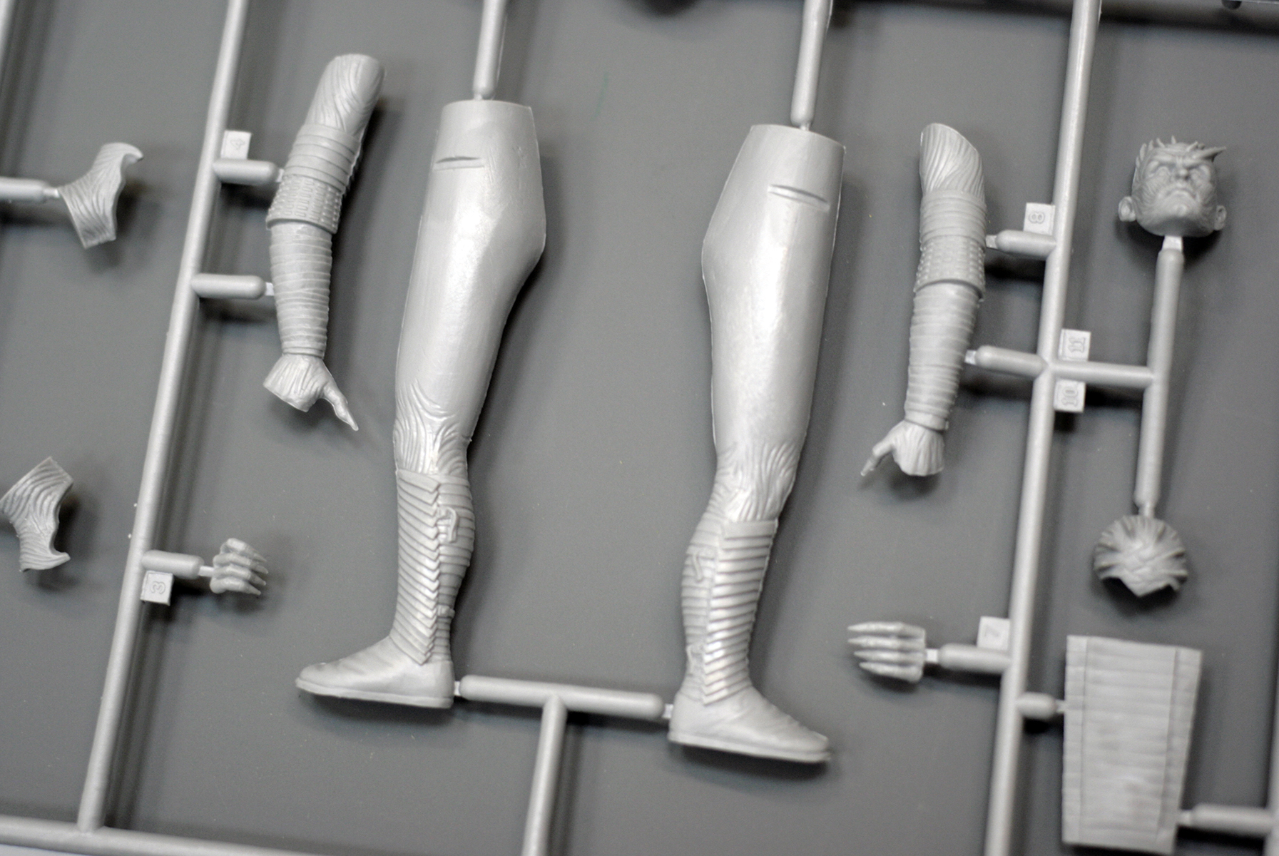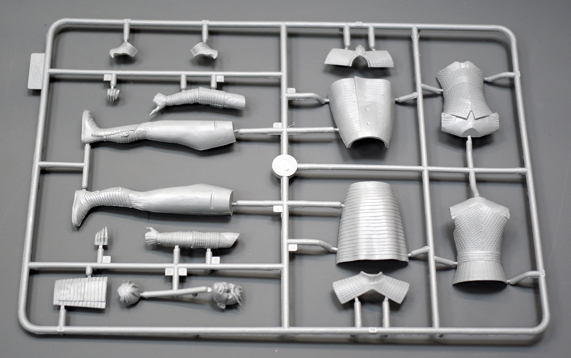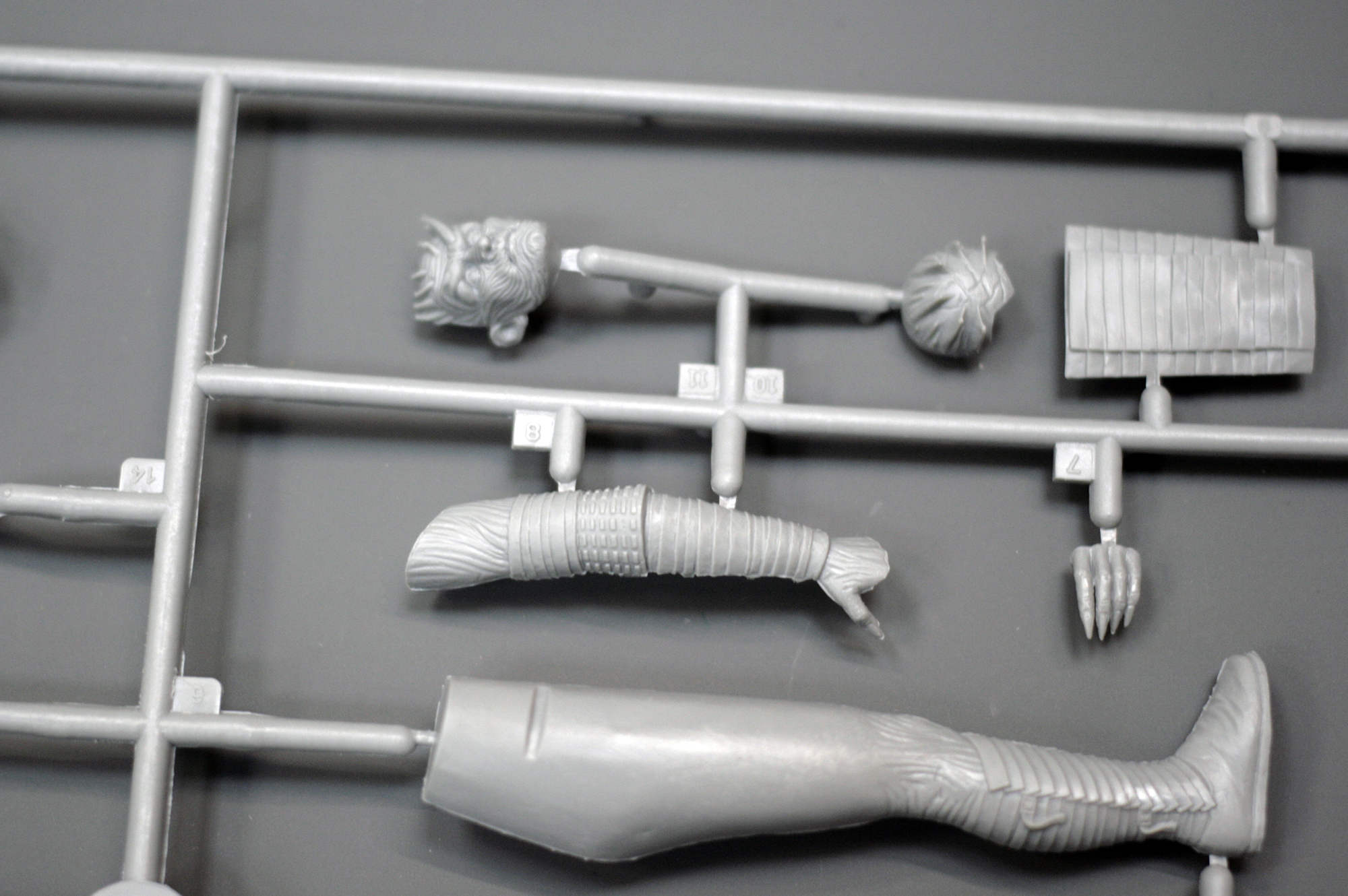 Основные детали фигуры уместились на одном литнике из серого пластика. Он привычен по другим наборам от ICM, мягок и хорошо обрабатывается. Вновь с наличии мелкий облой и заметные стыки пресс-форм на отливках.