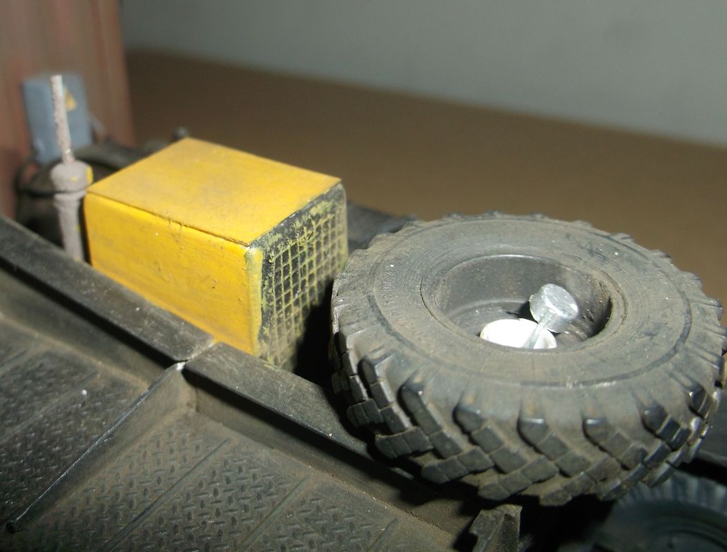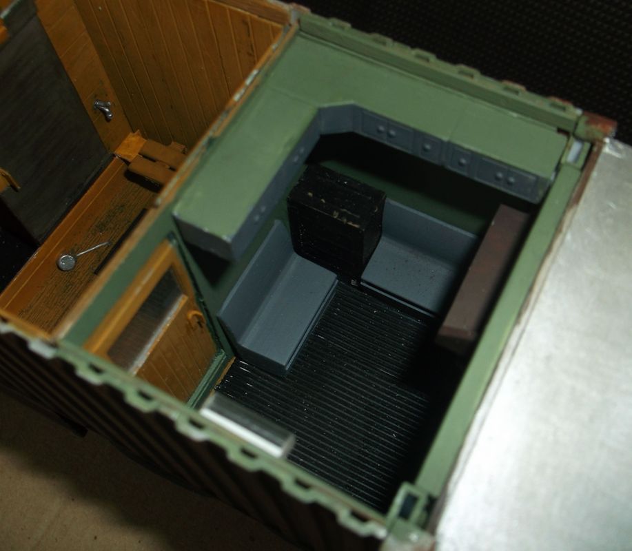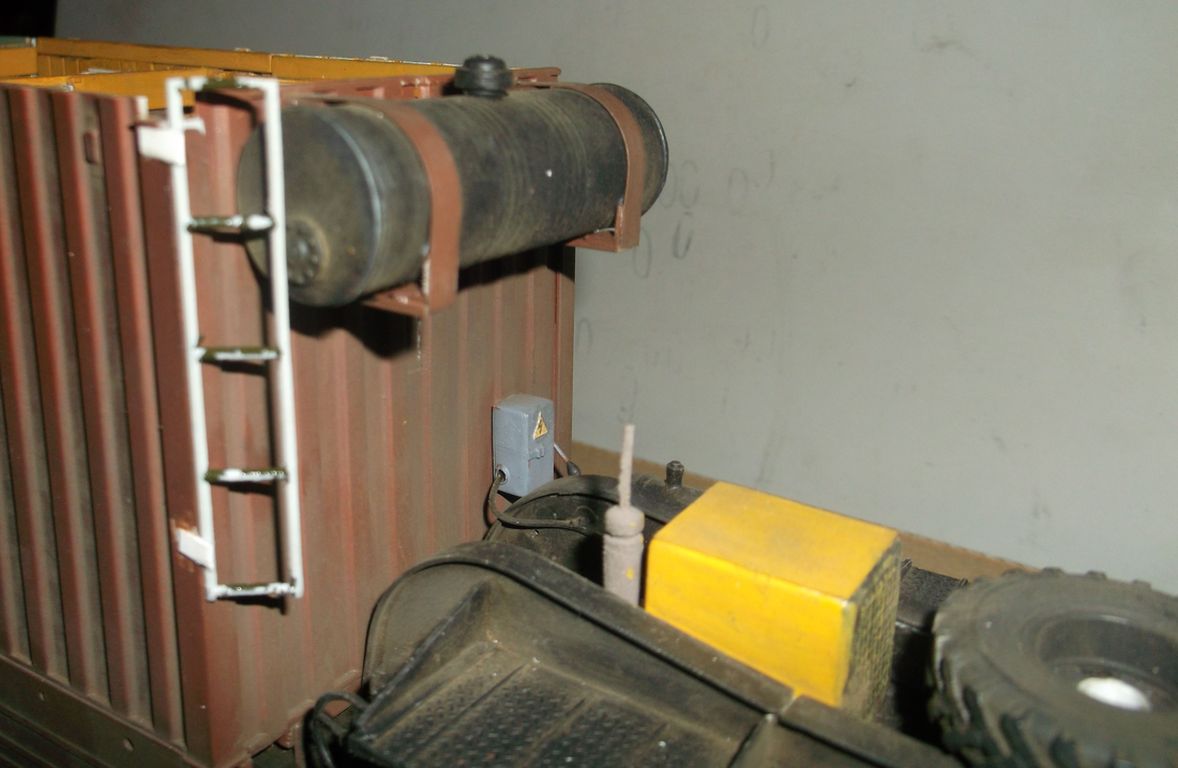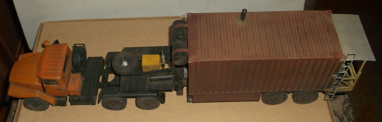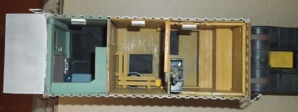 Теперь самое вкусное. Основой полуприцепа послужила рама от китайской игрушки-полуприцепа с приклееной к ней дышлом от дудкиного полуприцепа-танковоза. Игрушечный пластик оказался сильно фиговым и клеился только циакрином. На него водрузил италовский 20-ти футовый контейнер. Подвеска прицепа сделана и эвергриновских квадратных трубок, задних рессор италовского Бигфута и смоляных колёс Кастомфактори. Внутреннее убранство баньки подсмотрел в тырнете. Их реально делают на заказ в морских контейнерах. На обшивку "вагонкой" парилки и помывочной пошли борта от звездовского ЗиС-5. В печку-каменку положены реальные камешки (когда я их собирал и сортировал, мужики на работе смотрели на меня как на больного: с жалостью и сочувствием). Растапливается печурка с внешней стороны правого борта. Под полом баньки находятся ящики-углярки-дровянники. Крышка с правого борта фиксируется цепями и получается площадка для работы кочегара.Перед контейнером установлен генератор для дополнительного подогрева и сушки полов, вентиляции и освещения. Так что баня полностью автономна.