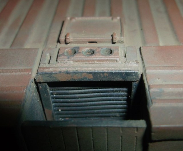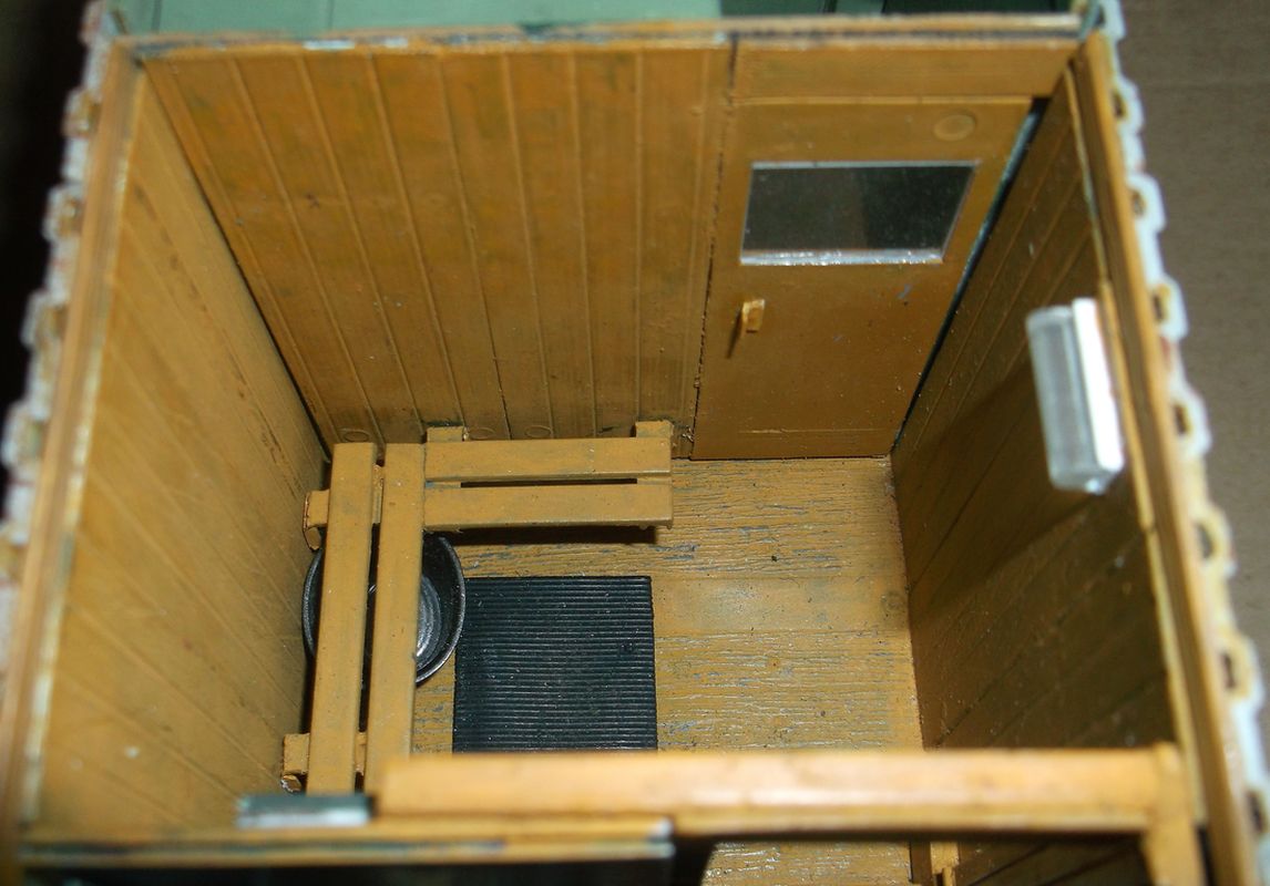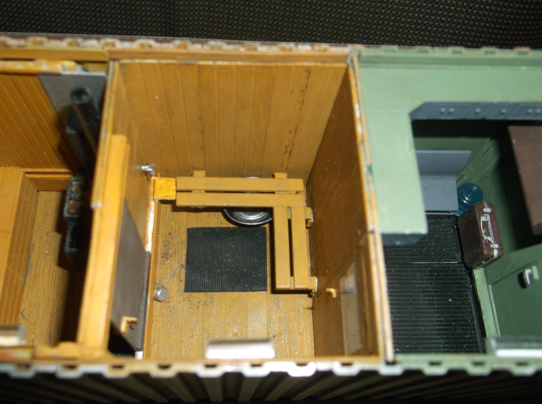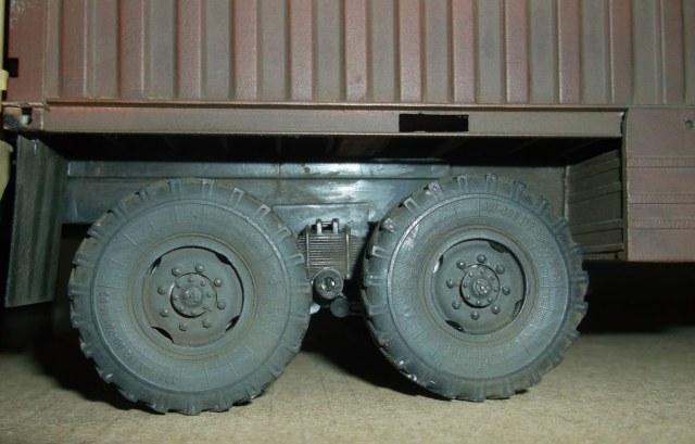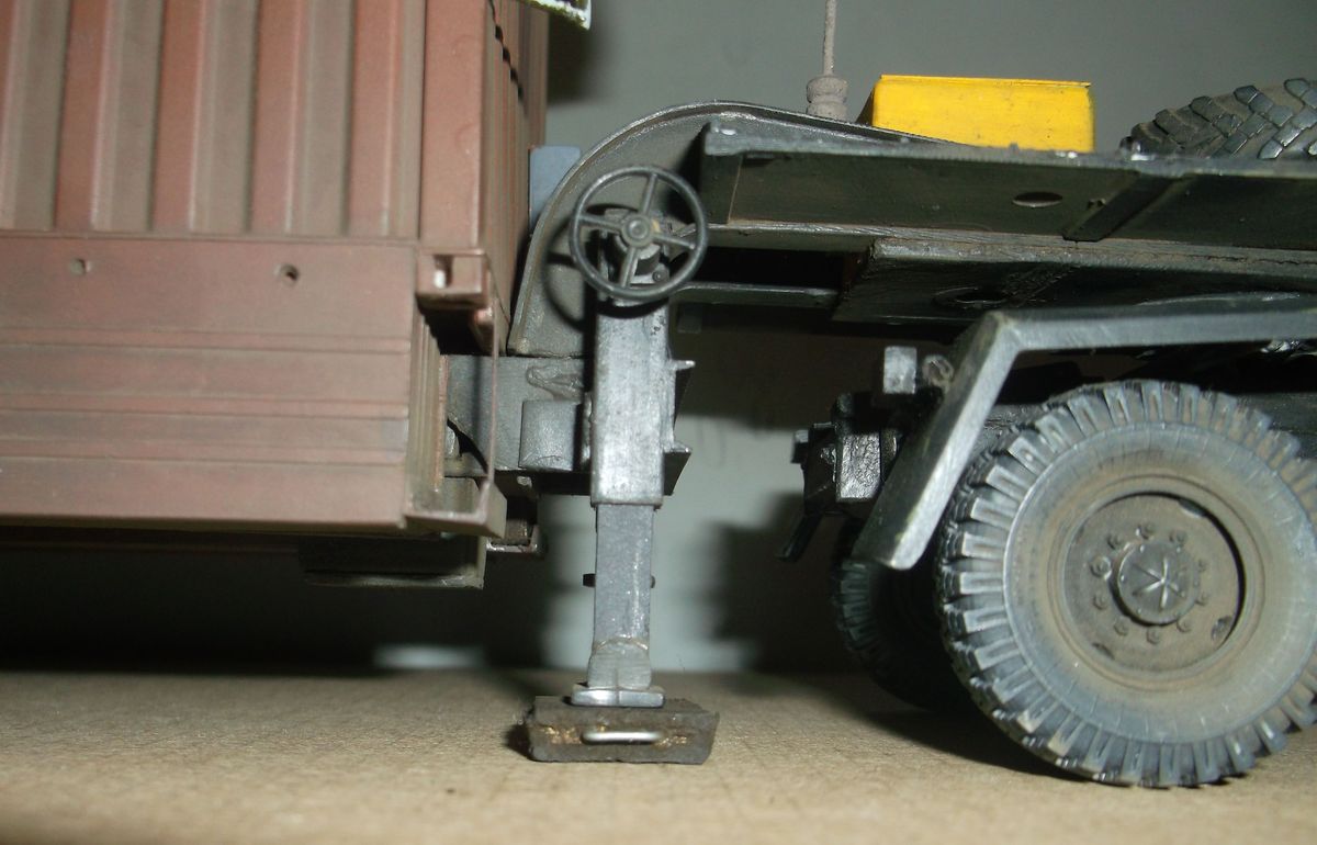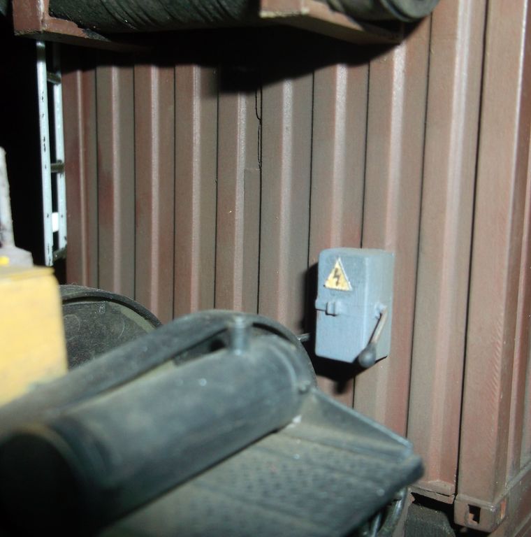 Теперь самое вкусное. Основой полуприцепа послужила рама от китайской игрушки-полуприцепа с приклееной к ней дышлом от дудкиного полуприцепа-танковоза. Игрушечный пластик оказался сильно фиговым и клеился только циакрином. На него водрузил италовский 20-ти футовый контейнер. Подвеска прицепа сделана и эвергриновских квадратных трубок, задних рессор италовского Бигфута и смоляных колёс Кастомфактори. Внутреннее убранство баньки подсмотрел в тырнете. Их реально делают на заказ в морских контейнерах. На обшивку "вагонкой" парилки и помывочной пошли борта от звездовского ЗиС-5. В печку-каменку положены реальные камешки (когда я их собирал и сортировал, мужики на работе смотрели на меня как на больного: с жалостью и сочувствием). Растапливается печурка с внешней стороны правого борта. Под полом баньки находятся ящики-углярки-дровянники. Крышка с правого борта фиксируется цепями и получается площадка для работы кочегара.Перед контейнером установлен генератор для дополнительного подогрева и сушки полов, вентиляции и освещения. Так что баня полностью автономна.