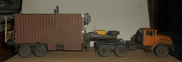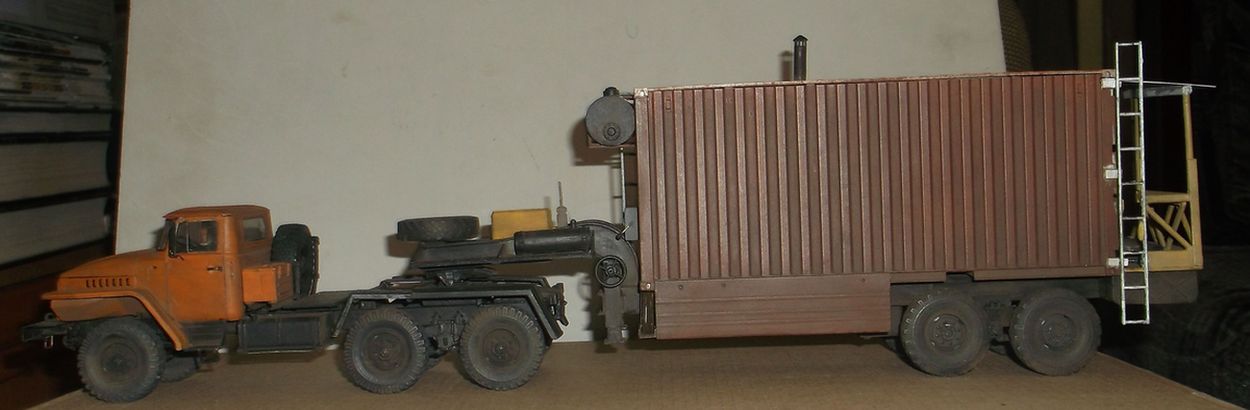 Тягач УРАЛ-375Д с дизелем ЯМЗ-236 и полуприцепом баней в 20-ти футовом контейнере.