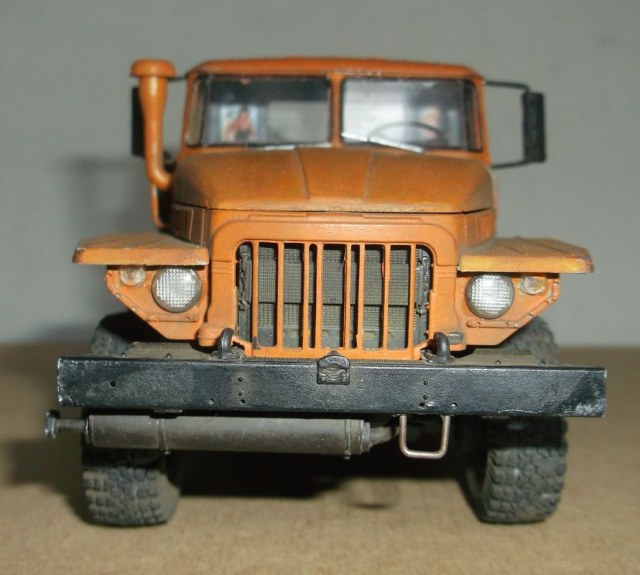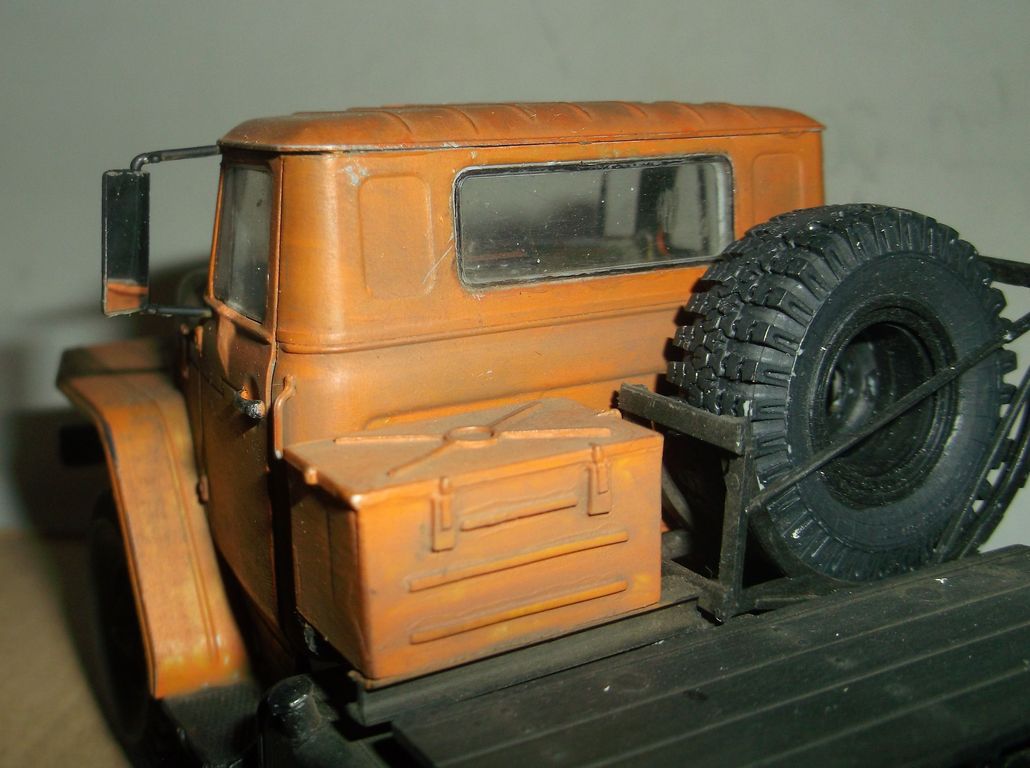 В дело пошла сборная солянка УРАЛ от ICM + TRUMPETER. Заменил подвеску и ходовую на айсиэмовскую, выкинул пародию на движок и воткнул смоляной ЯМЗ-236 от CUSTOMFACTORY. Чтобы он встал нормально, пришлось пилить поддон двигла. И всё равно он стоит немного выше, чем на реальной машине. Поставил миниармовскую "Наташку". Без матерков не обошлось. Сами колёса шикарнейшие, но все шесть ОДИНАКОВЫЕ!!! А передние должны быть другие. Там ведь стоят поворотные кулаки. Этим чудотворцам лень было наклониться и посмотреть?! Едем дальше. Укоротил сзади раму. Поставил рабочее седло от Кастомфактори.