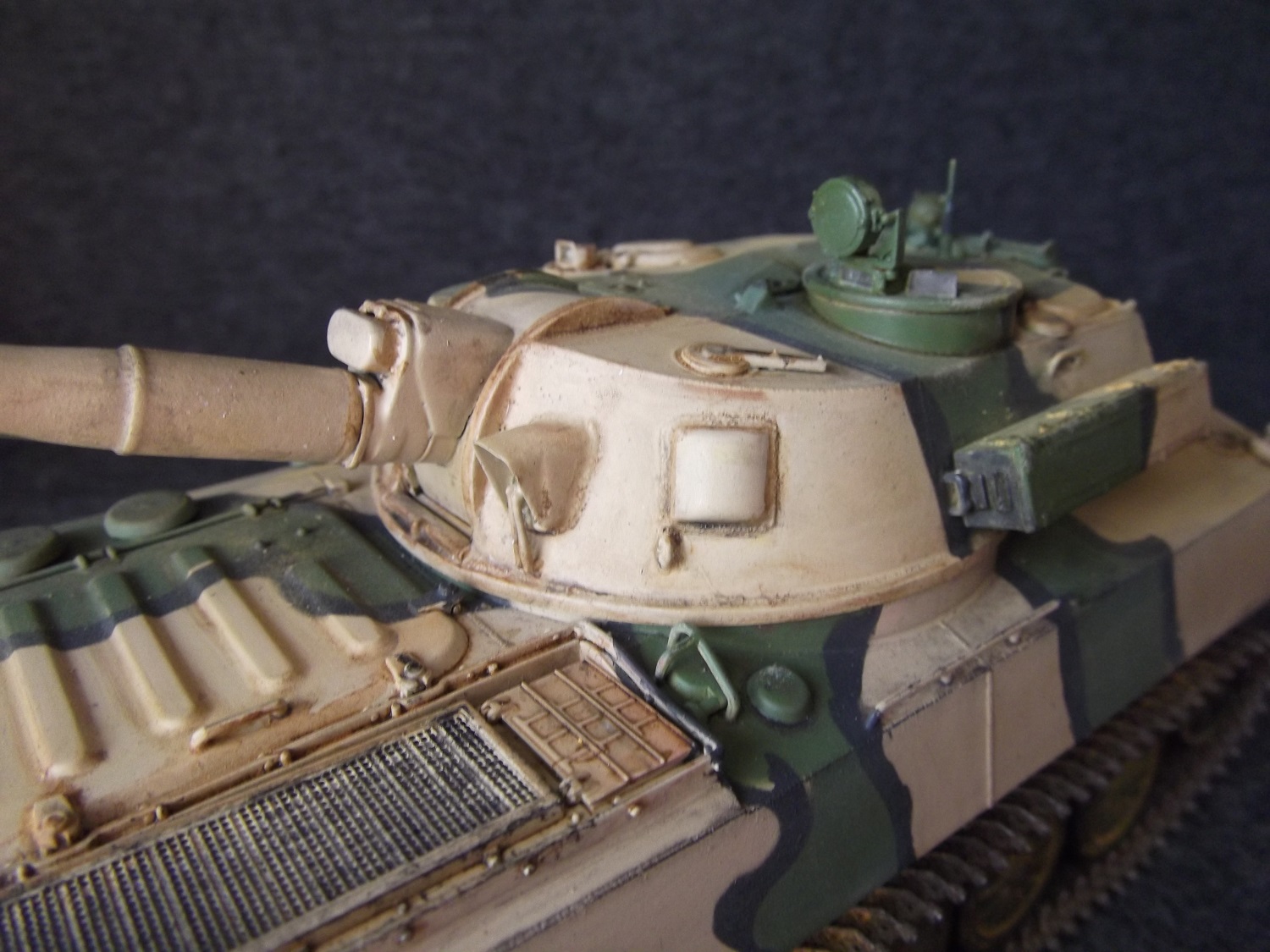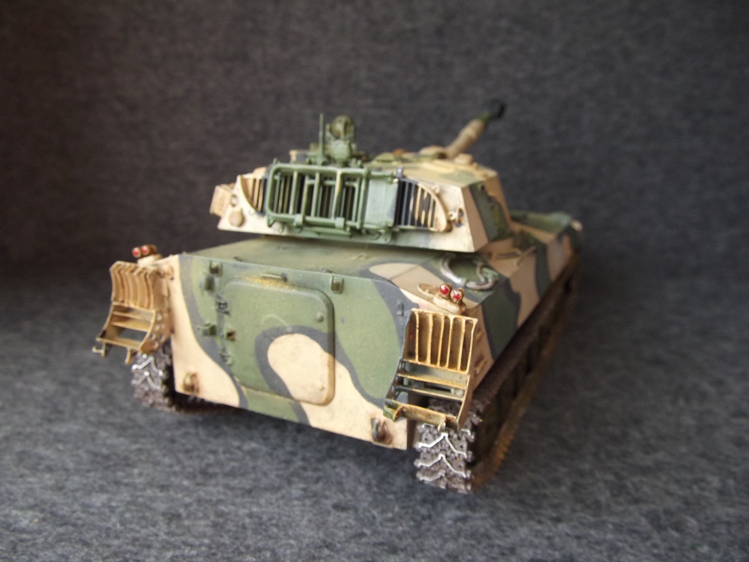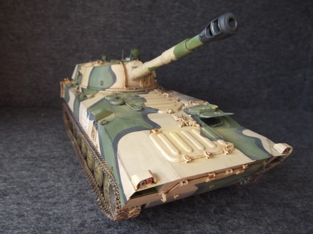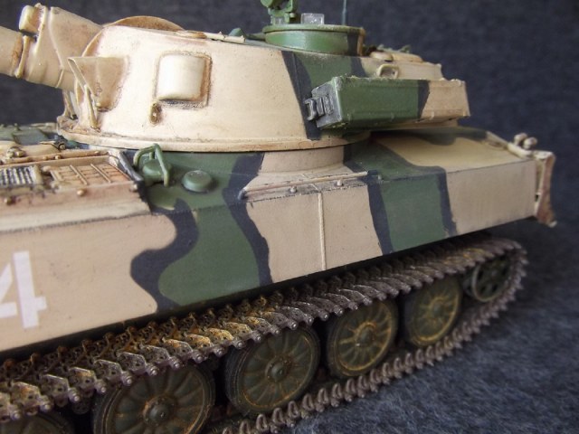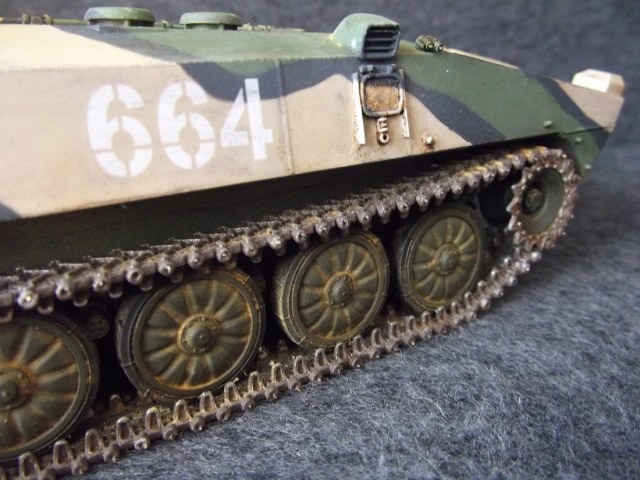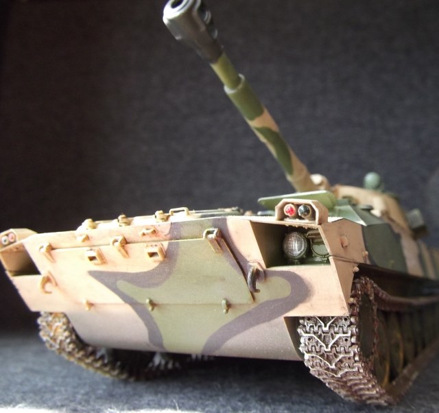 Cобиралась немного дольше обычного из- за большого количества мелких деталей. Использовал 2 платы травления. Не удалось приобрести ствол, пришлось долго и нудно бороться со швами. В первый раз окрашивал модель в комуфляже. С травления изготовлены грязевые щитки. Заменены фары и гусеницы.