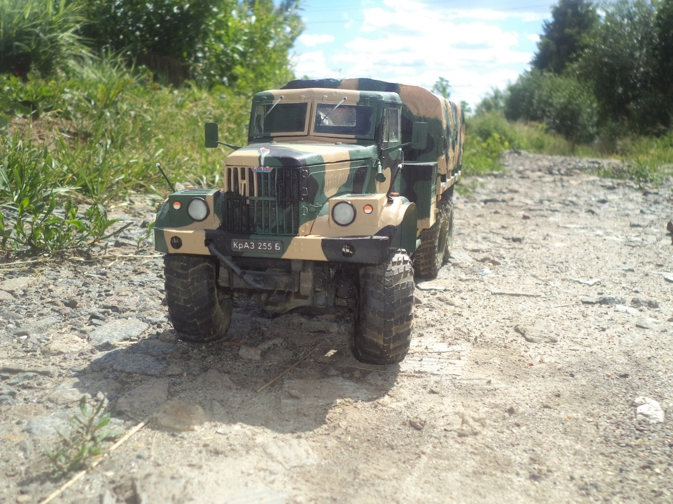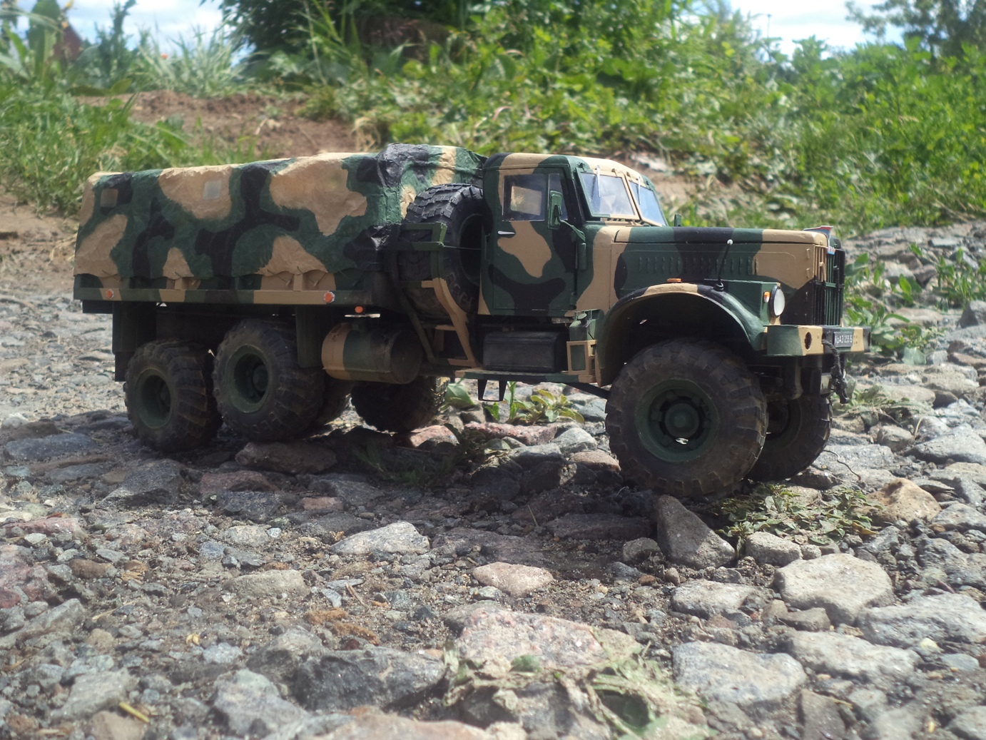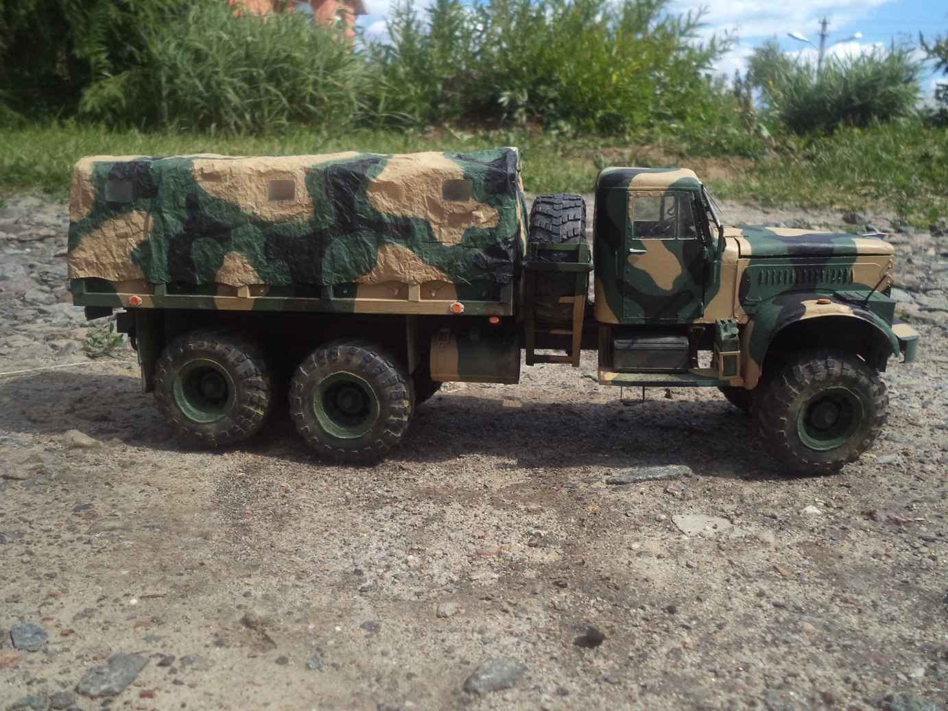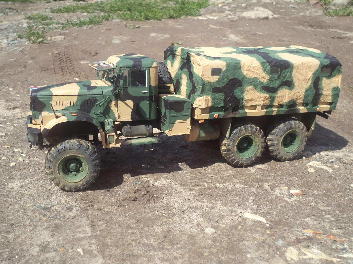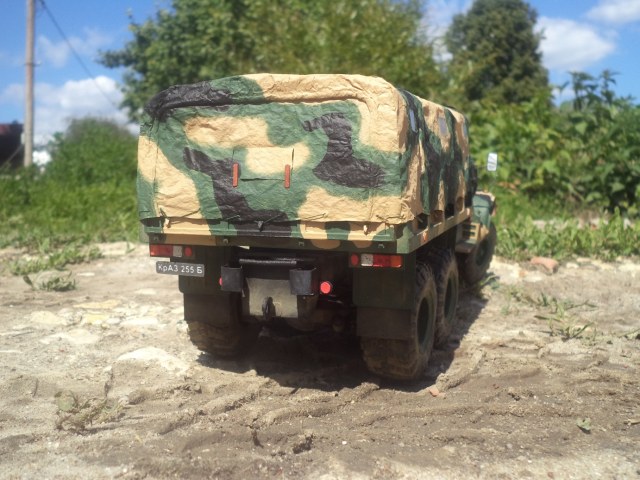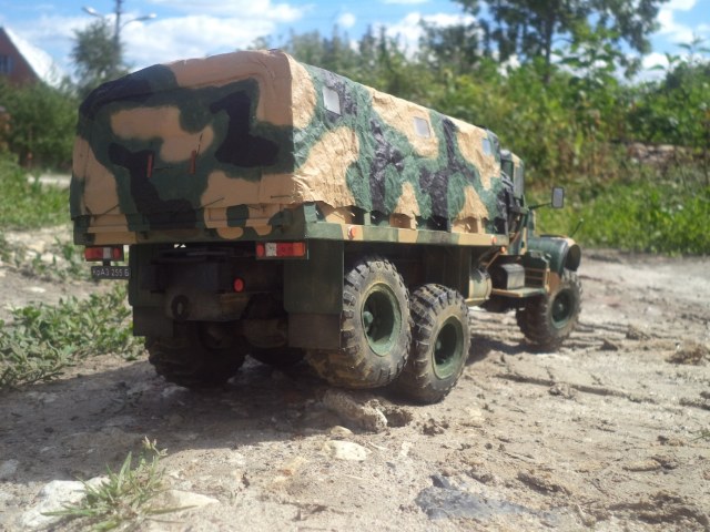 Доброго дня! Модель от Renova в масштабе 1/25 полностью из бумаги. На работу ушло в общей сложности год, а завершена в 2014-м. В качестве материалов использовал бумагу для черчения, картон разной толщины, проволоку, прозрачный пластик и оргстекло для остекления и оптики. Тент самодельный из обувной бумаги. Камуфляжная схема взята из головы, окраска кистью акрилами Звезда, пигменты Мастер Пигмент. У модели открываются двери, капот, поднимаются ветровые окна, поворачиваются передние колеса, а также рабочая задняя подвеска. Работа над моделью принесла много положительных эмоций, понравилась проработка и детализация узлов автомобиля от Renova Model, кроме того, есть что добавить от себя, тем самым придав модели большей натуральности.