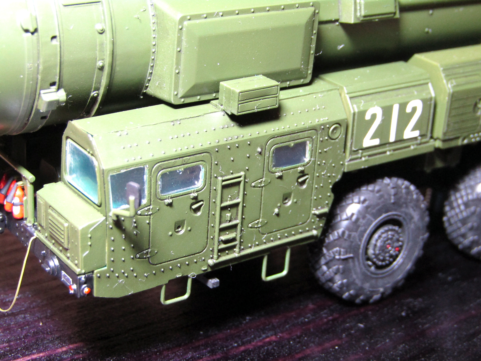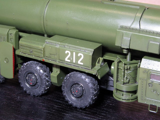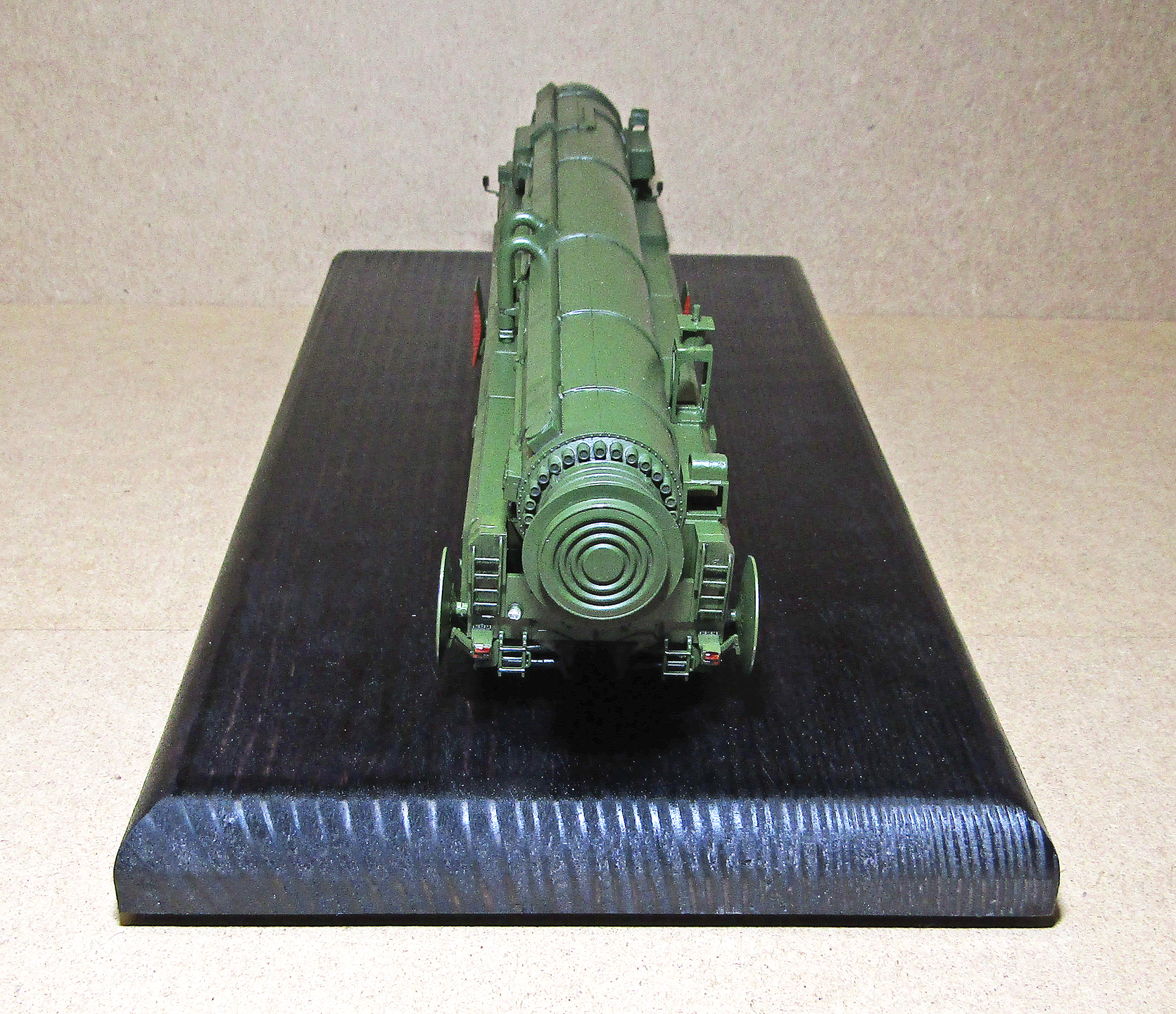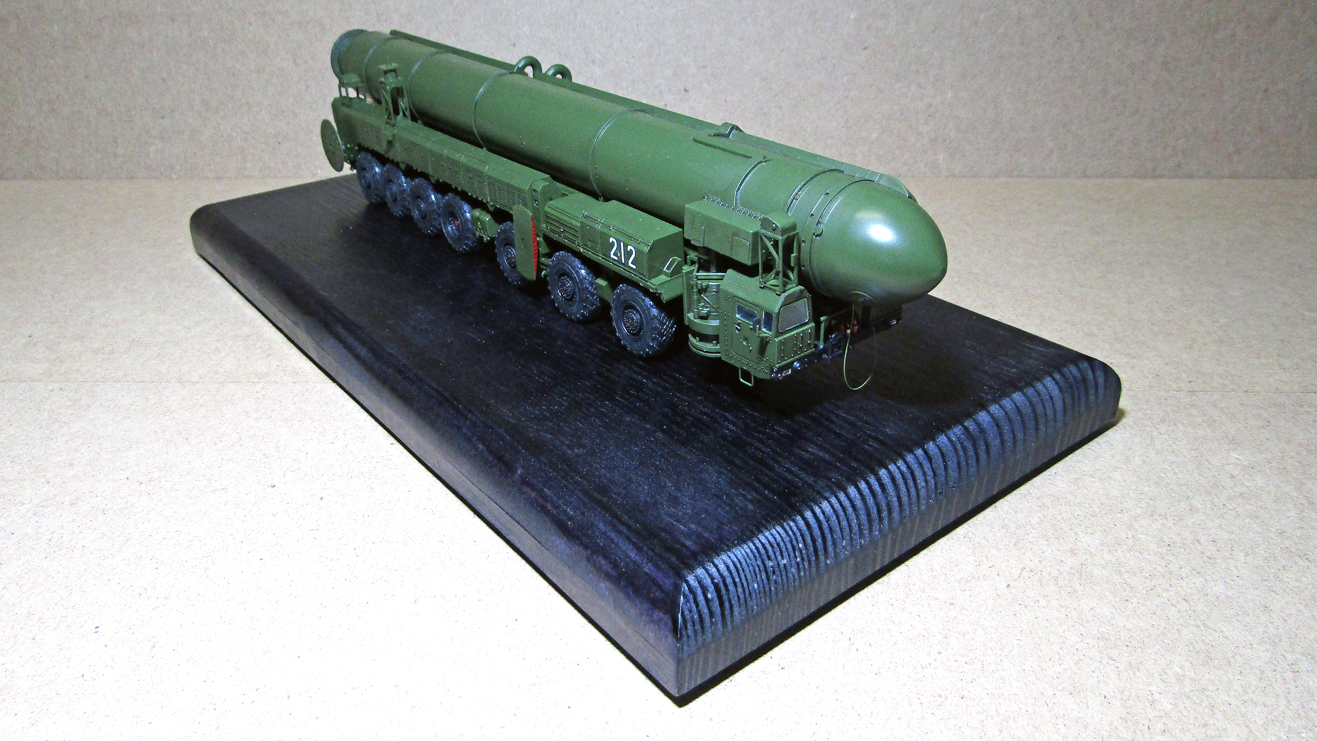 Здравствуйте коллеги, представляю на Ваш суд свою вторую попытку сборки данной модели. Так как заказчик пожелал увидеть нечто похожее на предыдущий вариант, исполнение соответственно также сувенирное. На этот раз красил аэрографом: база - акриловый 4БО от pacific 88, глянцевый лак от той-же фирмы, смывка - MIG. Дополнений мало - зеркала и фары из зеркальной бумаги, тросик на крышку герметизированного транспортно-пускового контейнера из тянутого литника, номер из моих запасов декалей. Убирать облой на резиновых колёсах не стал - просто не знаю чем его можно убрать. Конечно, если запастись большим терпением и срезать всё лезвием, в моём случае, я смог бы это сделать и за неделю, но в связи с сжатыми сроками делать этого не стал. Деревянную подставку заказывал (панно для декорирования), которую я решил затонировал эбеновой морилкой, просверлил отверстия и закрепил модель двумя болтами с шайбами и гайками. Была запланирована ещё латунная табличка с названием модели, но к сожалению полиграфическая мастерская подвела и модель уехала без неё. Приятного просмотра...