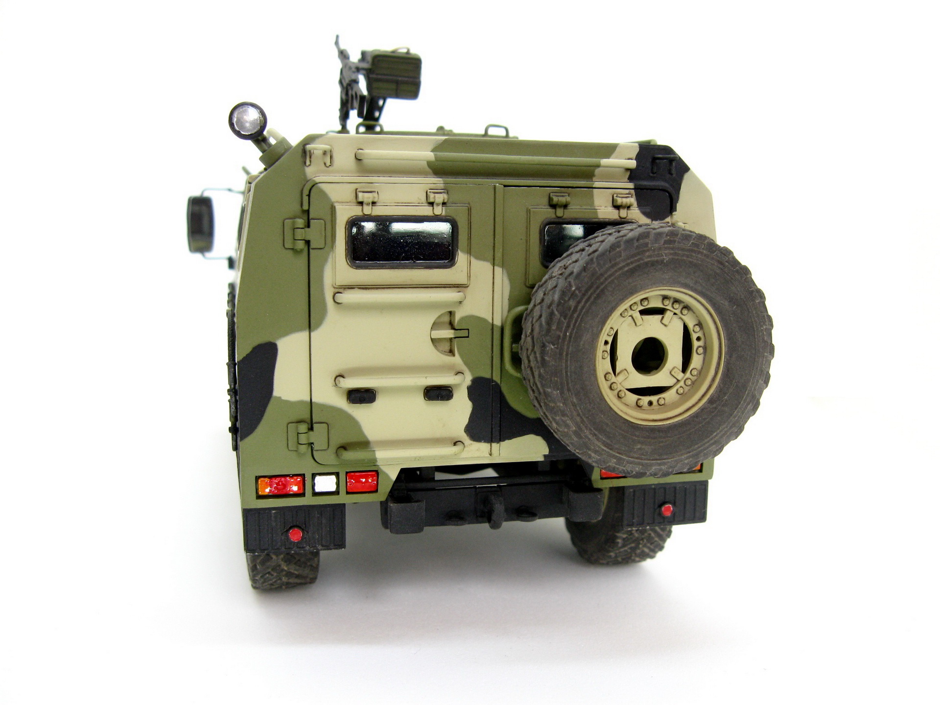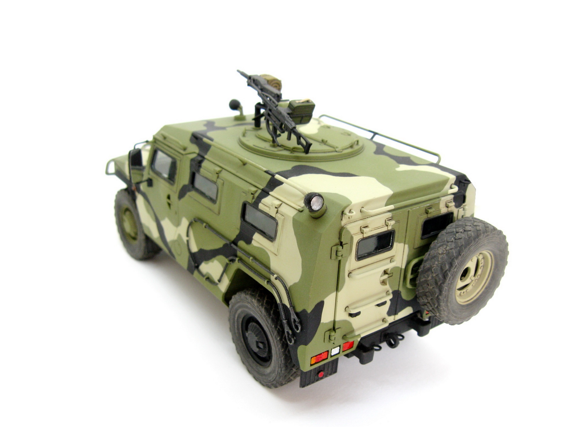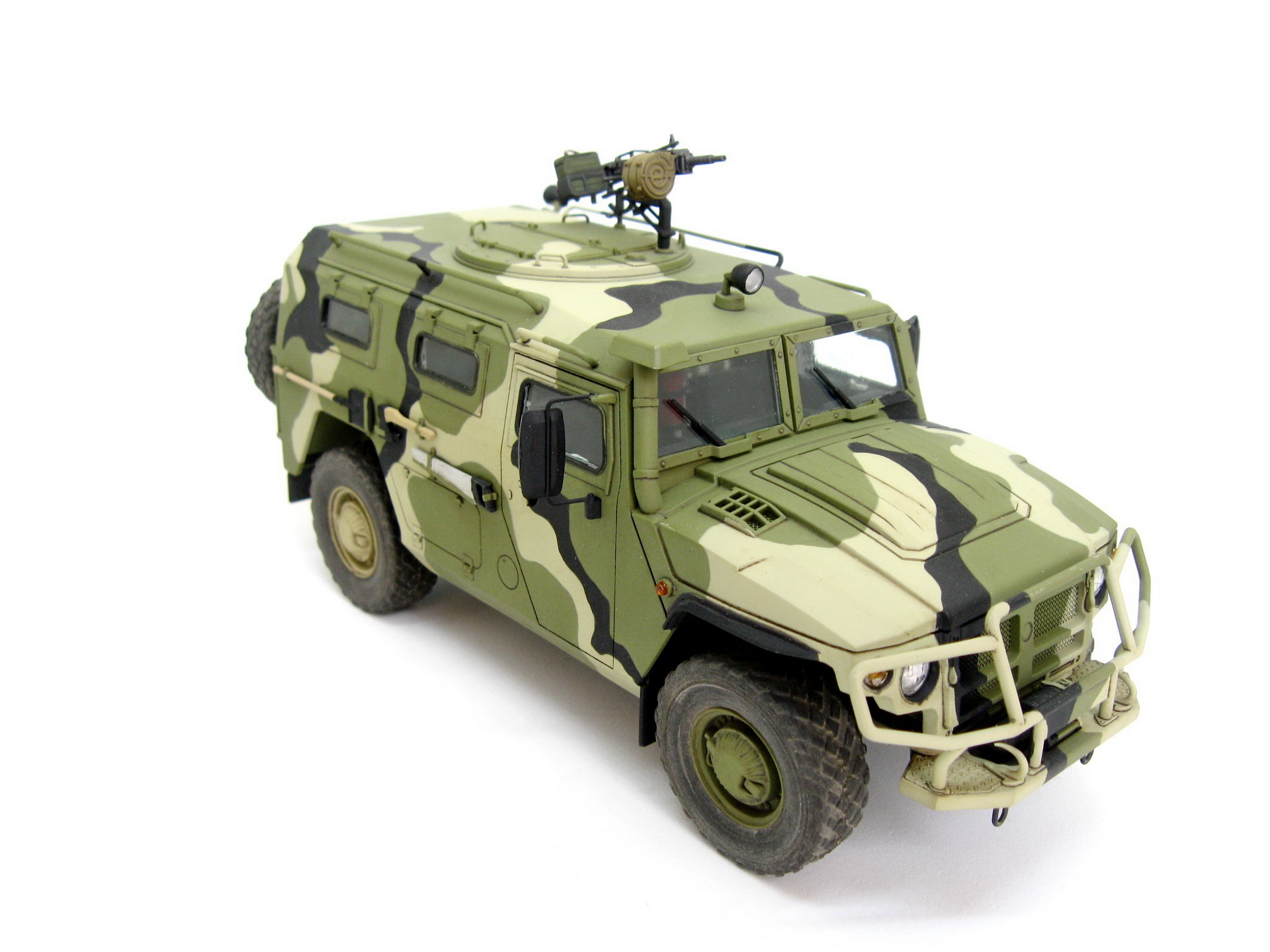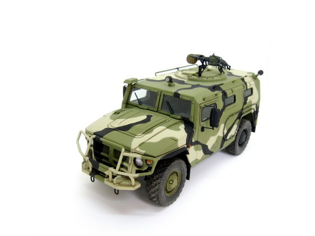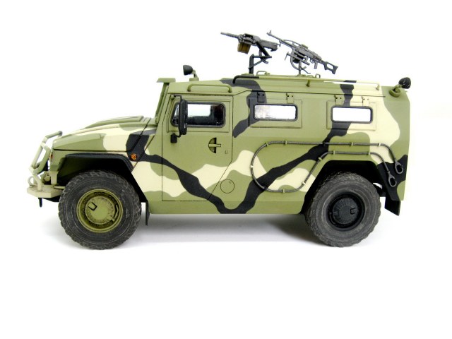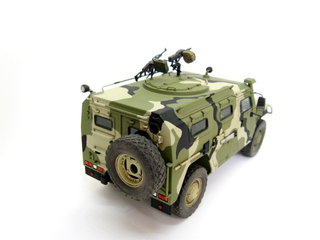 Здравствуйте. Представляю вашему вниманию модель Российского бронеавтомобиля Газ-233014 Тигр от компании Звезда. Сборка изкоробочная, никаких проблем в работе не возникло, сделал рабочими крепление запаски и задние двери. Немного накосячил со стёклами, хотел сделать зелёный оттенок, боялся перебрать с ним в итоге недобрал. Окраска акрилом аммо миг, тамии и ганзы, камуфляж делал с помощь масок из блютака.