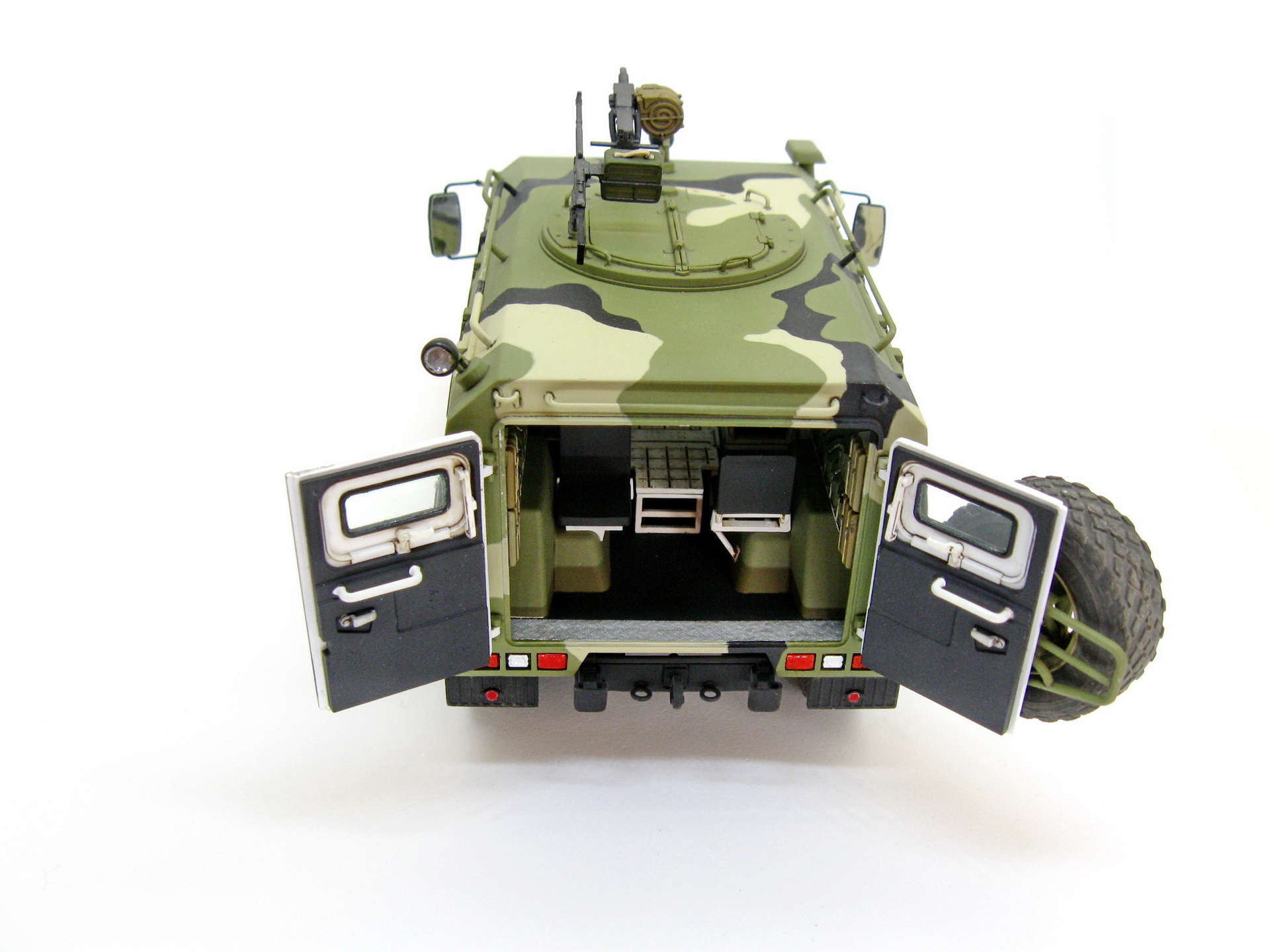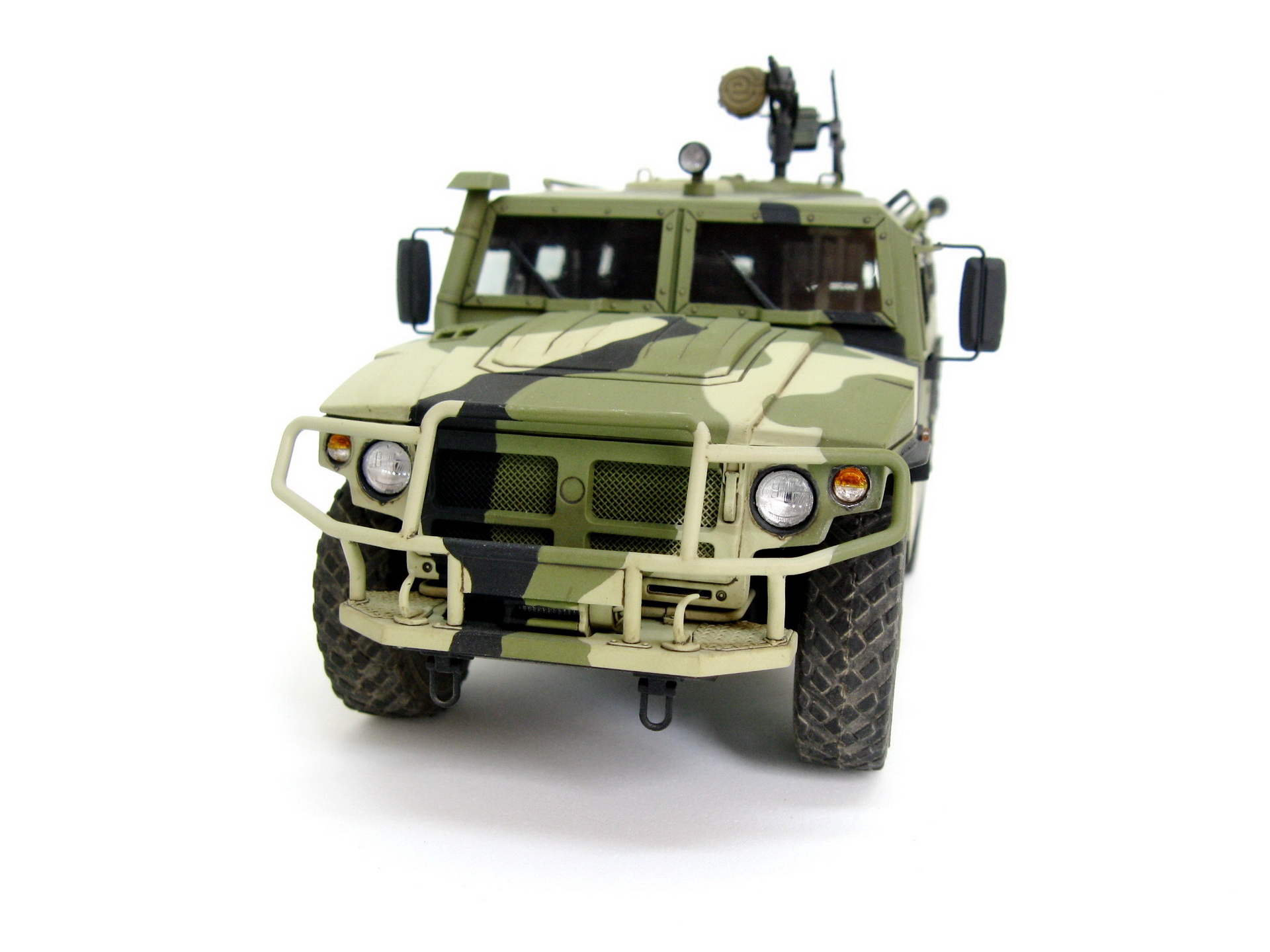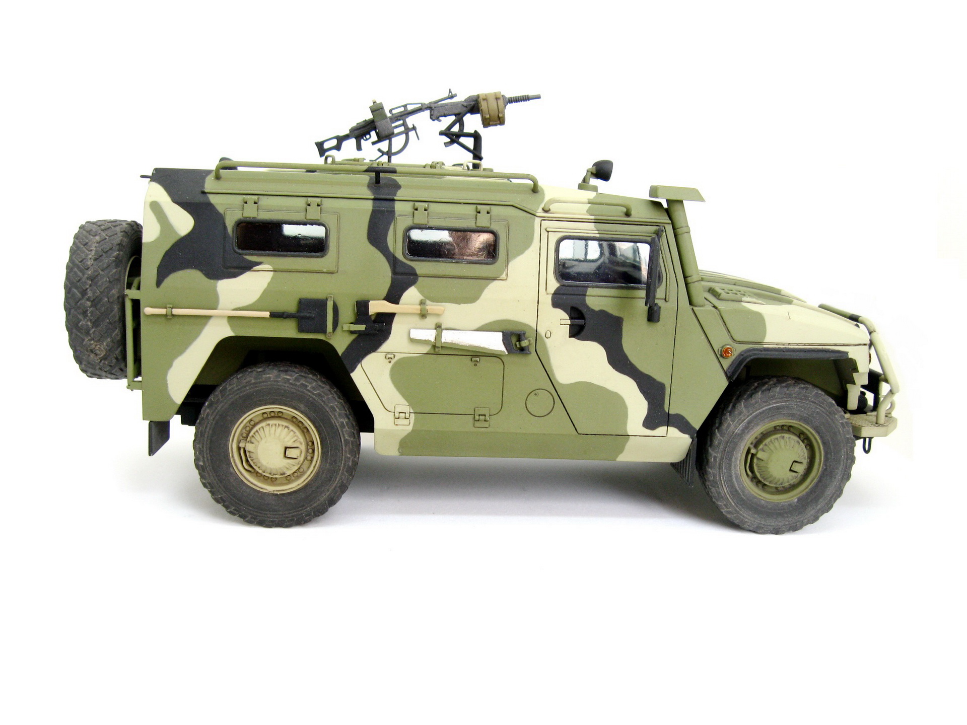 Здравствуйте. Представляю вашему вниманию модель Российского бронеавтомобиля Газ-233014 Тигр от компании Звезда. Сборка изкоробочная, никаких проблем в работе не возникло, сделал рабочими крепление запаски и задние двери. Немного накосячил со стёклами, хотел сделать зелёный оттенок, боялся перебрать с ним в итоге недобрал. Окраска акрилом аммо миг, тамии и ганзы, камуфляж делал с помощь масок из блютака.