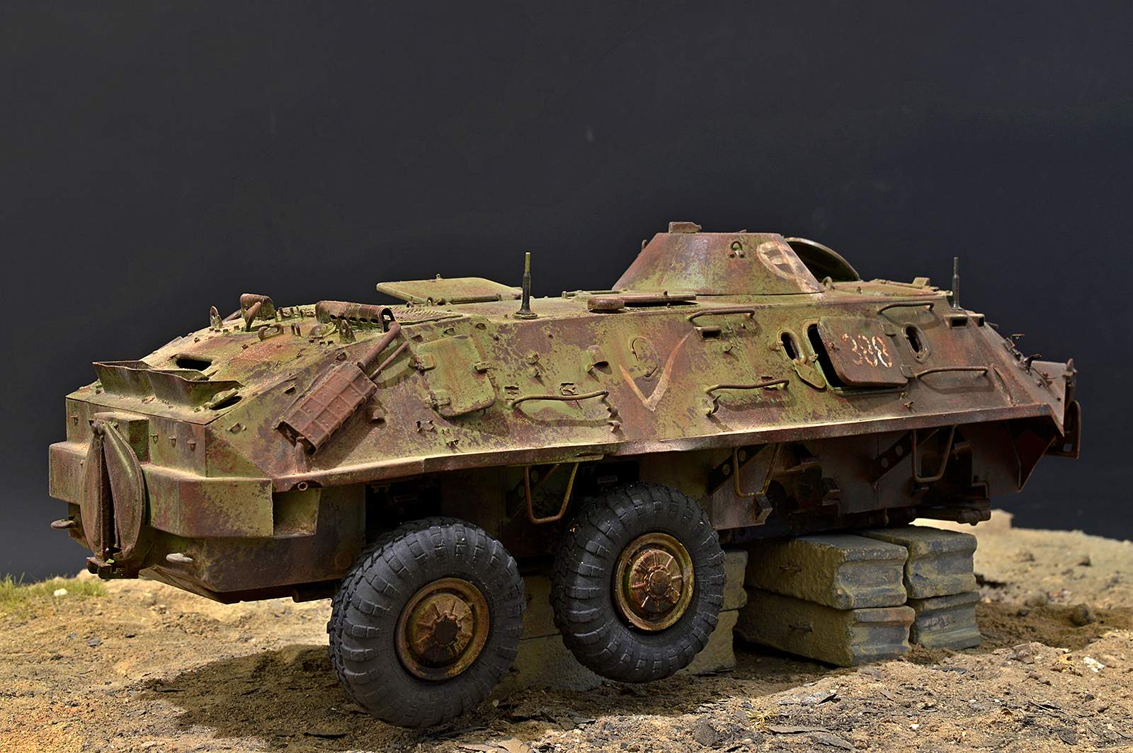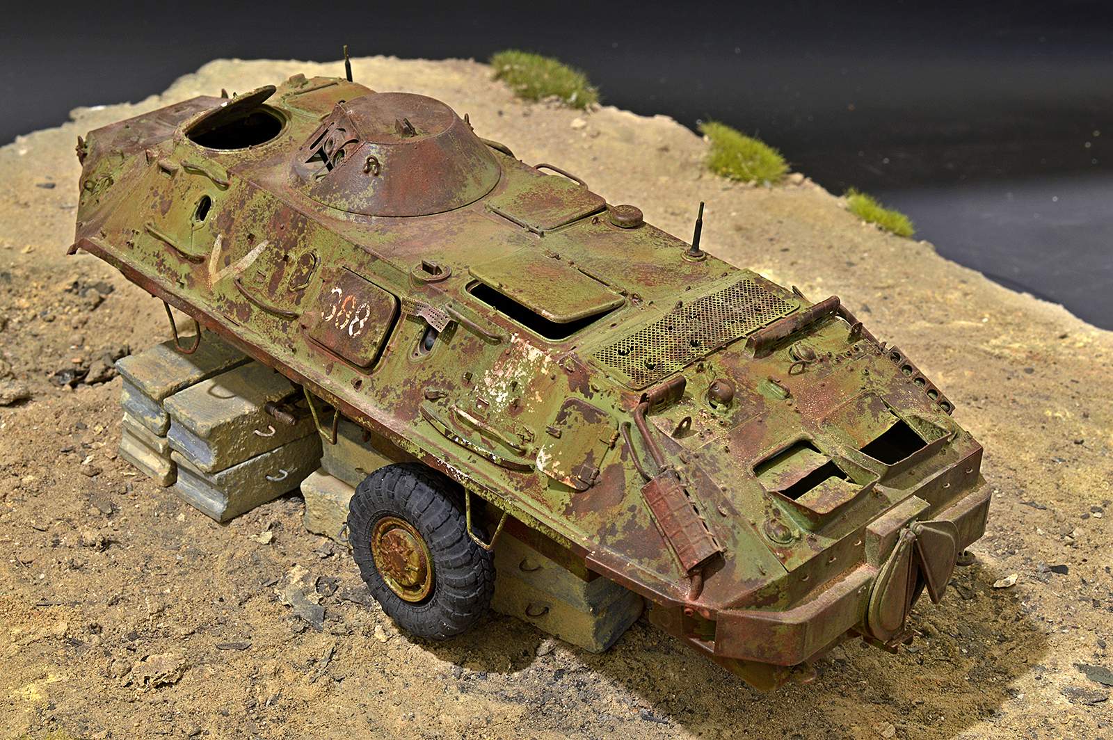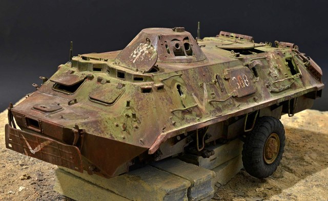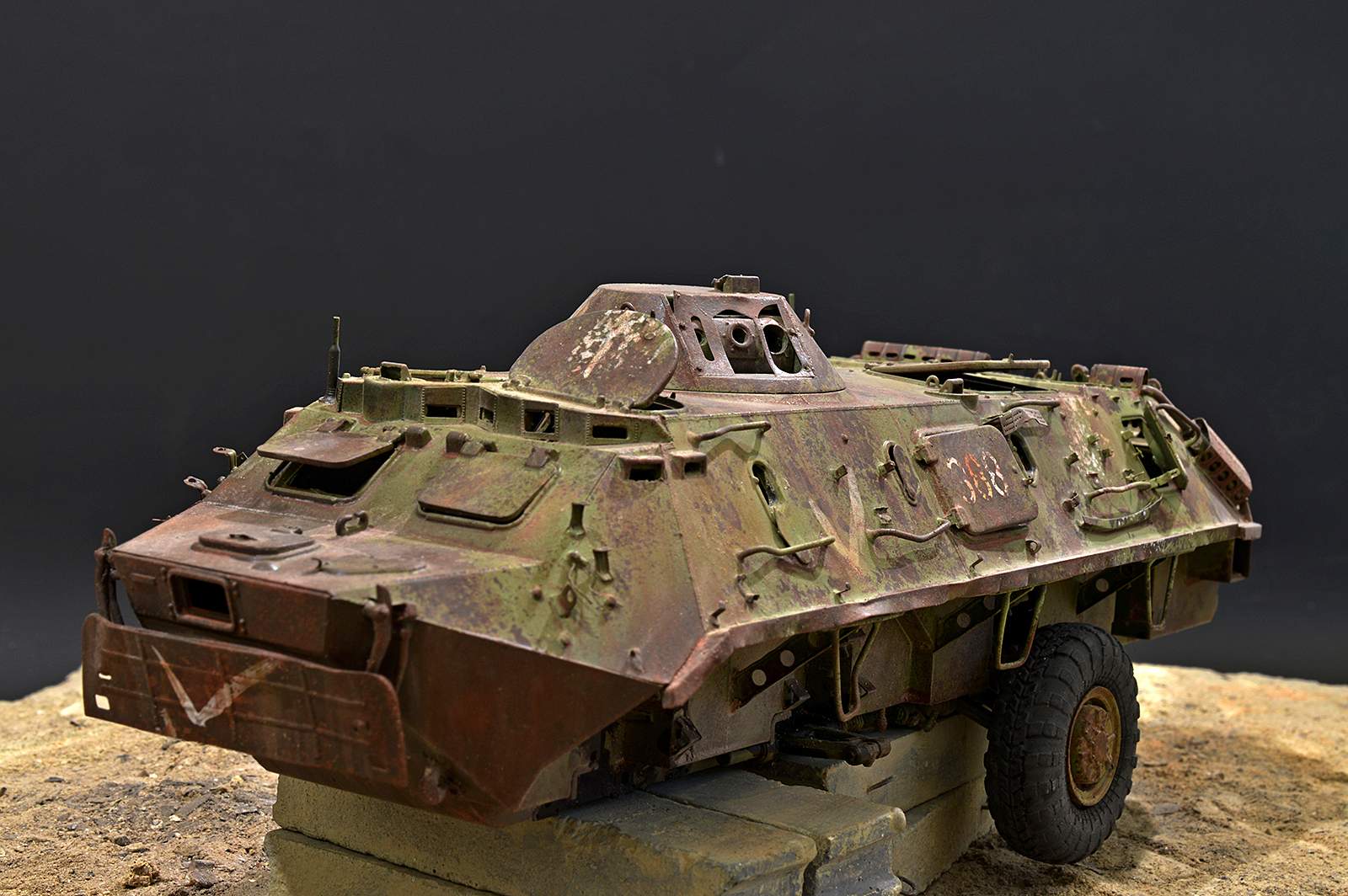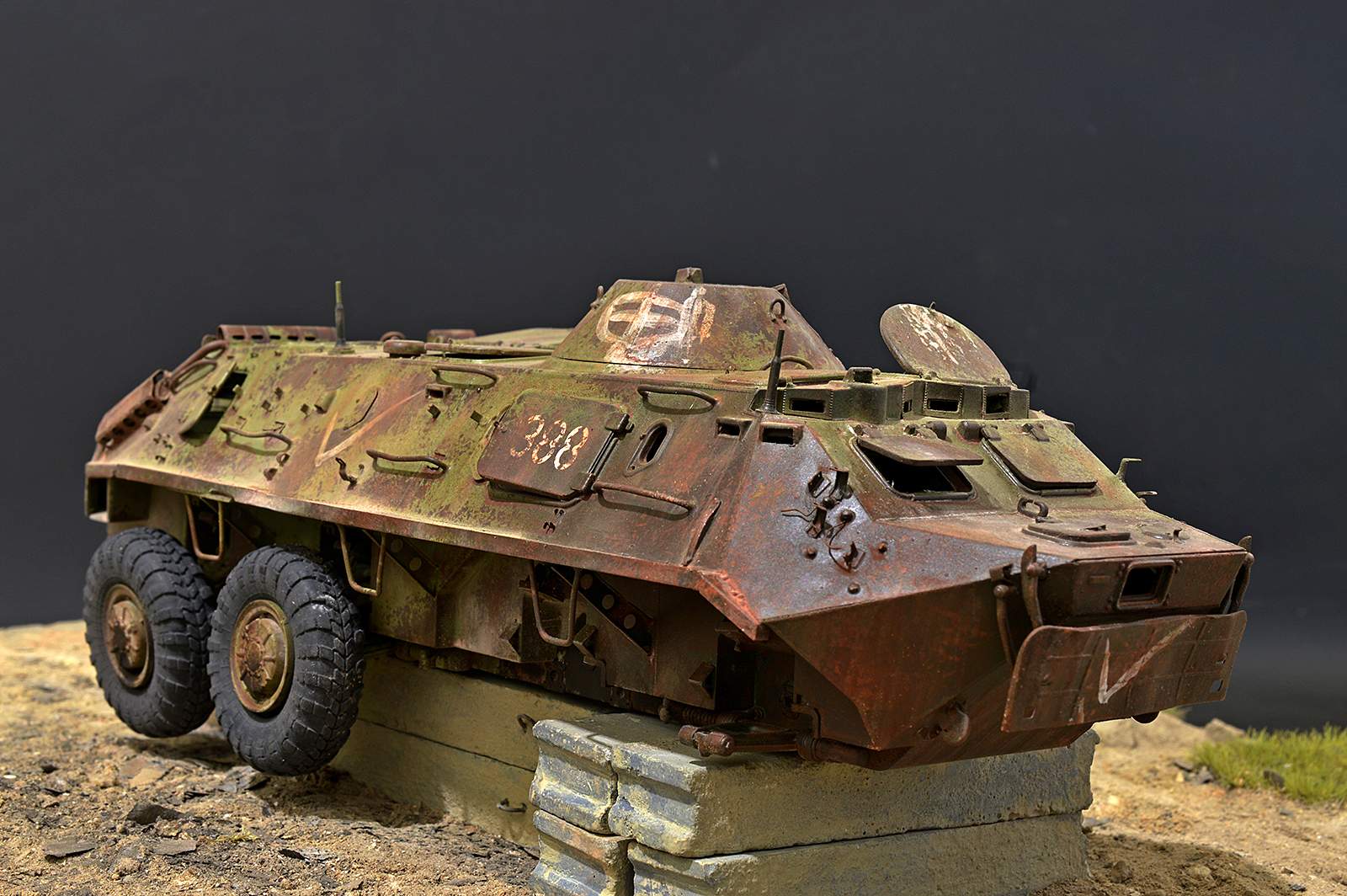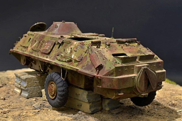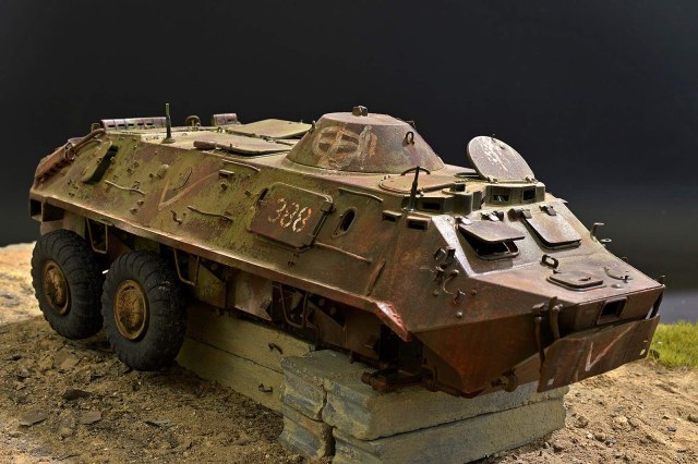Представляю вашему вниманию бронетранспортёр БТР-60 от Trumpeter в таком необычном металлоломо-состоянии. Постамент, конечно же, временный, опору ему найду в дальнейшей разработке, но пока вот так вот. Так что данную работу не воспринимайте, как виньетку. Да и подставку использовал как всегда дежурную…