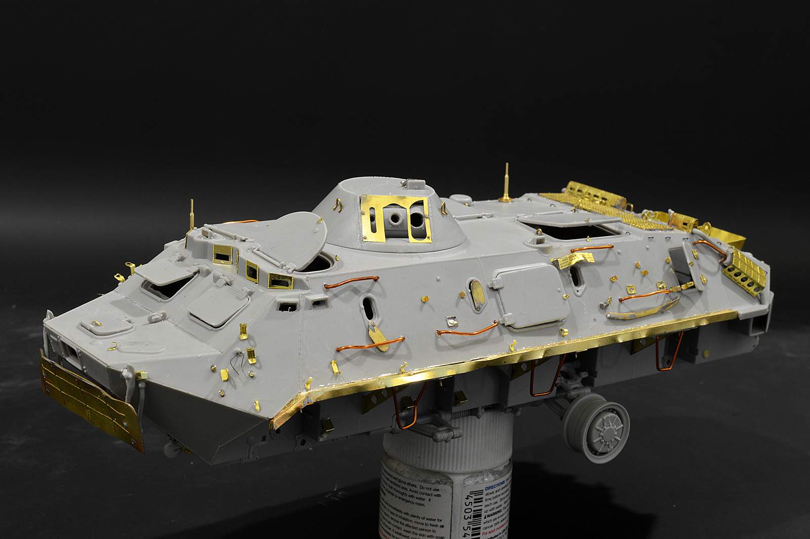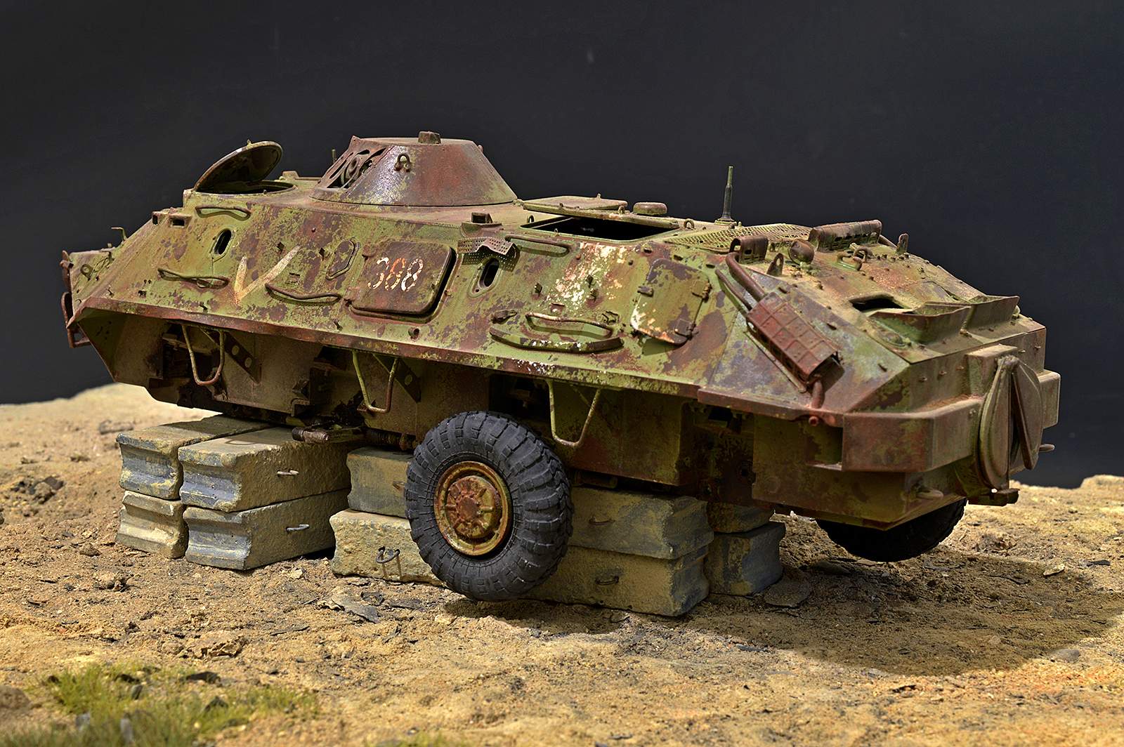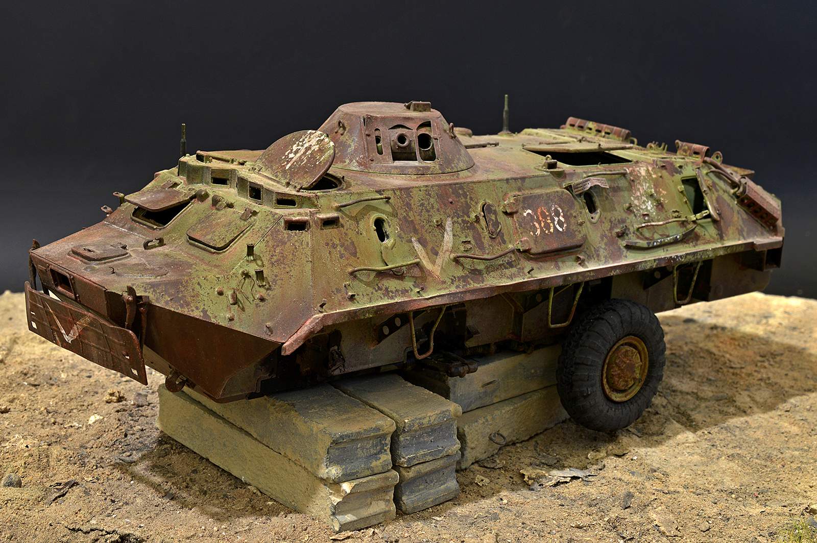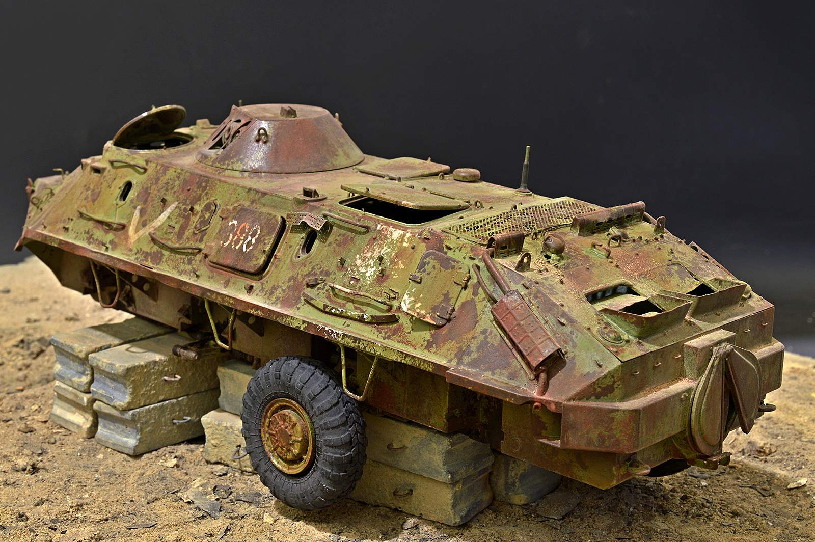 Представляю вашему вниманию бронетранспортёр БТР-60 от Trumpeter в таком необычном металлоломо-состоянии. Постамент, конечно же, временный, опору ему найду в дальнейшей разработке, но пока вот так вот. Так что данную работу не воспринимайте, как виньетку. Да и подставку использовал как всегда дежурную…