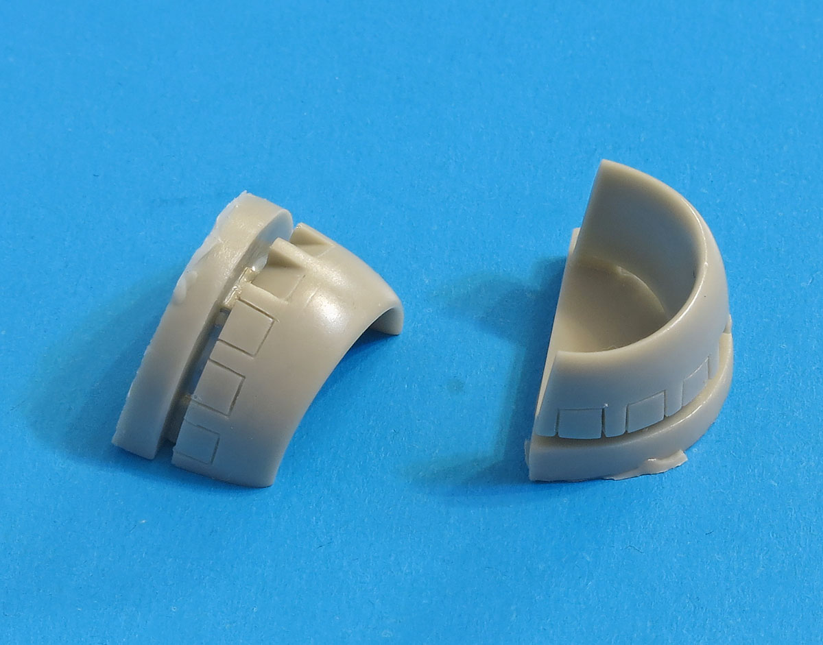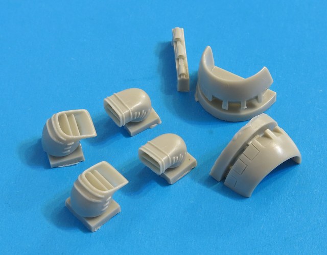 Сравнить с тем, что идет в ките - можно в обзоре кита. Сюда тащить литники смысла не вижу - и так очевидно, что смоляные цельные детали значительно ажурнее и аккуратнее пластиковых - которые еще и из половинок состоят (шов чистить).
