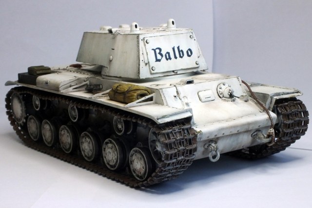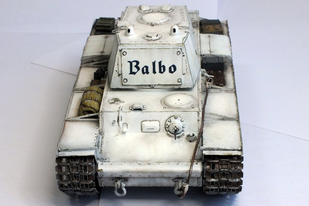 Осенью 1943 г. в районе г. Рига немцы переоборудовали три трофейных КВ-1 в БРЭМ. Одна из них носила имя собственное "Бальбо" -в честь маршала авиации Италии. Модель сделана из набора Трампа без существенных доработок. Мешки с ящиками набросал для оживления модели. Хотел показать недавно окрашенную машину,, поэтому "обдирингом" не страдал.