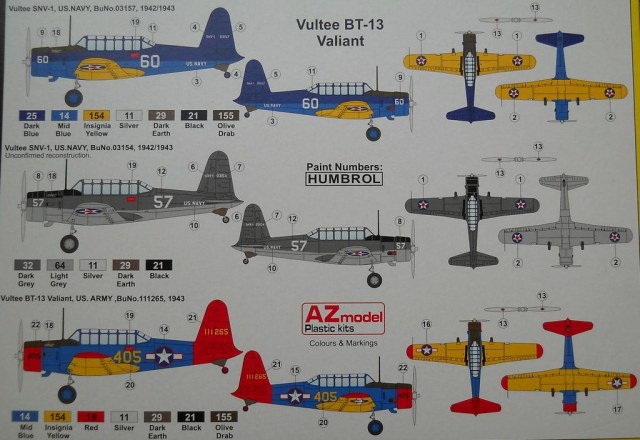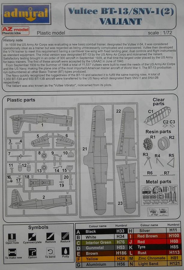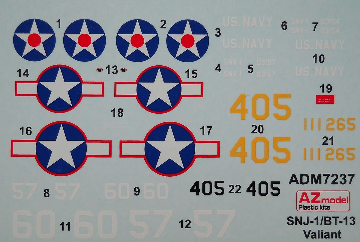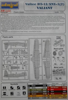 Модель от Admiral (AZ model) из пластика в масштабе 1/72 (номер по каталогу 7437). Картонная коробка с боковым открытием. Типичное для данной фирмы ЛНД. Относительно неплохая деталировка. Тонкий внутренний крой. Имеются детали из смолы, плата фототравления и приборные доски на плёнке. Фонарь хорошего качества. Декаль даётся на три американских варианта самолёта: два для авиации ВМС - SNV-1 и один для армейских ВВС - BT-13 . Инструкция по сборке и окраске выполнена в цвете, она достаточно информативна и наглядна.