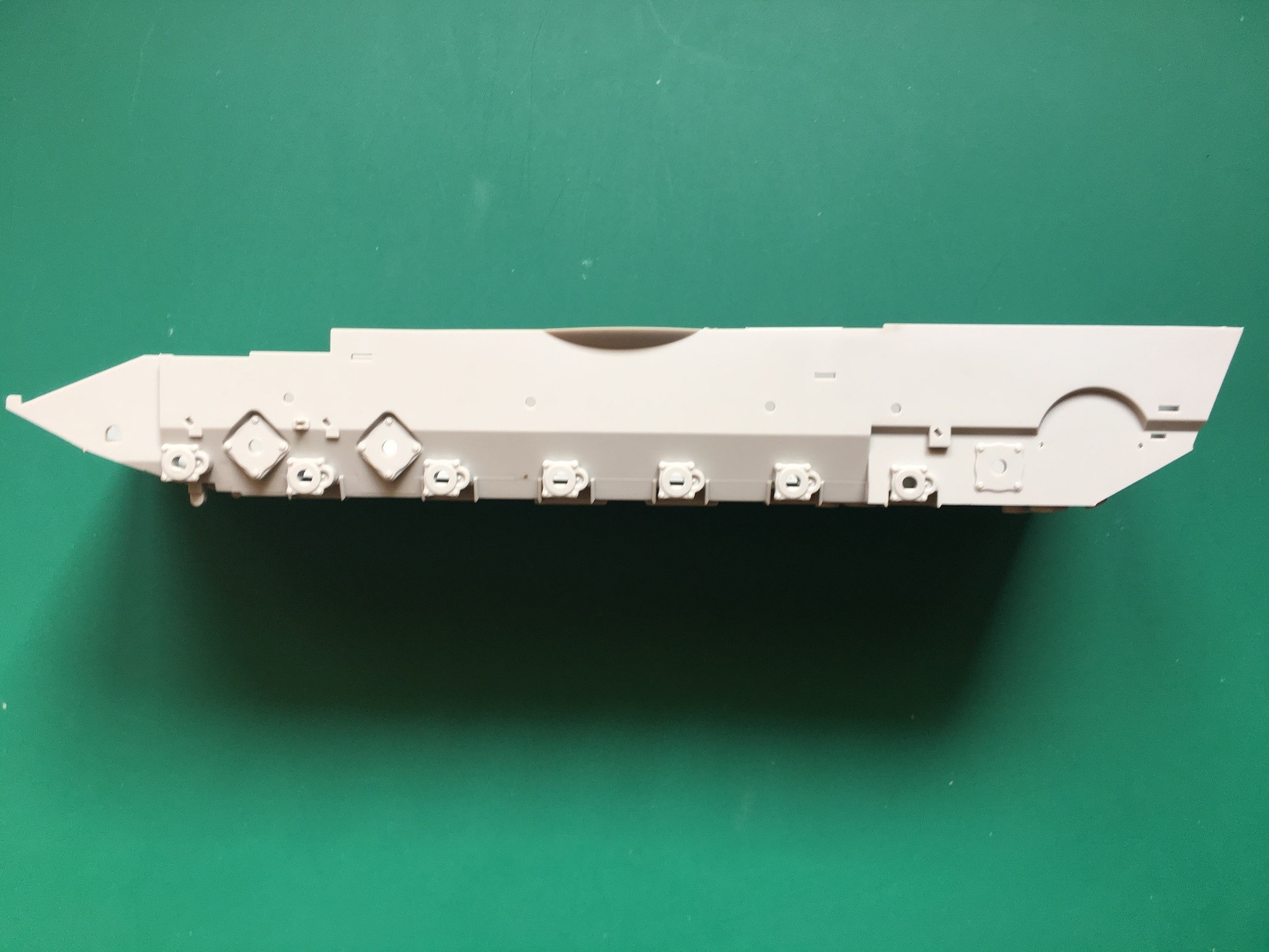 5. Деталировка корпуса и днища соответствует представленным на параде машинам. Имеется разводка трубопроводов, бак под забашенной нишей (у Такома отсутствовал, у Звезды был упрощенно квадратным) имеет сложную форму, соответствующую прототипу. Блоки ДЗ на ВЛД выполнены правильно, без Звездовского косяка с глубокими бороздами, которых отродясь не было ни на одной машине. Сетка забашенной ниши как и у Такома (но не как у Звезды) дана травленой сеточкой, а не монолитным куском пластика. Блоки ДЗ за люком мехвода разделены, как и на реальном прототипе (у Звезды был отлит монолит».