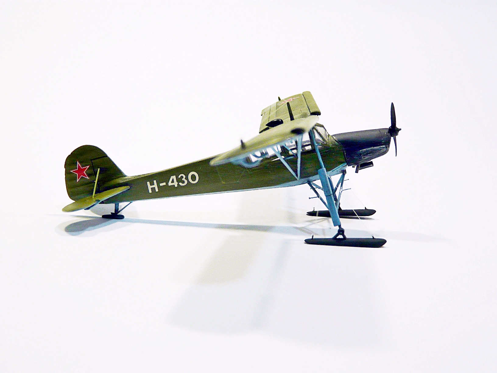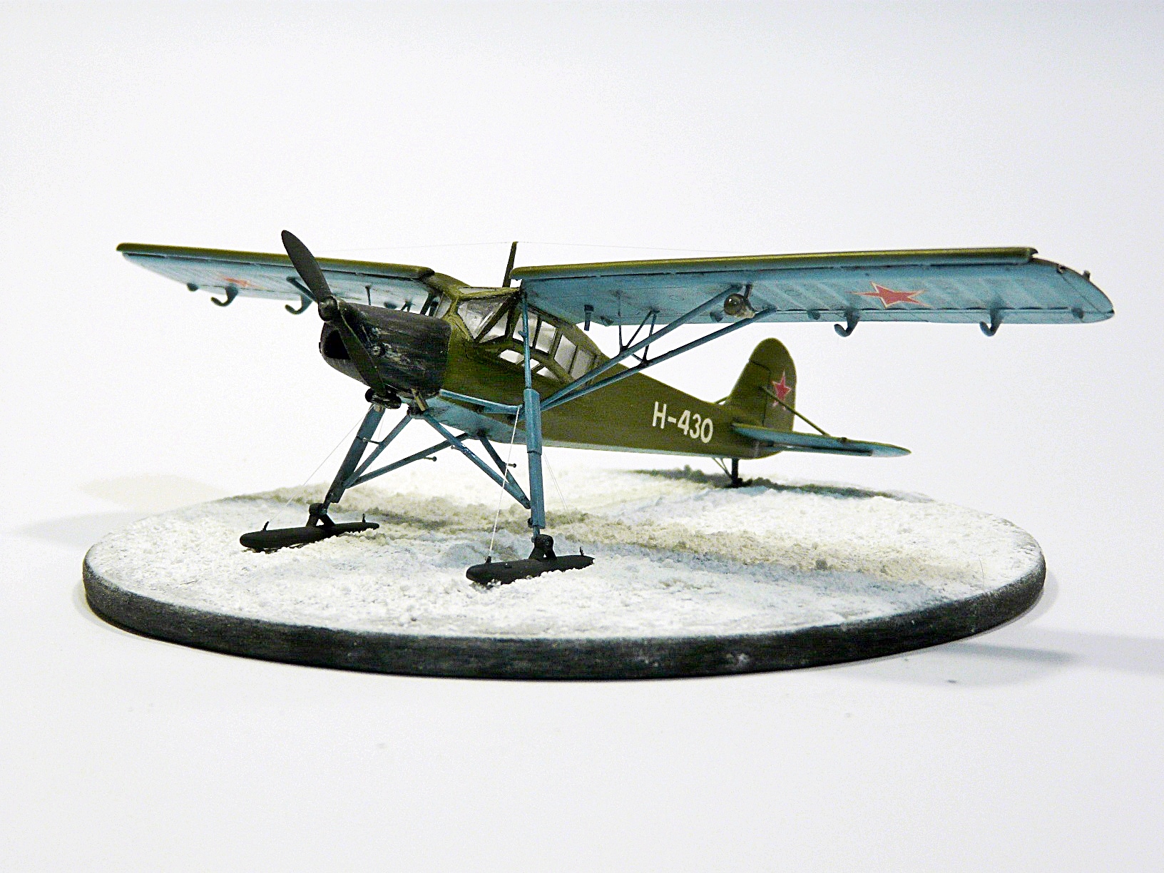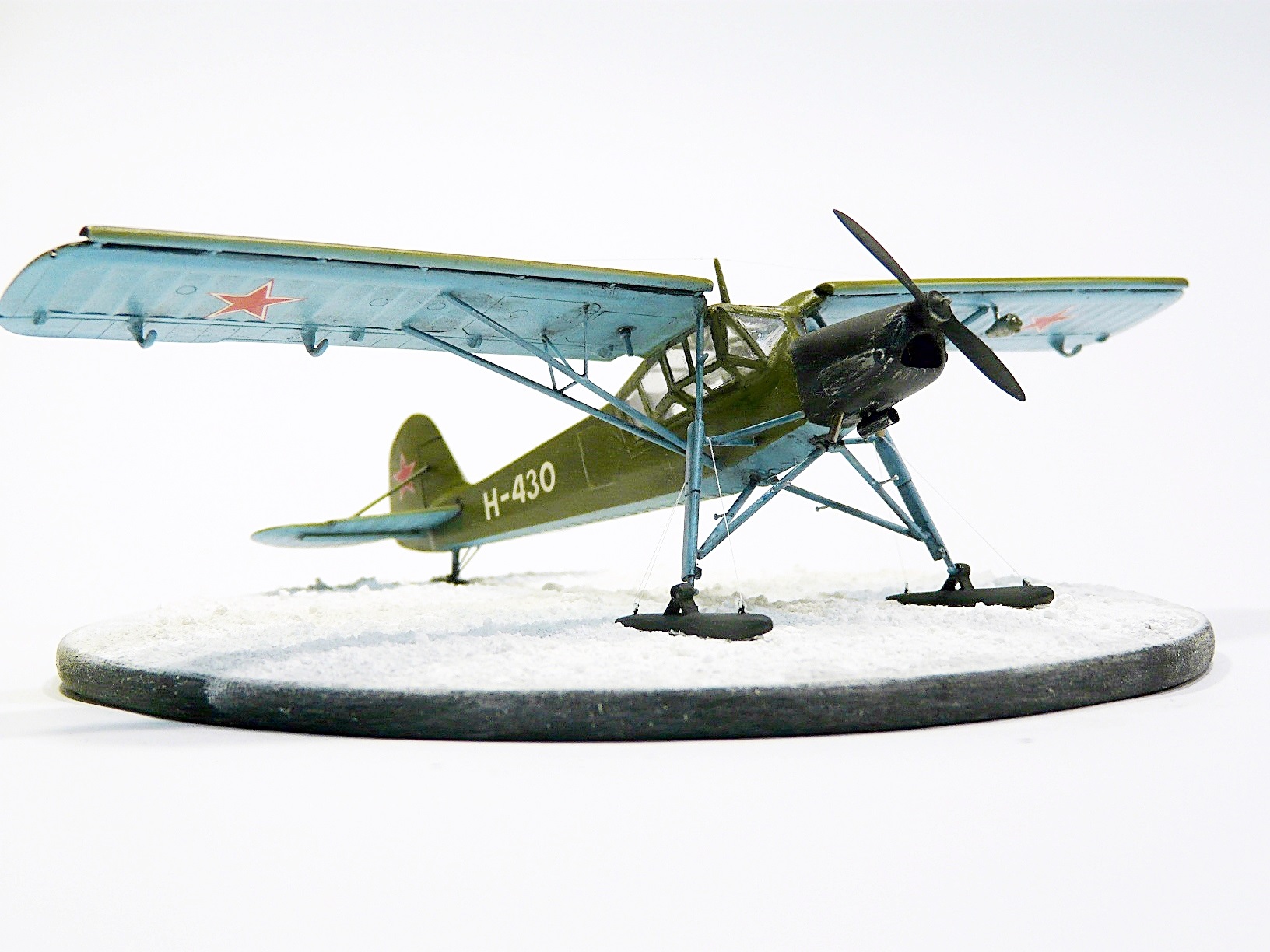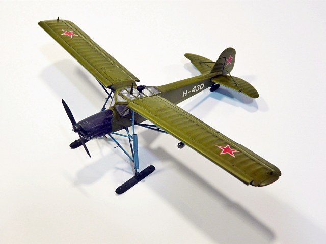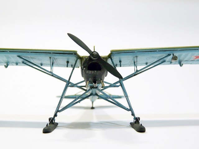 Собирал из известного набора Academy, доработки: переделаны стойки и крепления шасси, подправлен винт, переделана фара и РПК, исправлены выхлопные коллекторы, лыжи самодел, удалена "решетка" радиатора и сделан с нуля двигатель, его правда на фото не видно, но в реале можно рассмотреть.