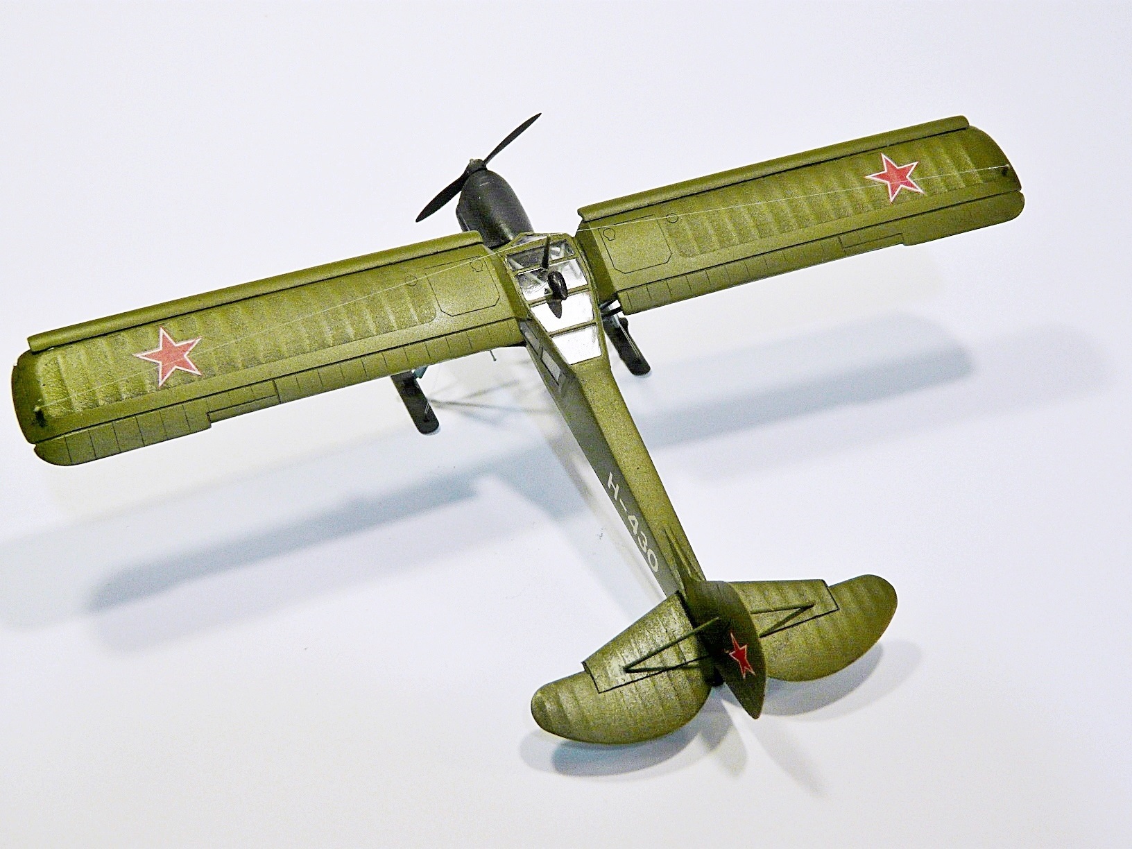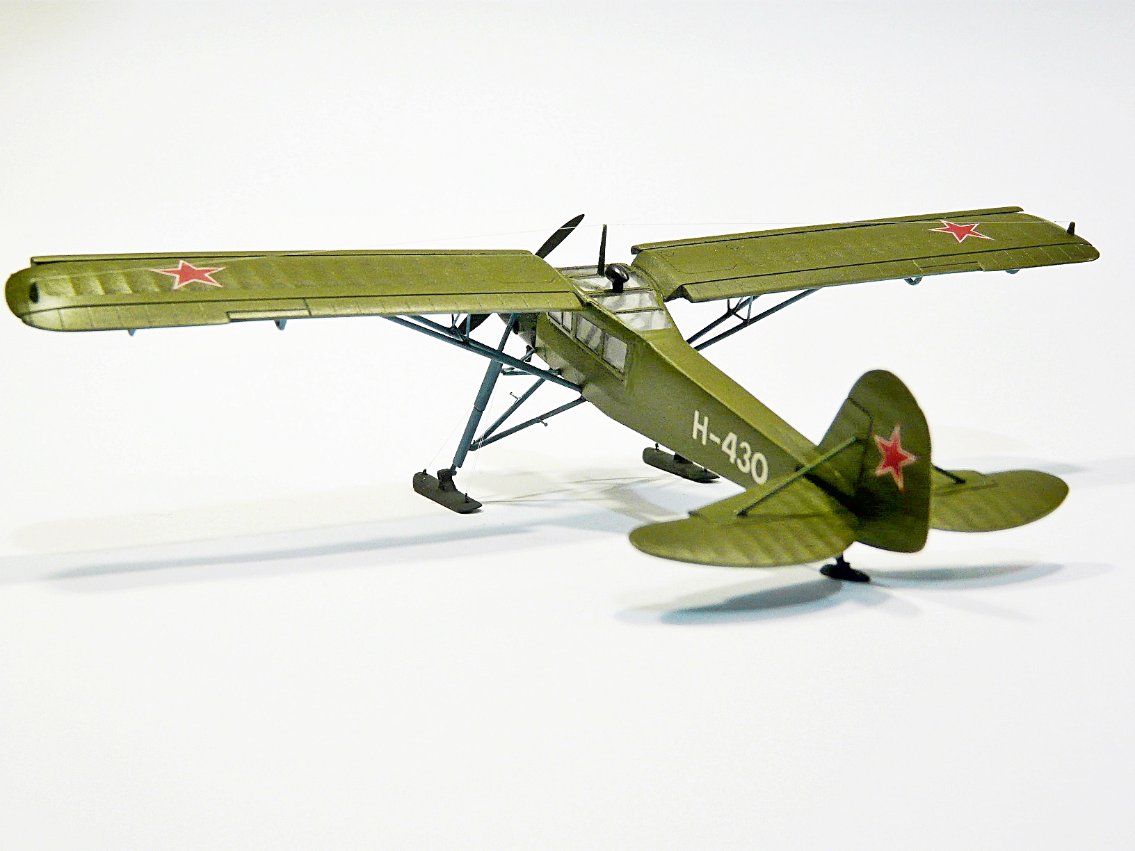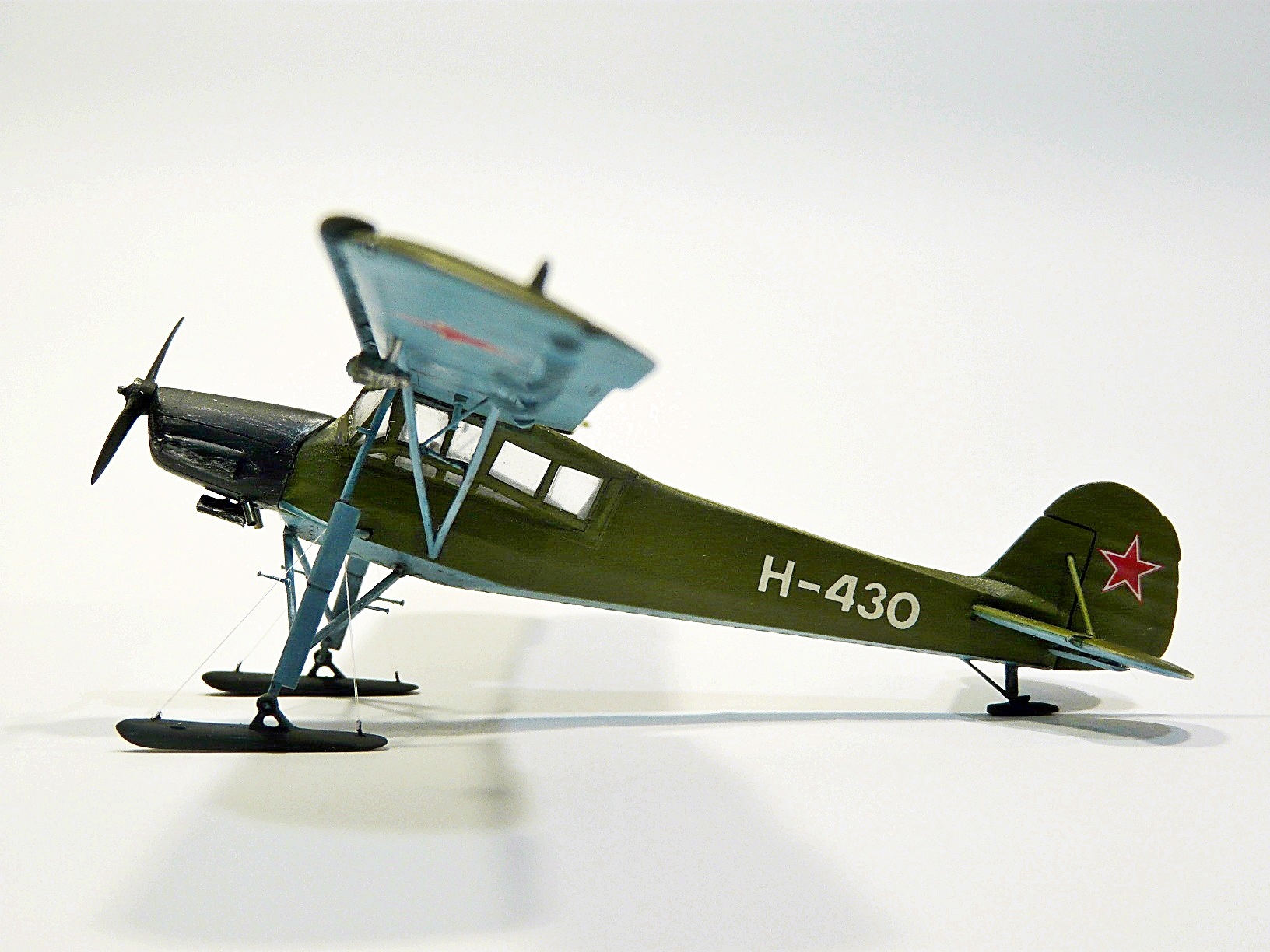 Собирал из известного набора Academy, доработки: переделаны стойки и крепления шасси, подправлен винт, переделана фара и РПК, исправлены выхлопные коллекторы, лыжи самодел, удалена "решетка" радиатора и сделан с нуля двигатель, его правда на фото не видно, но в реале можно рассмотреть.