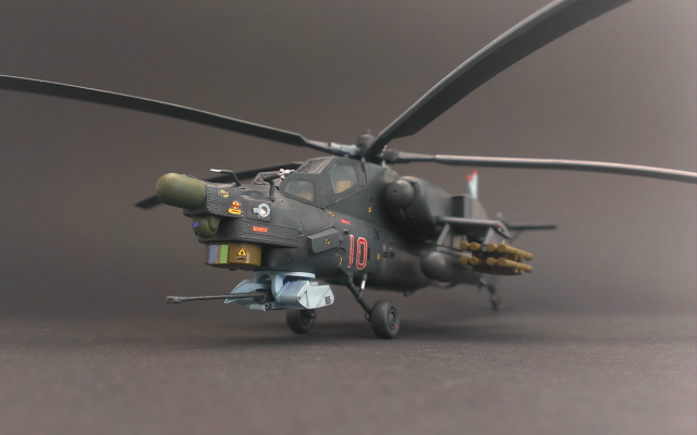 Машина в таком окрасе и с б/н 10 красный действительно существует, но модель строилась все же "по мотивам", просто хотелось Ми-28 в баклажане. Декали частично из набора, частично от МиГ-29 и Ми-24. Окраска кистью, Звездой, по традиции)