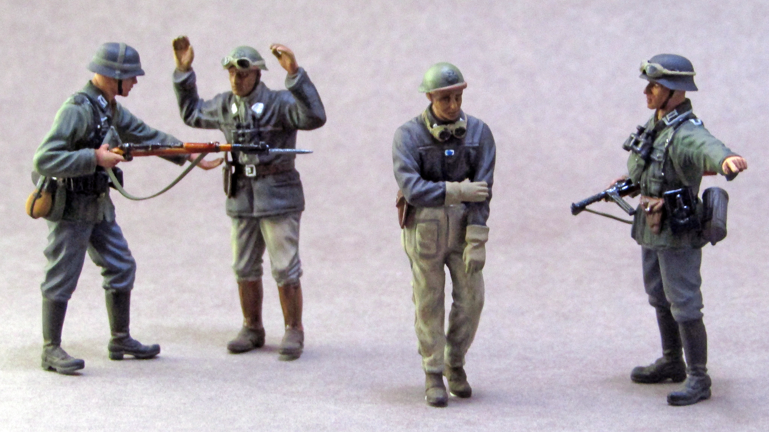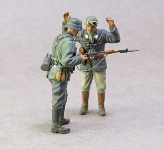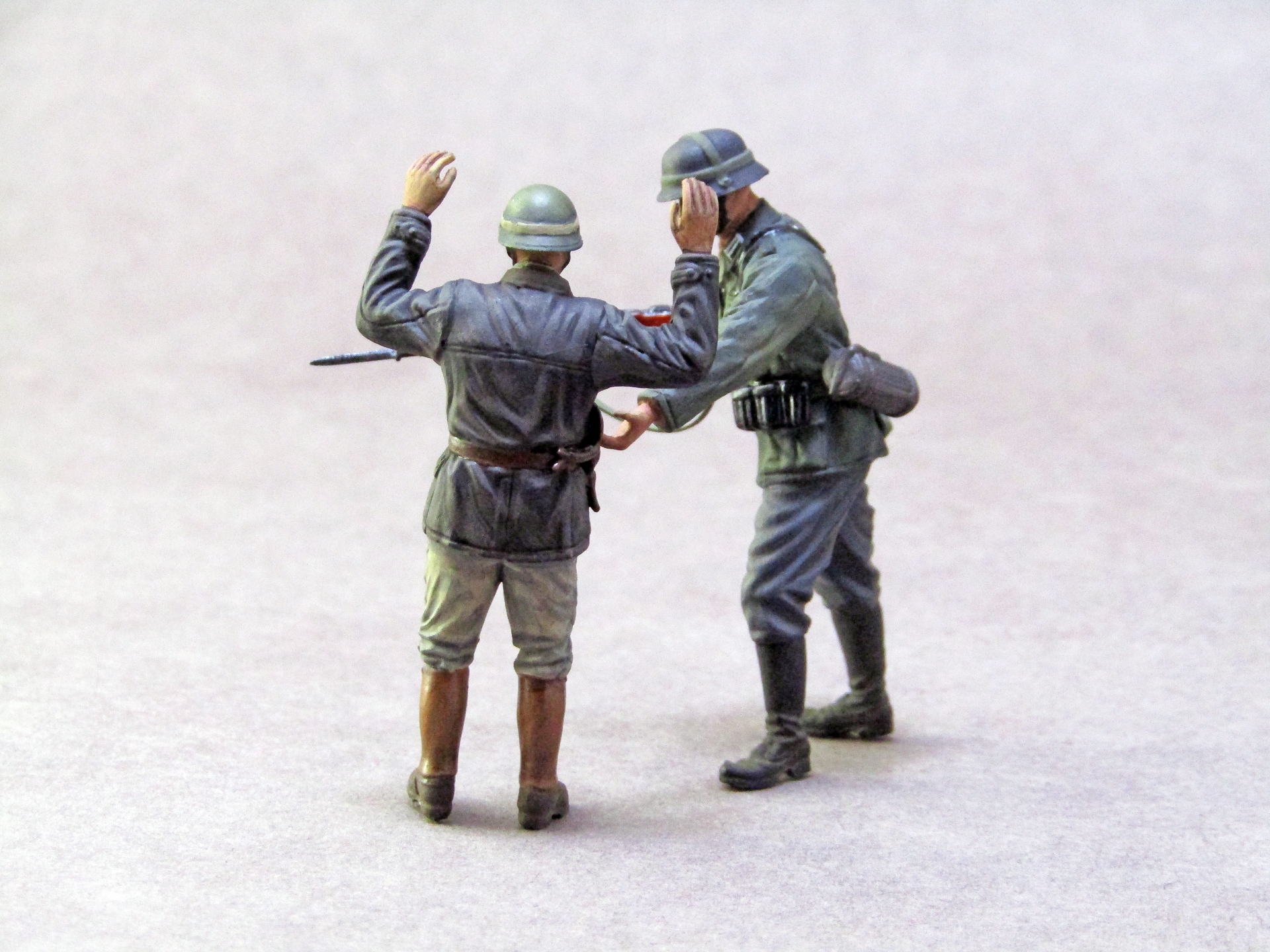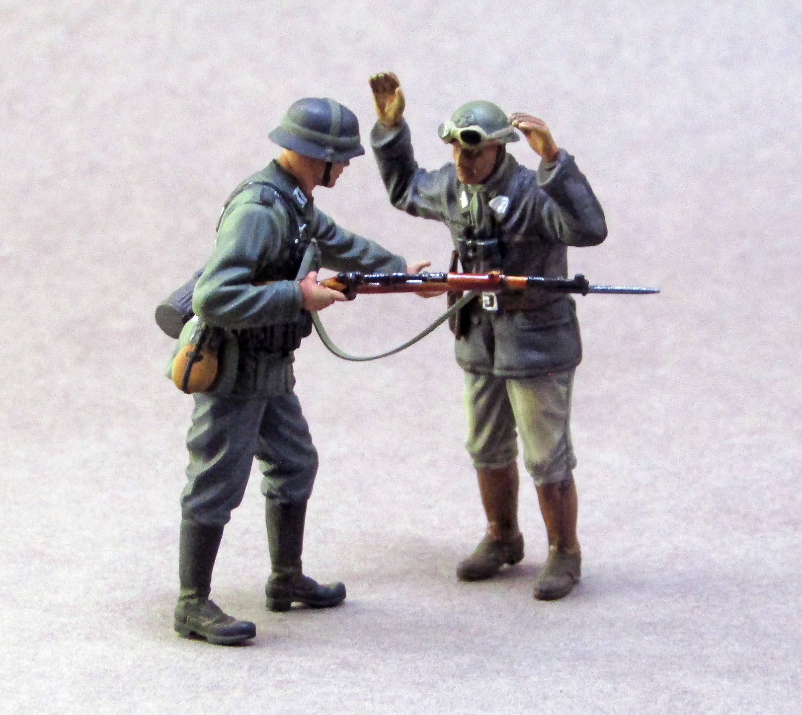 На погонах у немцев ваффенфарбе не увидел. Винтовочные ремни на "Маузере" - коричневая кожа, а не нечто хаки. Подсумок под МР-34 с другой стороны должен быть. Газбаки вообще висят неверно - на фигурках ремень к правому боку идет, у вас они слева висят не пойми на чём. Ремень на МР-34 расположен неверно - там антабка не у дульного среза далеко.