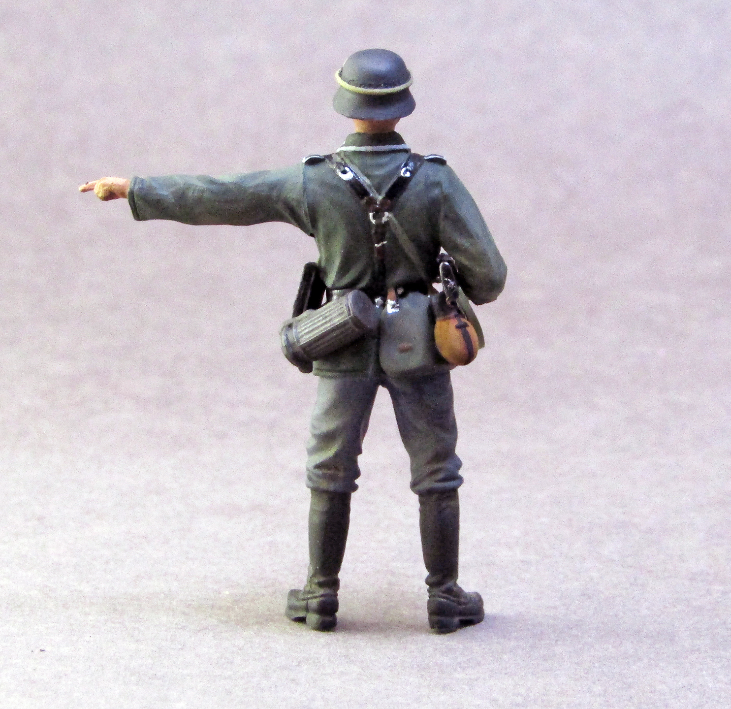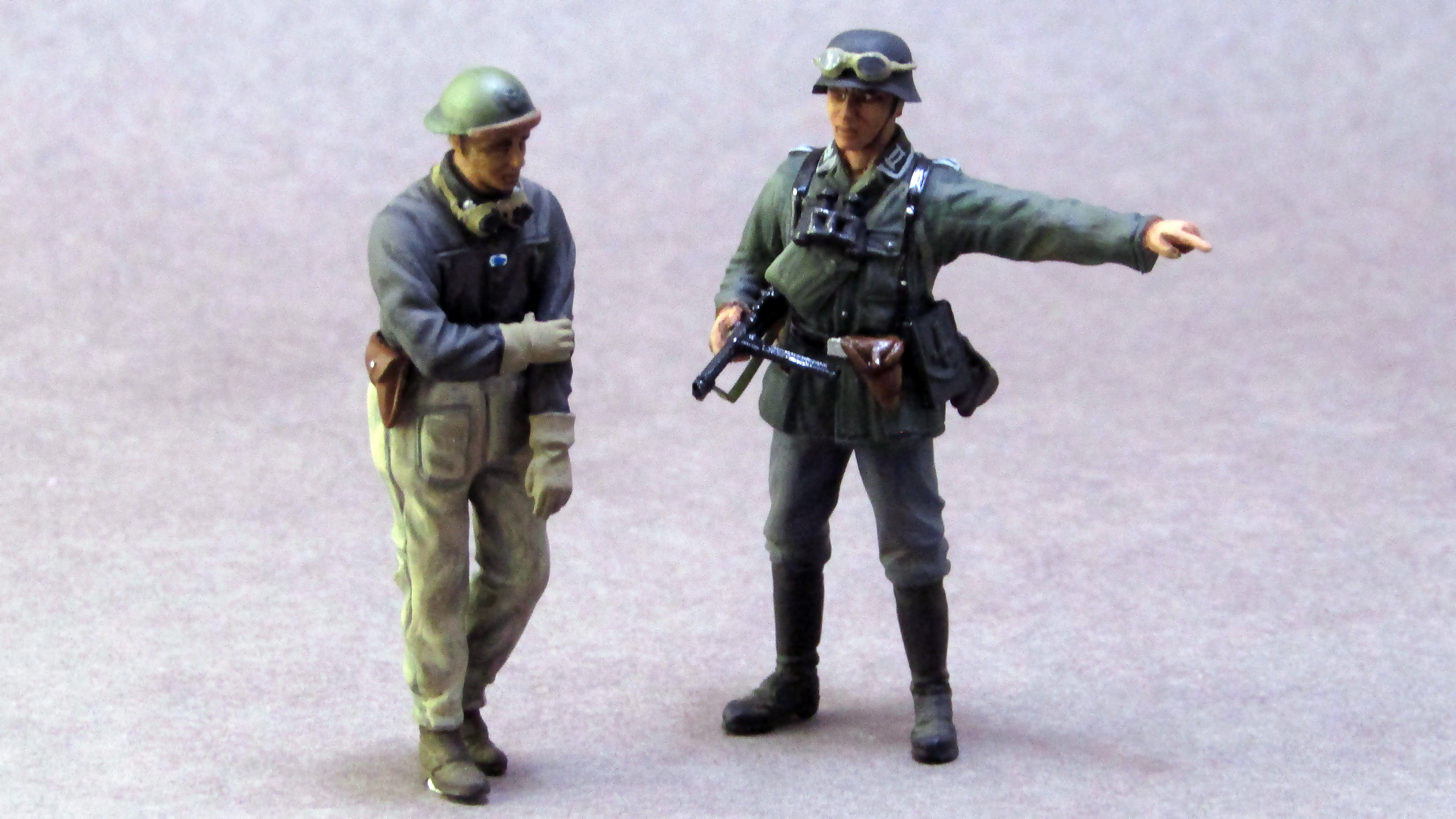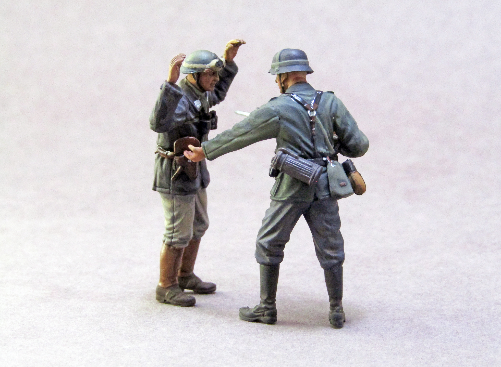 На погонах у немцев ваффенфарбе не увидел. Винтовочные ремни на "Маузере" - коричневая кожа, а не нечто хаки. Подсумок под МР-34 с другой стороны должен быть. Газбаки вообще висят неверно - на фигурках ремень к правому боку идет, у вас они слева висят не пойми на чём. Ремень на МР-34 расположен неверно - там антабка не у дульного среза далеко.