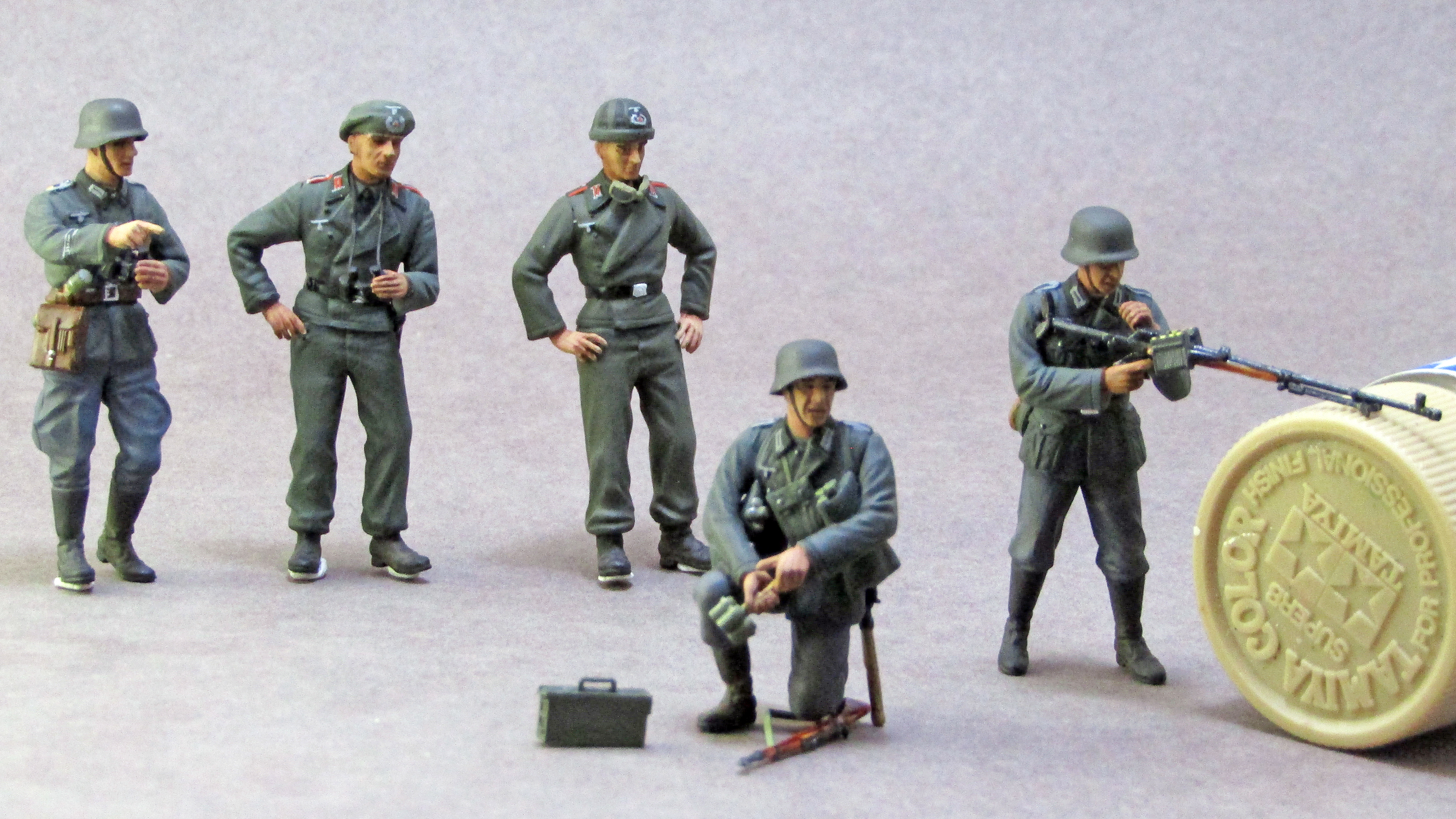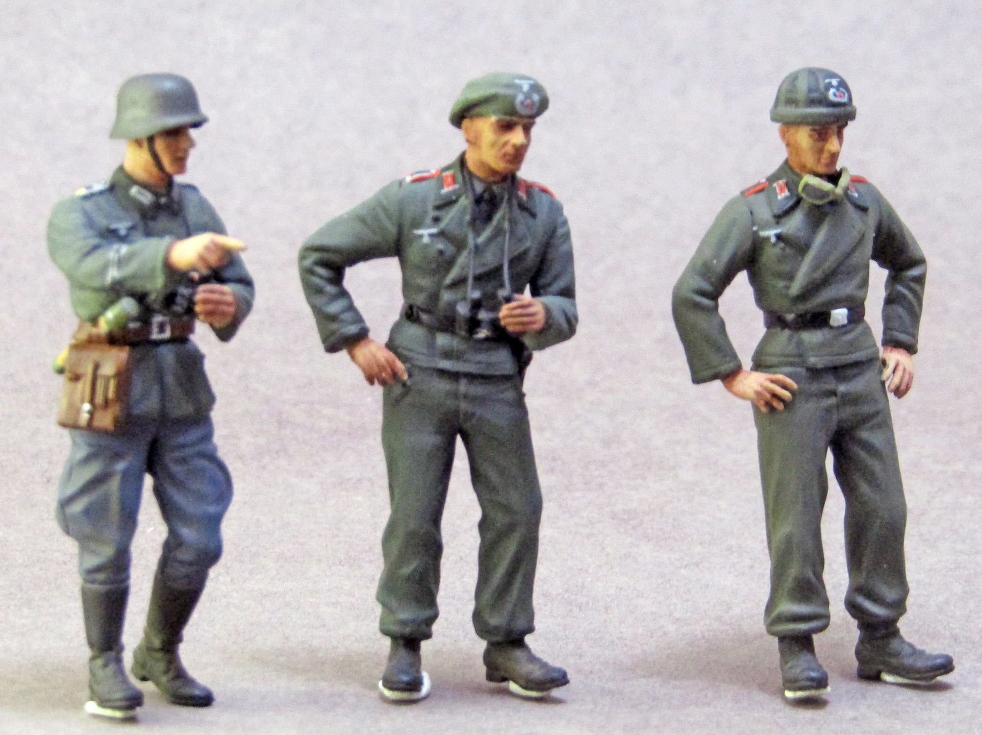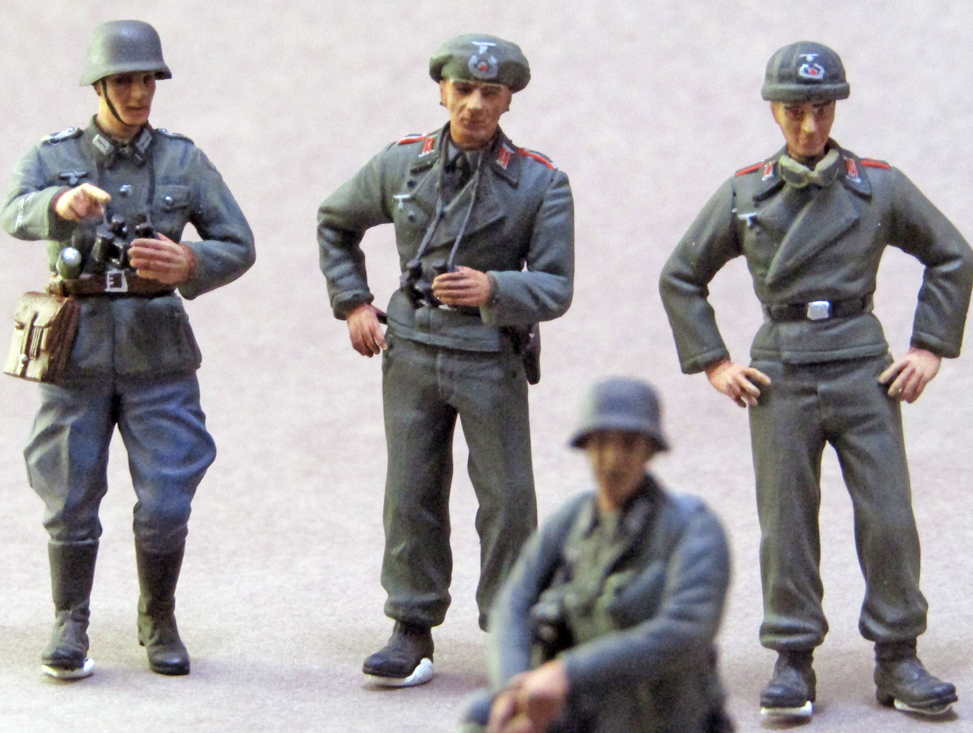 Роспись - так себе. Много косяков по окраске мелочей - воротники кителей на кампанию 1940 - в основном зеленые от мундиров обр. 1935 г. Пуговицы частью не покрашены. Лица - не очень. Почему у экипажей штурмового орудия петлицы и погоны артиллерии? У них были танкистские петлицы цвета "фельдграу".
