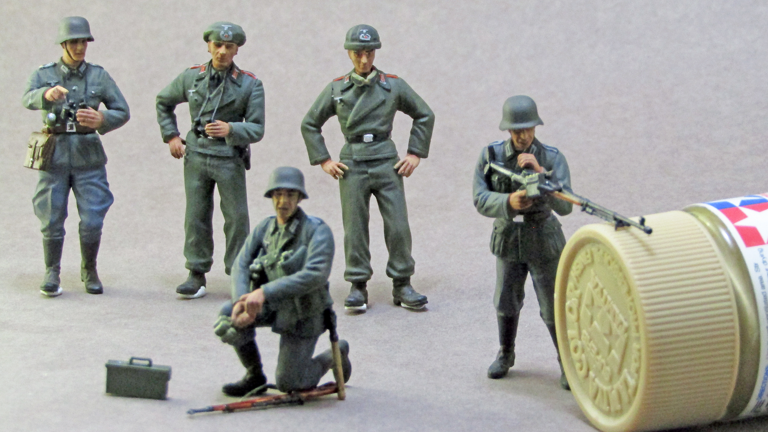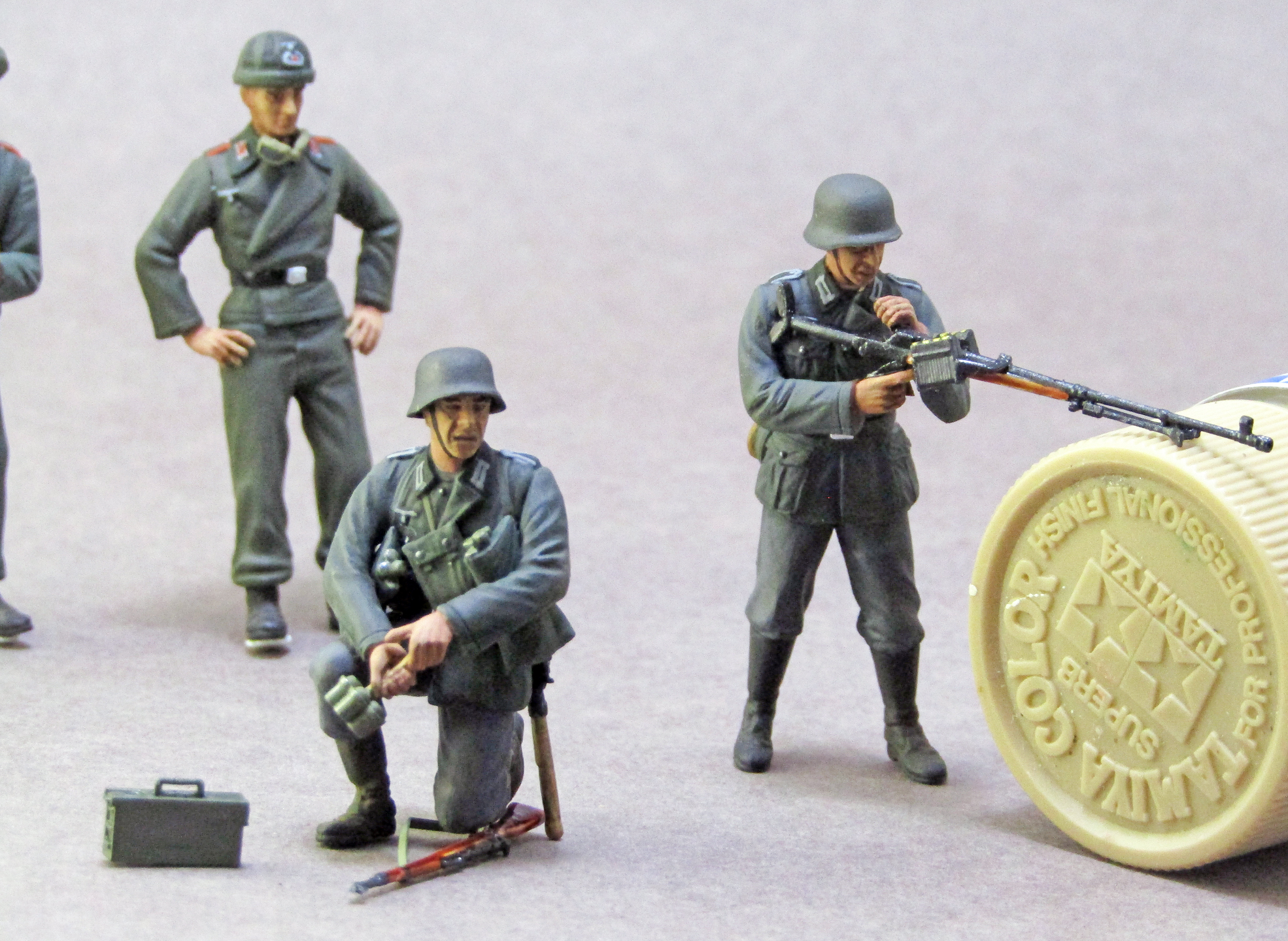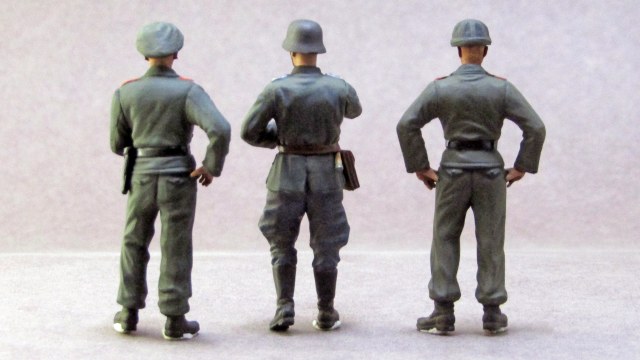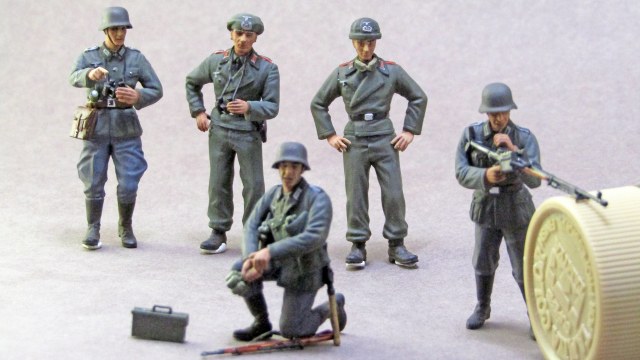 Роспись - так себе. Много косяков по окраске мелочей - воротники кителей на кампанию 1940 - в основном зеленые от мундиров обр. 1935 г. Пуговицы частью не покрашены. Лица - не очень. Почему у экипажей штурмового орудия петлицы и погоны артиллерии? У них были танкистские петлицы цвета "фельдграу".