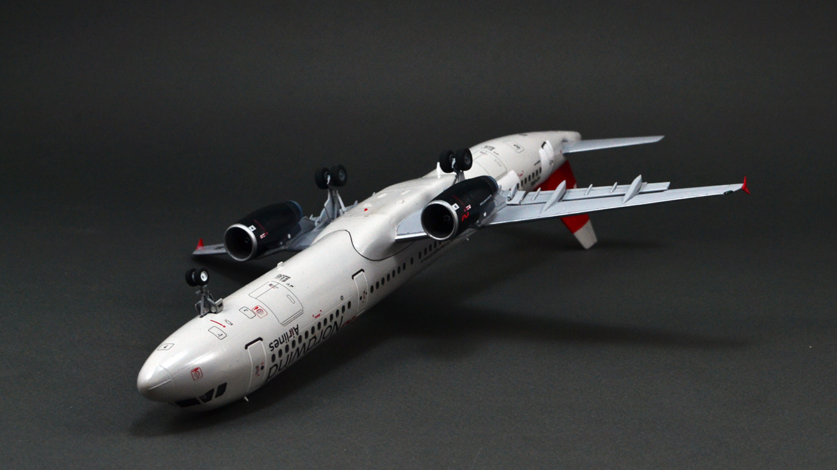 Сборка без сюрпризов - полная искоробка, в основном без проблем, только, как всегда, воевал со стыком прозрачного пластика остекления кабины с серым фюзеляжем. Для окраски лобовика и колёс использовал маски от KV-models. Цвета следующие: крыло и стабилизатор - грунтовка от Ганзы из баллончика, корогады крыла - Gunze neutral grey, киль и винглеты - Gunze mudder red, фюзеляж - Gunze light grey + сверху перламутр TS-65, двигатели XF-69 + TS-65. Немного выделил расшивку серой смывкой от MiG по плоскостям. Финальный лак - Футура. Основная декаль от Саши Ascensio, техничка из набора Revell.