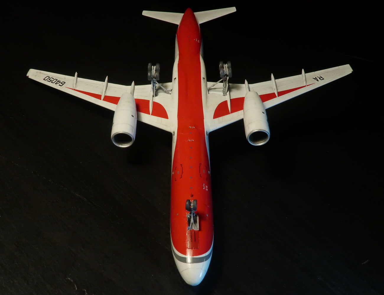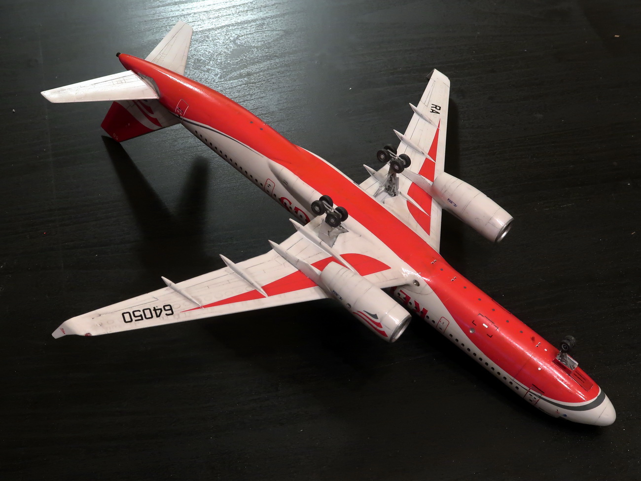 Конечно, я поначалу обрадовался декали, которая, вроде как избавляет от накраски этого краснокрылого безумия, но потом, в процессе её нанесения, десять раз пожалел, что повёлся на лютую засаду от производителя. Не, конечно, имея усидчивость и терпение школьника, это сделать можно. Но я в этом не уверен. Во-первых, декаль всего этого красного пуза дико тянется и надо было её резать как трансаэровского тигра частей этак на десять, а потом подгонять. Но это не самый лучший вариант, как оказалось, потому что любой перехлёст на стыке (а он будет 100%) даёт очень сильное изменение цвета в этом месте. С носом проблем практически не было, а вот хвооост... Подогнать одновременно проёмы стаба и расстояние до хвостовых окон практически нереально - изгиб уползает немного ниже и попасть в нужное место задними дверями становится невозможно - они в этих жутких трёх слоях декалей просто ниже на 4мм расшивки. Да, косяк и я его заметил только на финише. А на носу после лака х22 дека ещё и стала расползаться кракелюрами, что было очень неприятным сюрпризом. Короче, после декалирования, красный гамбургер был очень забавный, но акановский Signal Red прекрасно совпадает со звездовским неправильным цветом декали и локальные задувы выправили ситуацию.