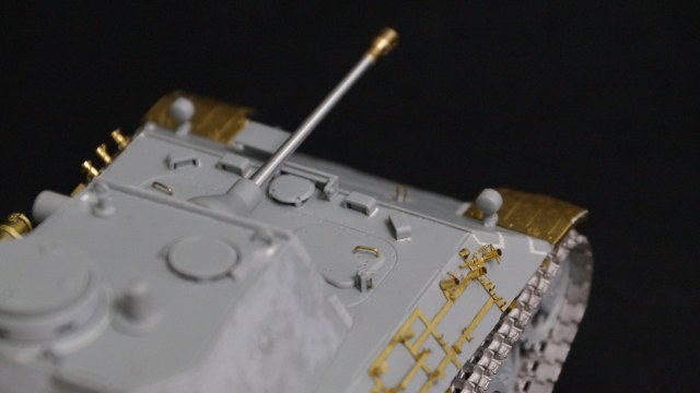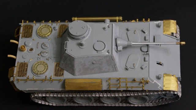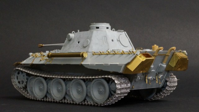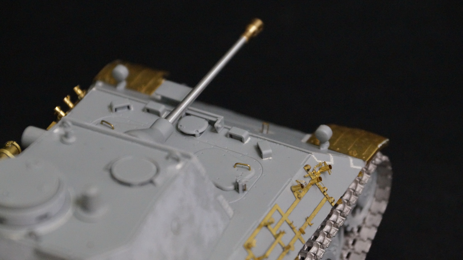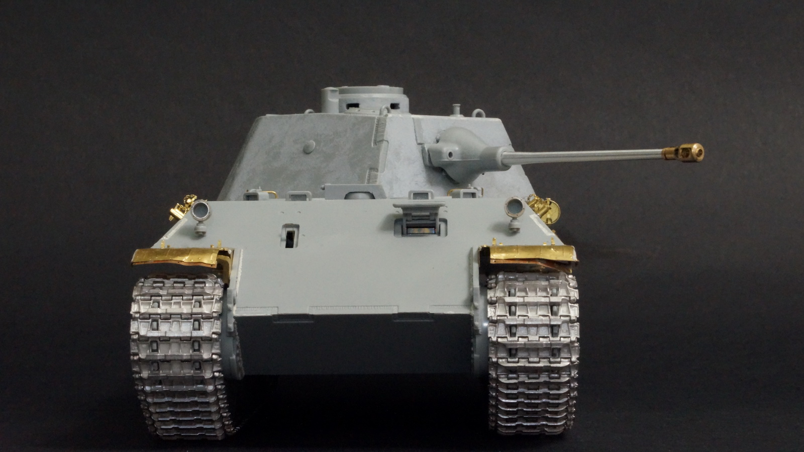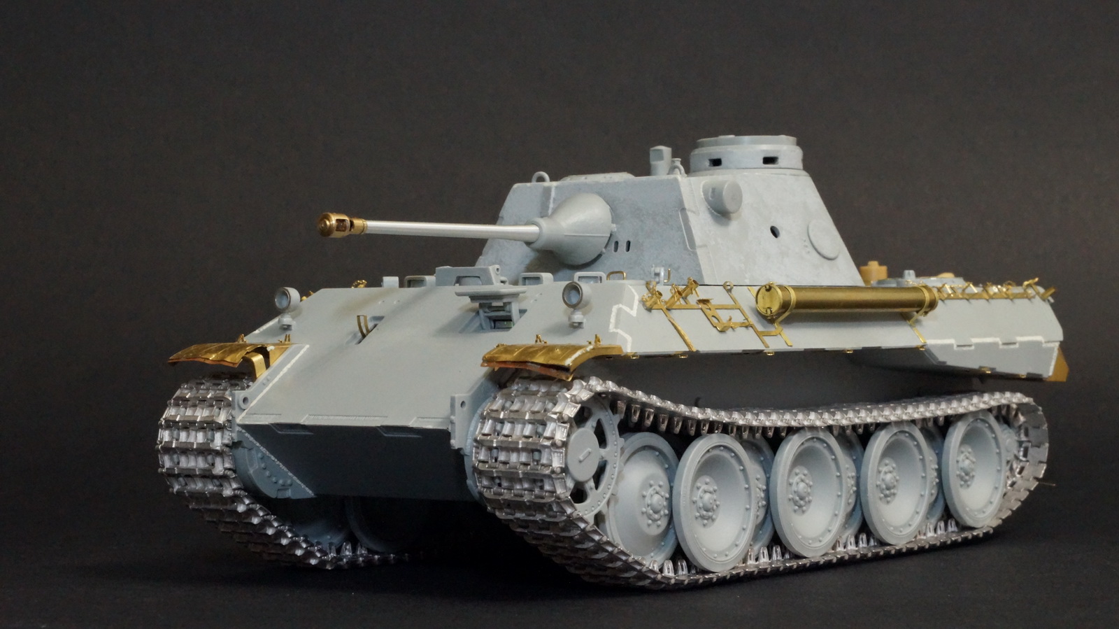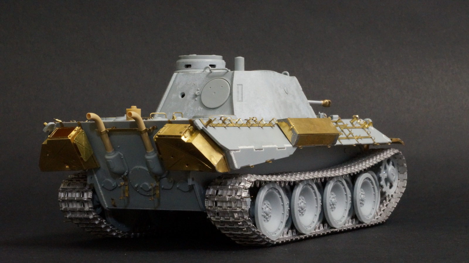 Модель Пантеры с 50-ти миллиметровкой, построена на заказ. Набор Дракона был переработан: оставил штатную командирскую башенку; добавил посадочное место для второй фары; одна гусеница надета задом наперёд; добавлены доп экраны на кормовые ящики; ручки на лючках позднего расположения. По сути данное шасси промежуточного варианта. Камок по инструкции городского типа как ни странно.