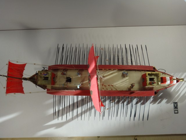 Трирема, основной тип боевого корабля Римской империи. Три ряда весел располагались на трех уровнях. Скорость триремы достигала 6 узлов. Основным оружием служил бронзовый таран. Данная модель представляет собой личный корабль Императора. На носу и корме богато украшенного корабля располагались башенки для лучников.