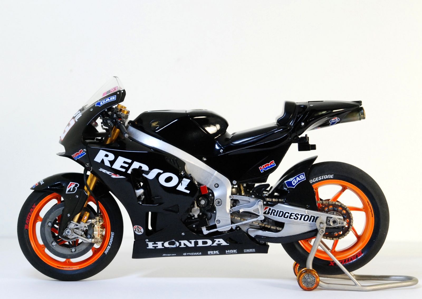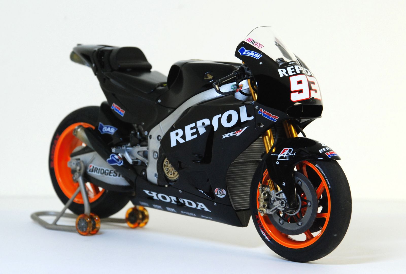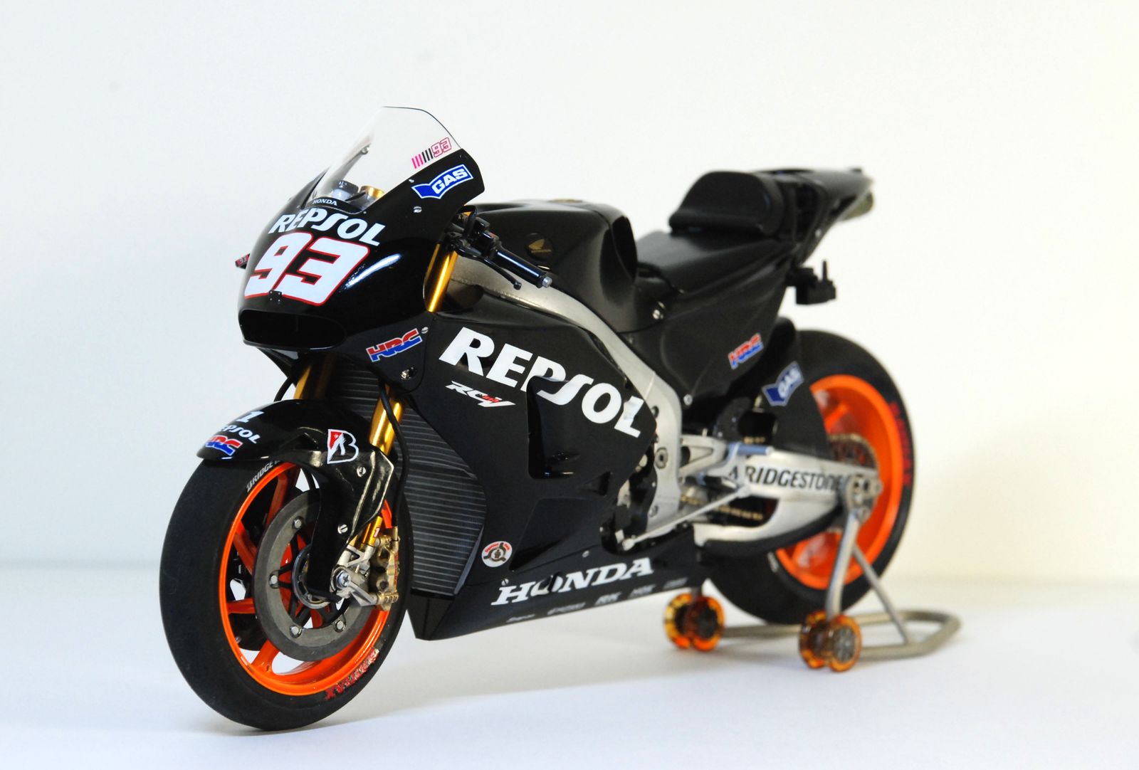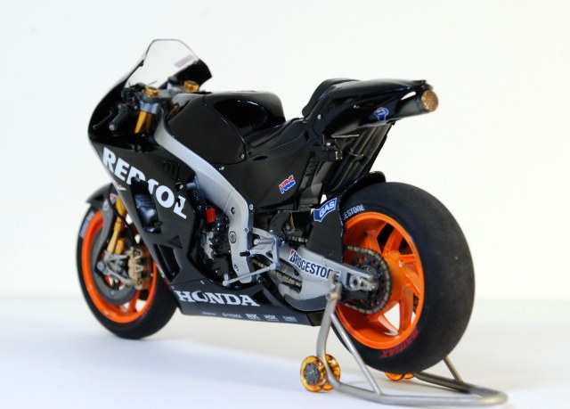 Приветствую всех! Хочу поделиться с вами результатом своей работы над супербайком Honda RC213V 2014 известного испанского мотогонщика, Марка Маркеса, пилота команды Repsol Honda Team. На этом байке он завоевал свой второй титул чемпиона мира в 2014 году. На сегодня он является пятикратным чемпионом мира в королевском классе MotoGP. Молодой пилот впервые сел на мотоцикл в 5 лет! Сердцем мотоцикла является японский двигатель HONDA V4 DOHC, 4 клапана на цилиндр, рабочий объем 1000 см3, с жидкостным охлаждением. Байк выдает мощность более 180 кВт (241+ л.с.).Изначально планировалось сделать всю модель в яркой боевой раскраске Repsol Team (оранжево-бело-красной), но из-за того, что на лист с основными декалями мной был пролит растворитель, об этом можно было сразу забыть! Одним словом рукожоп! ))) Бороздя просторы интернета я так и не нашел оригинальных дек, которые можно было бы приобрести отдельно, не покупая кит целиком. Тогда мной было принято решение сделать эту модель в другом варианте- в черном тренировочном пластике Repsol Test Valencia Season 2013-2014. Все эти деки и заодно металлическая вилка были заказаны через Ebay. В результате получился байк в совершенно другом облике, который ему также довольно неплохо подходит, на мой взгляд! ) Всего на работу ушло порядка 5 месяцев. Вечная проблема в свободном времени, по этому между сборками получались продолжительные перерывы. Тут без косячков конечно не обошлось, так что сильно прошу не судить! ))