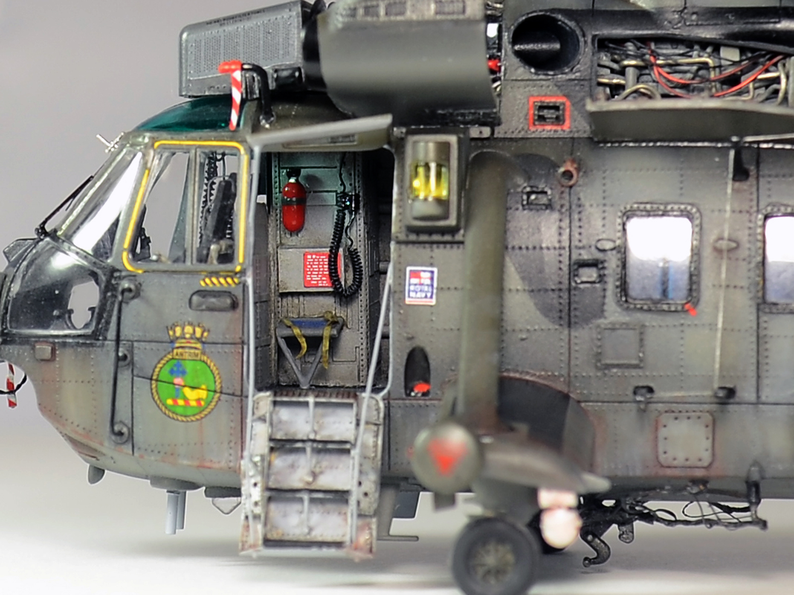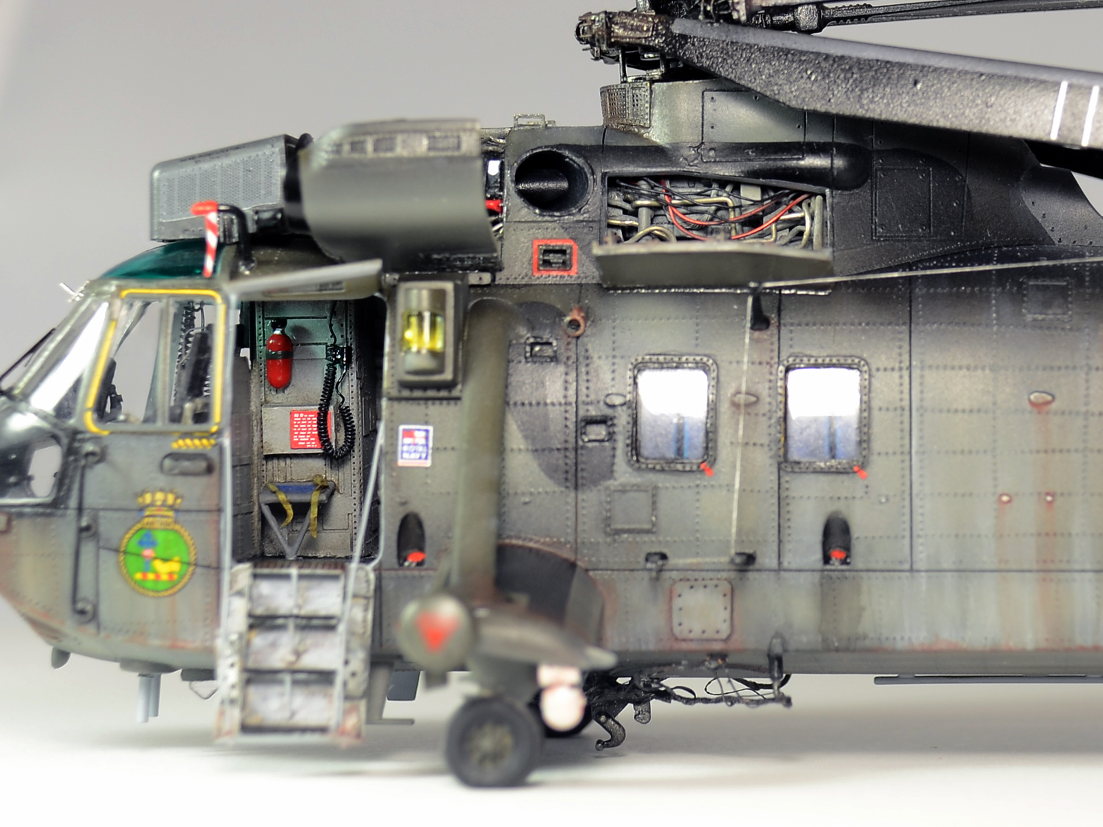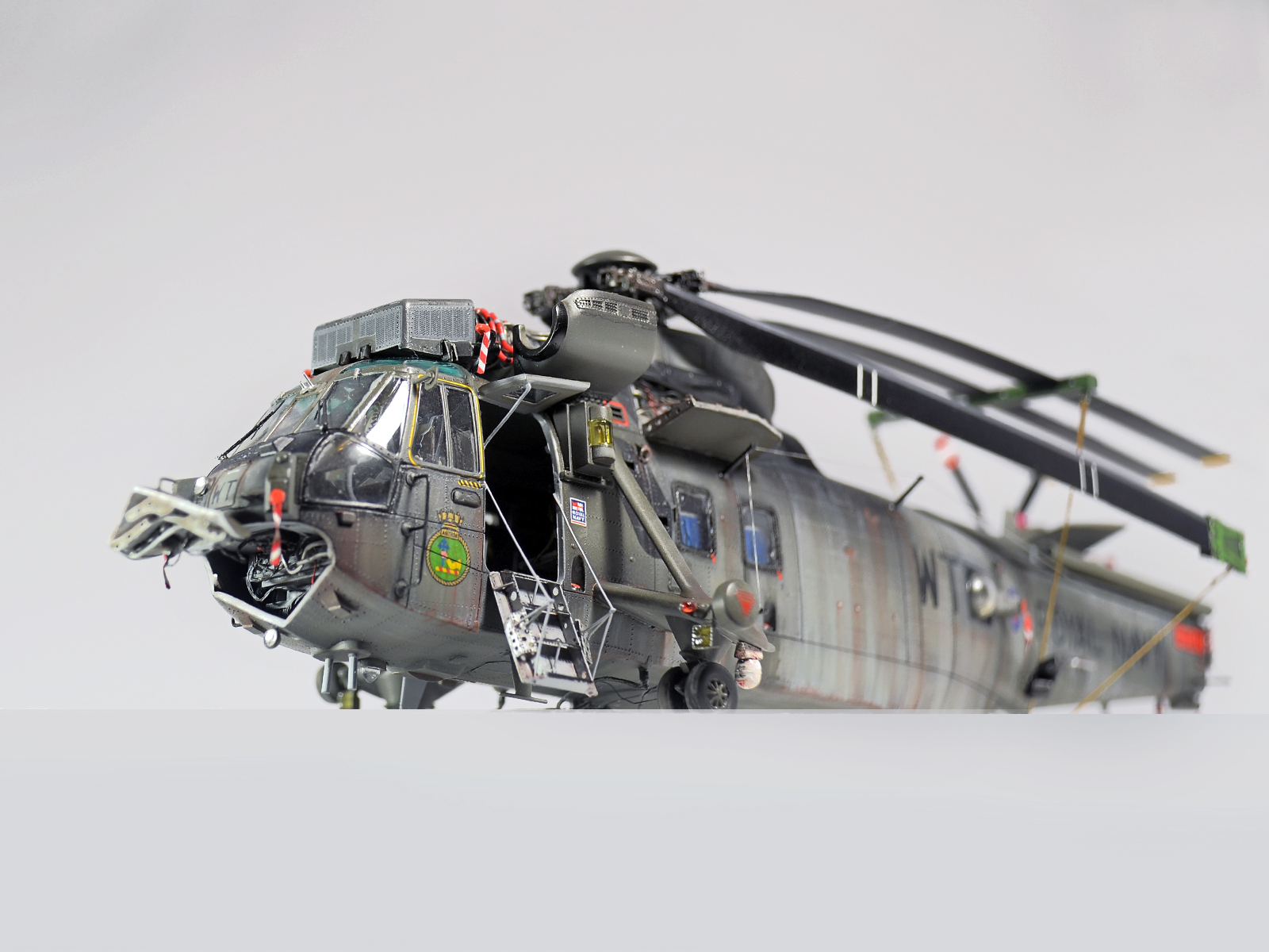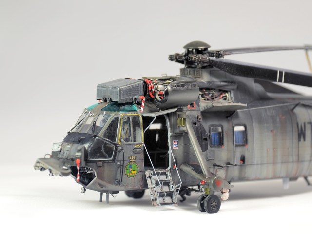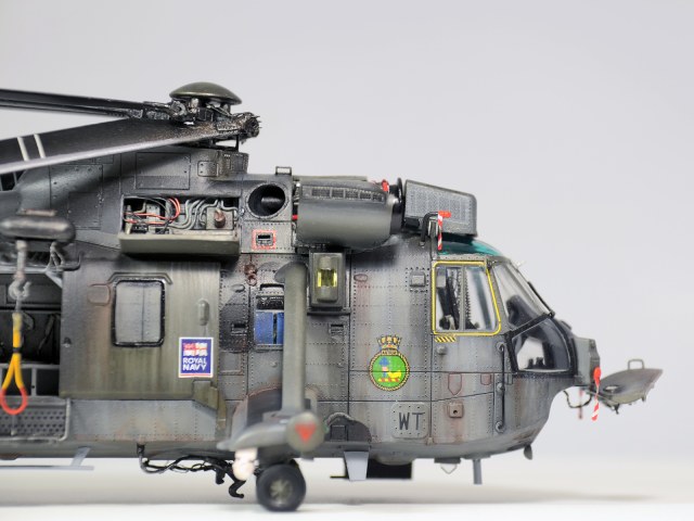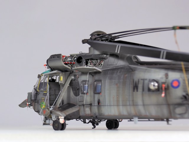 Красилась модель аэрографом привычными для меня эмалями Revellи Humbrol. Потом различные тонировки для того, чтобы добиться эффекта сильно выгоревшей и обтёртой краски. Так как предполагается, что вертолёт повоевал в битве за Фолклендские (Мальвинские) острова. А было это очень давно, в 1982 году. Затем эти модификации были использованы в составе SFORи IFOR. В общем помотались и пообтрепались. Использовал Миговские пигменты и фильтры. Тонировка верхних стёкол от солнца - Футура с зелёнкой. А различные коричневые стёкла на инфракрасных джаммерах - Футура с йодом.