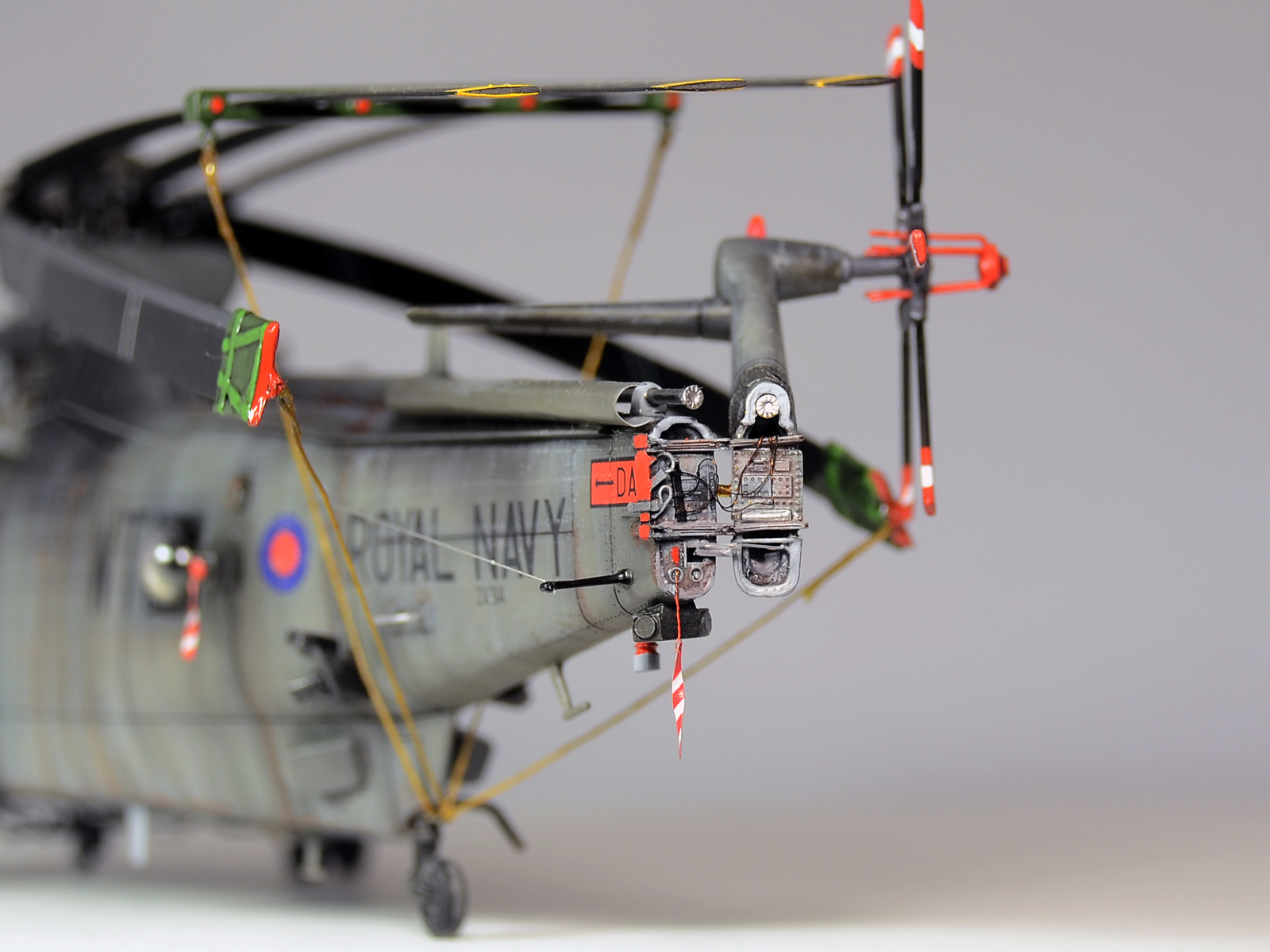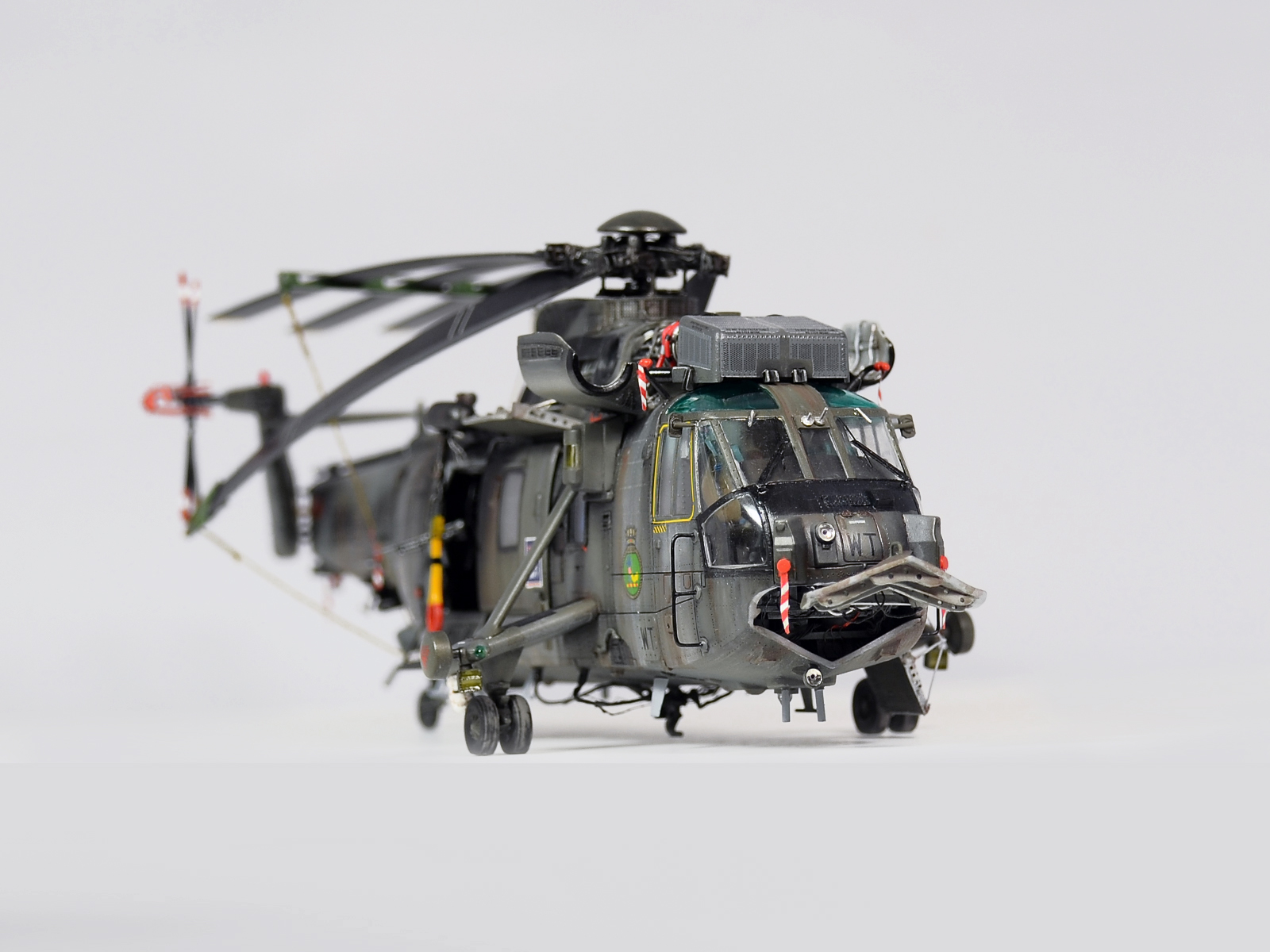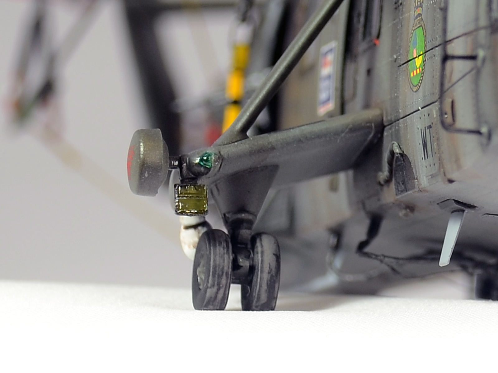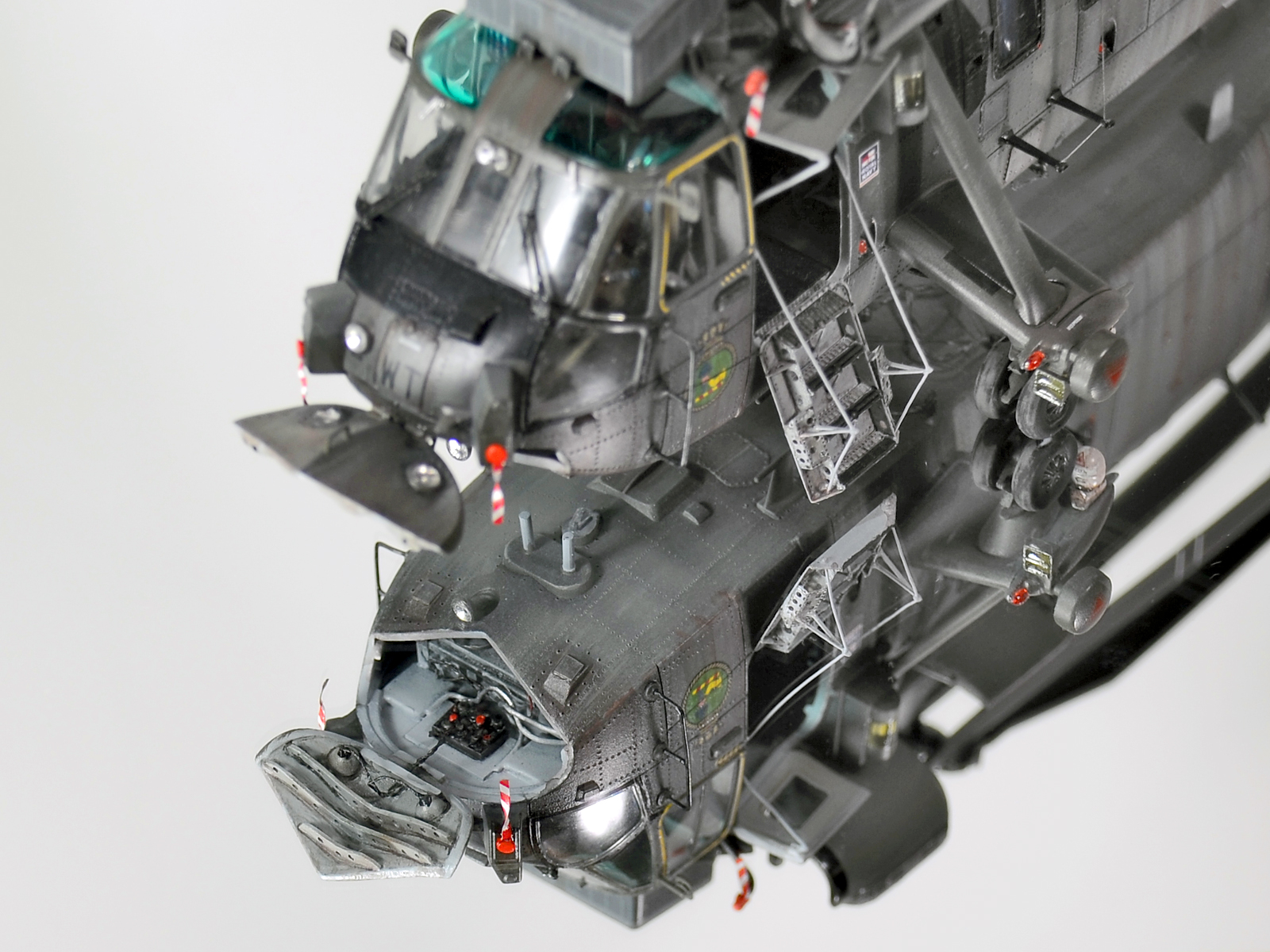 Красилась модель аэрографом привычными для меня эмалями Revellи Humbrol. Потом различные тонировки для того, чтобы добиться эффекта сильно выгоревшей и обтёртой краски. Так как предполагается, что вертолёт повоевал в битве за Фолклендские (Мальвинские) острова. А было это очень давно, в 1982 году. Затем эти модификации были использованы в составе SFORи IFOR. В общем помотались и пообтрепались. Использовал Миговские пигменты и фильтры. Тонировка верхних стёкол от солнца - Футура с зелёнкой. А различные коричневые стёкла на инфракрасных джаммерах - Футура с йодом.