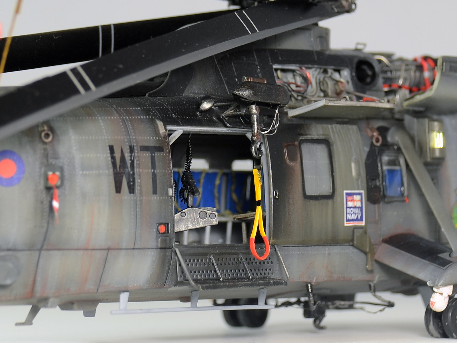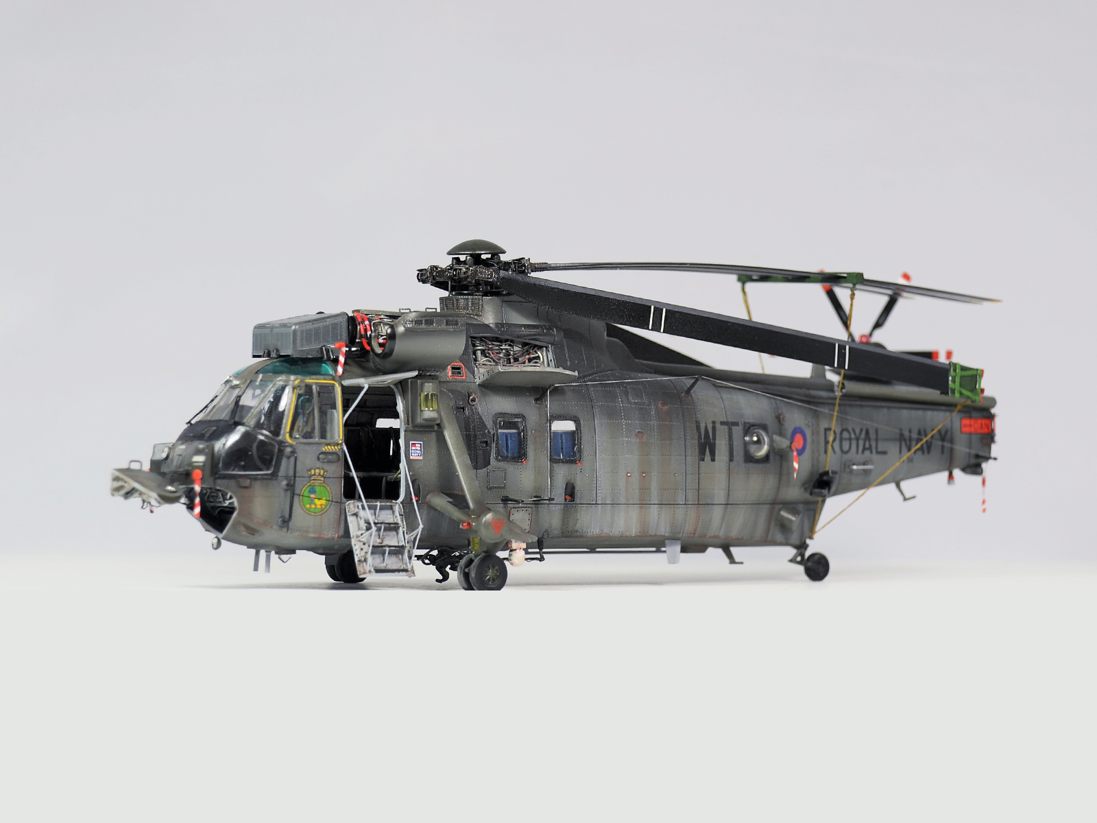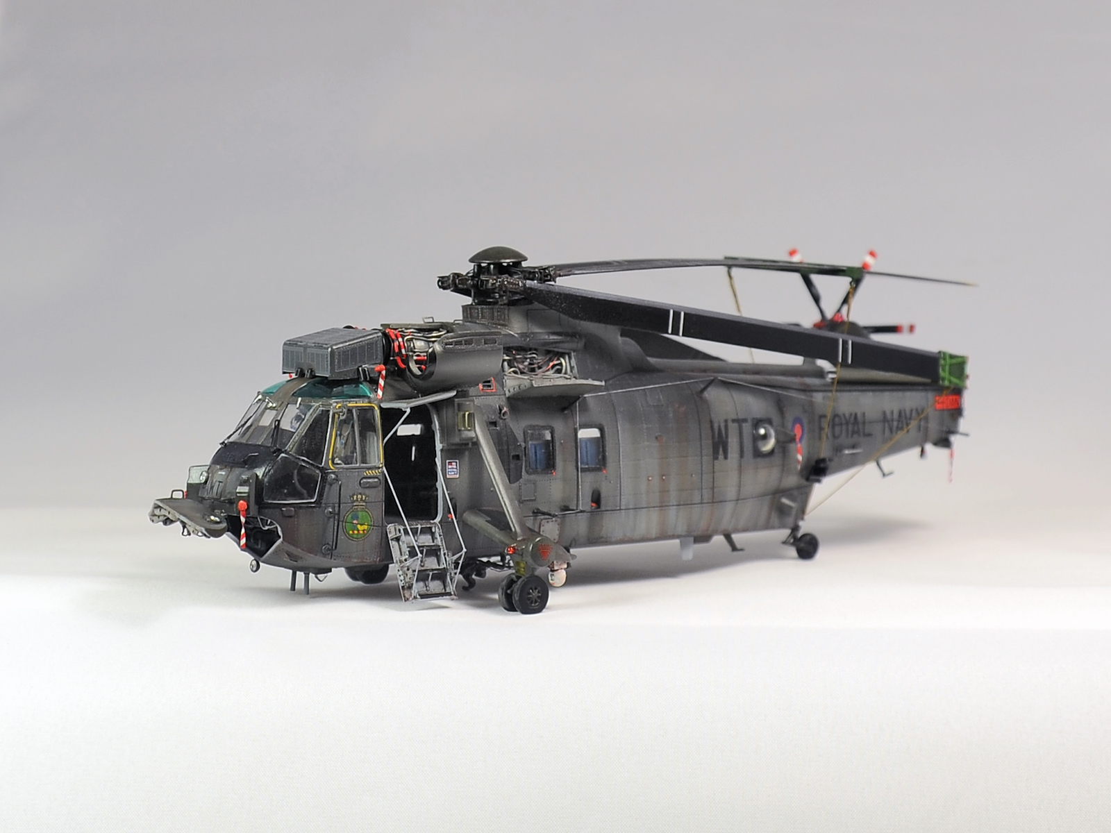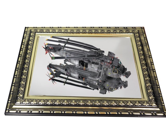 Красилась модель аэрографом привычными для меня эмалями Revellи Humbrol. Потом различные тонировки для того, чтобы добиться эффекта сильно выгоревшей и обтёртой краски. Так как предполагается, что вертолёт повоевал в битве за Фолклендские (Мальвинские) острова. А было это очень давно, в 1982 году. Затем эти модификации были использованы в составе SFORи IFOR. В общем помотались и пообтрепались. Использовал Миговские пигменты и фильтры. Тонировка верхних стёкол от солнца - Футура с зелёнкой. А различные коричневые стёкла на инфракрасных джаммерах - Футура с йодом.