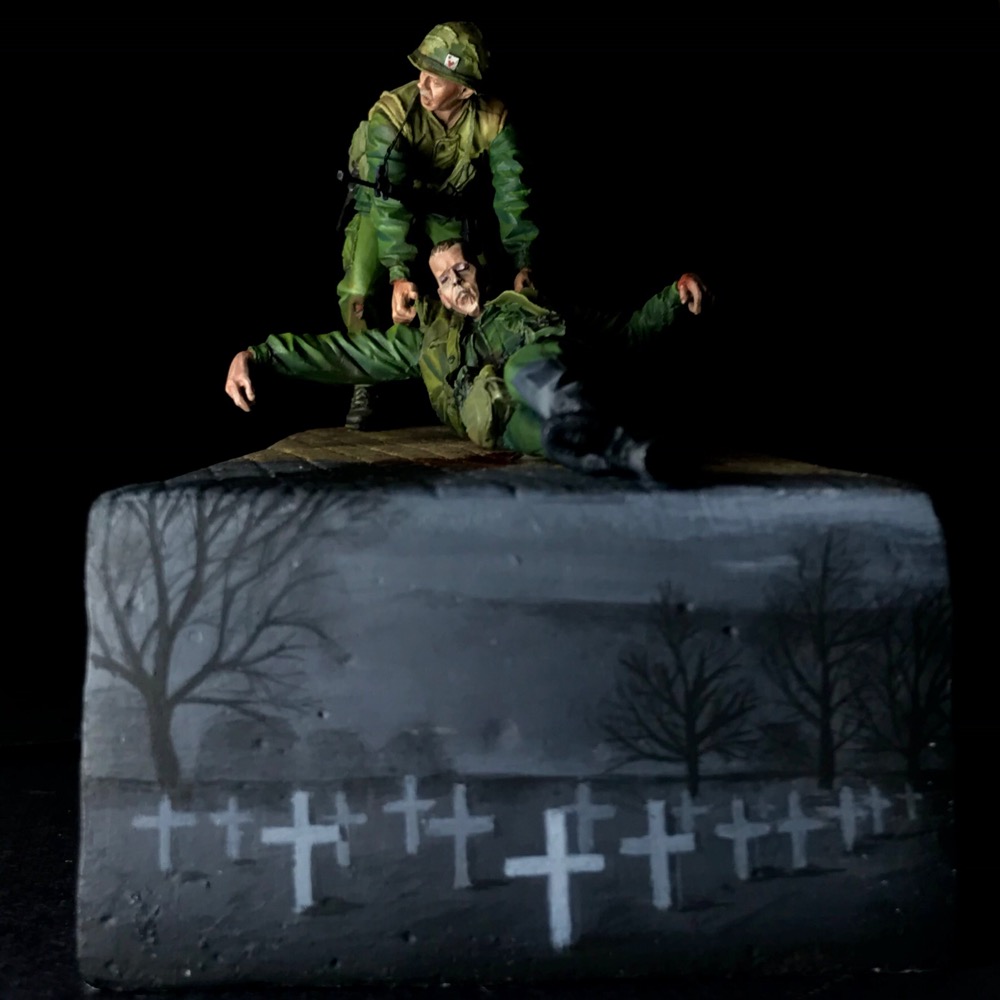 Чрезвычайно интересная задумка с цветной и серой частью диорамы... Потрясающий по своему драматизму серый сюжет с крестами.... Дерево, переходящее в след крови ооочень необычно. Задумка - творческая, креативная, необычная! И исполнение этой задумки технически выше всяких похвал. Роспись фигур на самом высоком уровне! Такое впечатление, что это не фотография фигурок, а рисунок художника, что эти солдаты нарисованы!!!! Одним словом, работа сильно зацепила! Браво!!