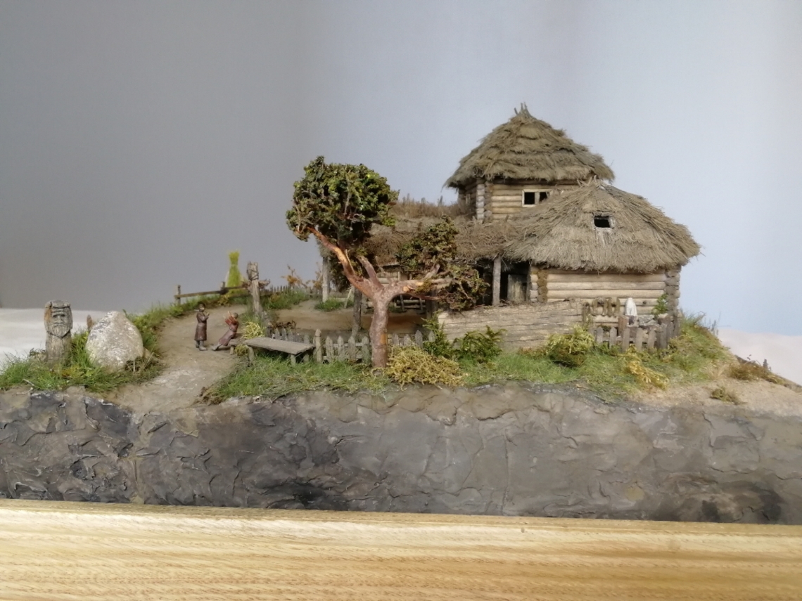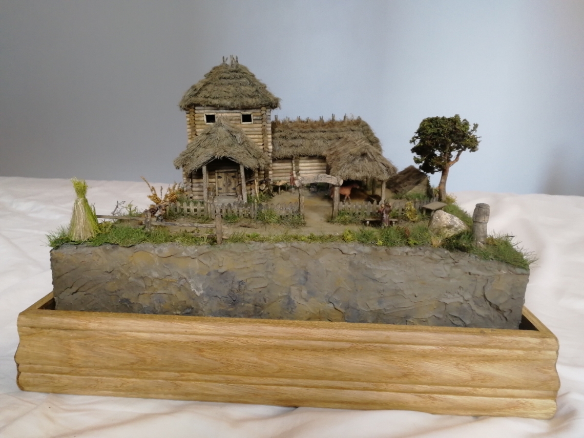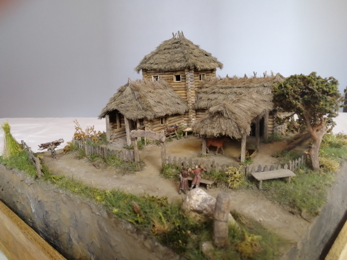 Дом сделан из деревянных палочек от фирмы Деревянное Русское Зодчество (заказывал просто бревнышки). Крыша, сноп сена - из пакли. Всяческую утварь сельскохозяйственную ( металлические детали) делал из полимерной глины. Основа Диорамы из пеноплекса, сверху глина или затирка, песок. Покраска обычной гуашью. Растительность - флок, различные виды мха и чего под руку похожего попалось.