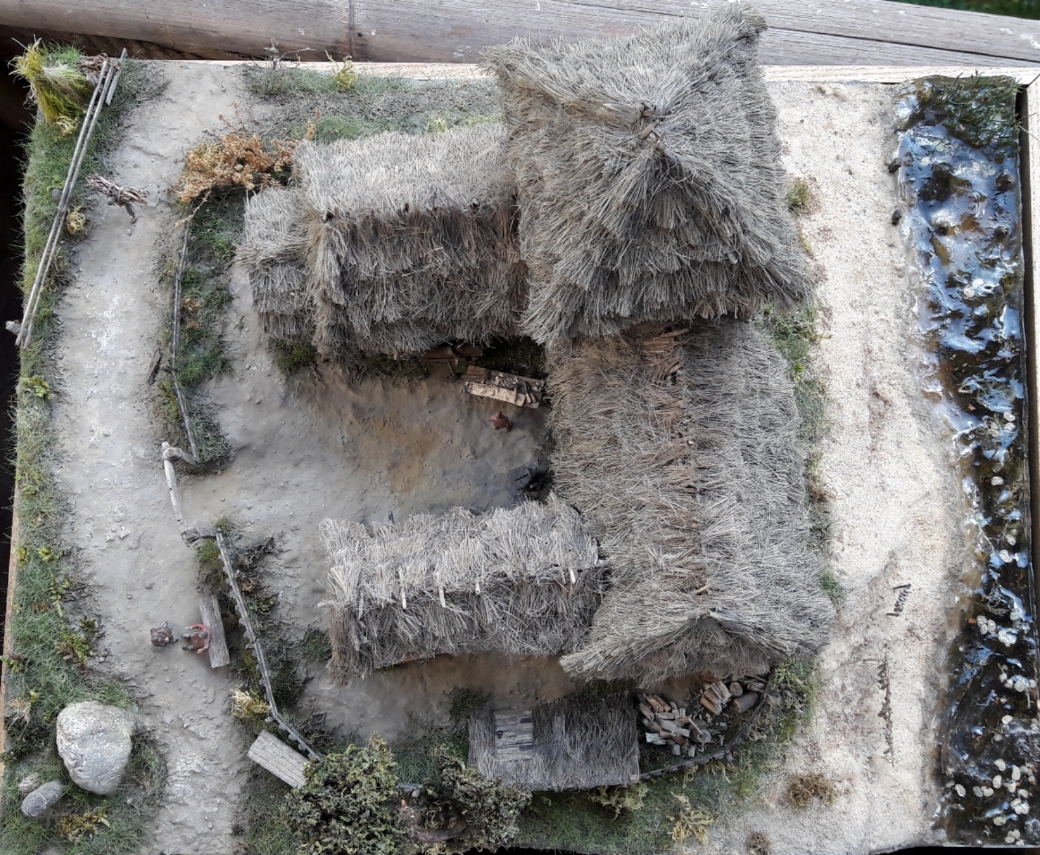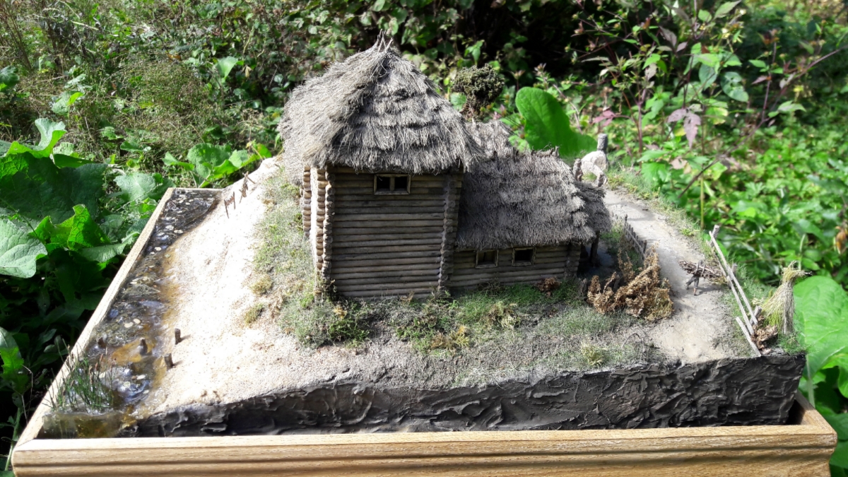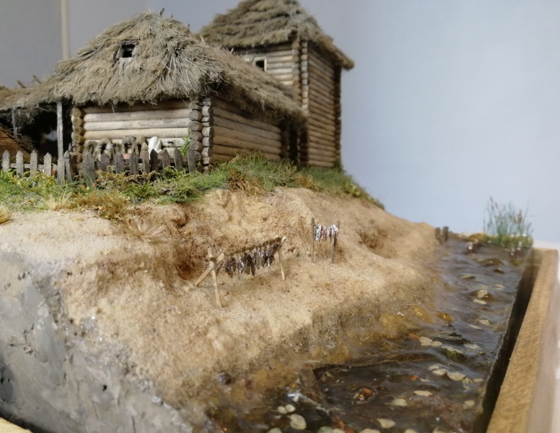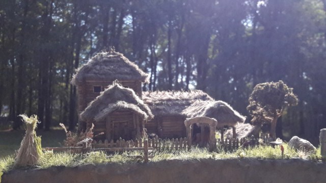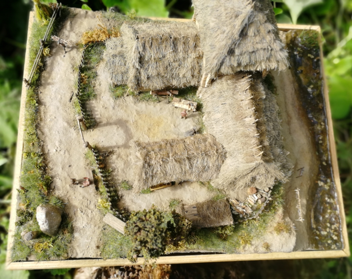 Дом сделан из деревянных палочек от фирмы Деревянное Русское Зодчество (заказывал просто бревнышки). Крыша, сноп сена - из пакли. Всяческую утварь сельскохозяйственную ( металлические детали) делал из полимерной глины. Основа Диорамы из пеноплекса, сверху глина или затирка, песок. Покраска обычной гуашью. Растительность - флок, различные виды мха и чего под руку похожего попалось.