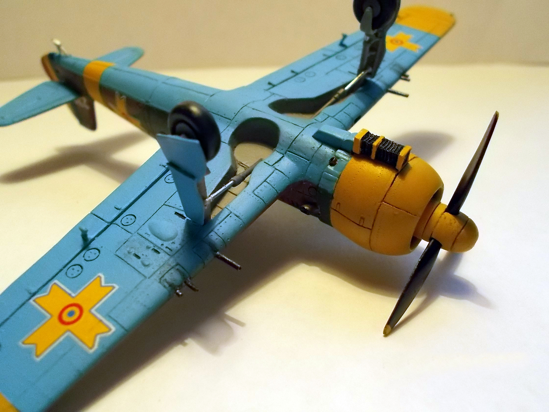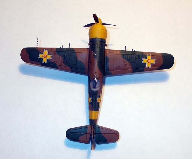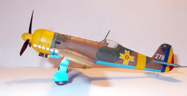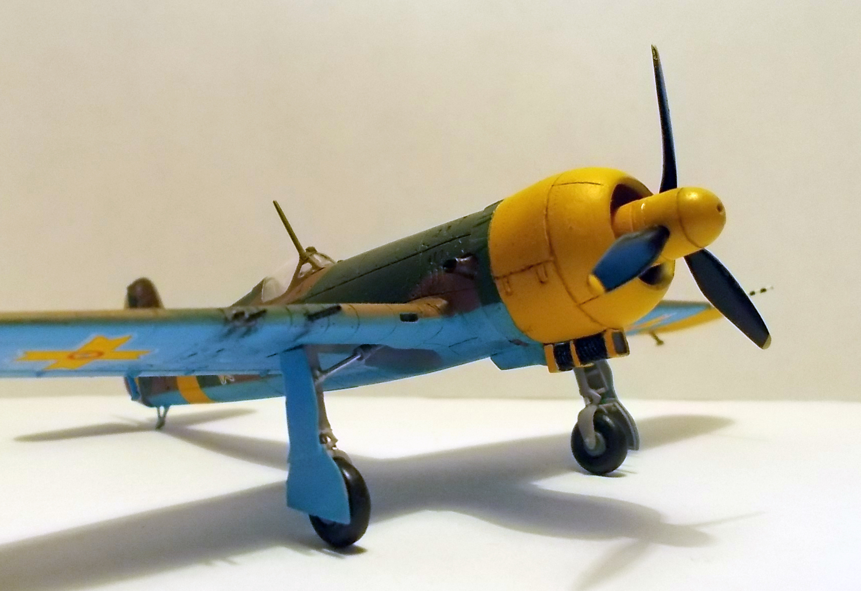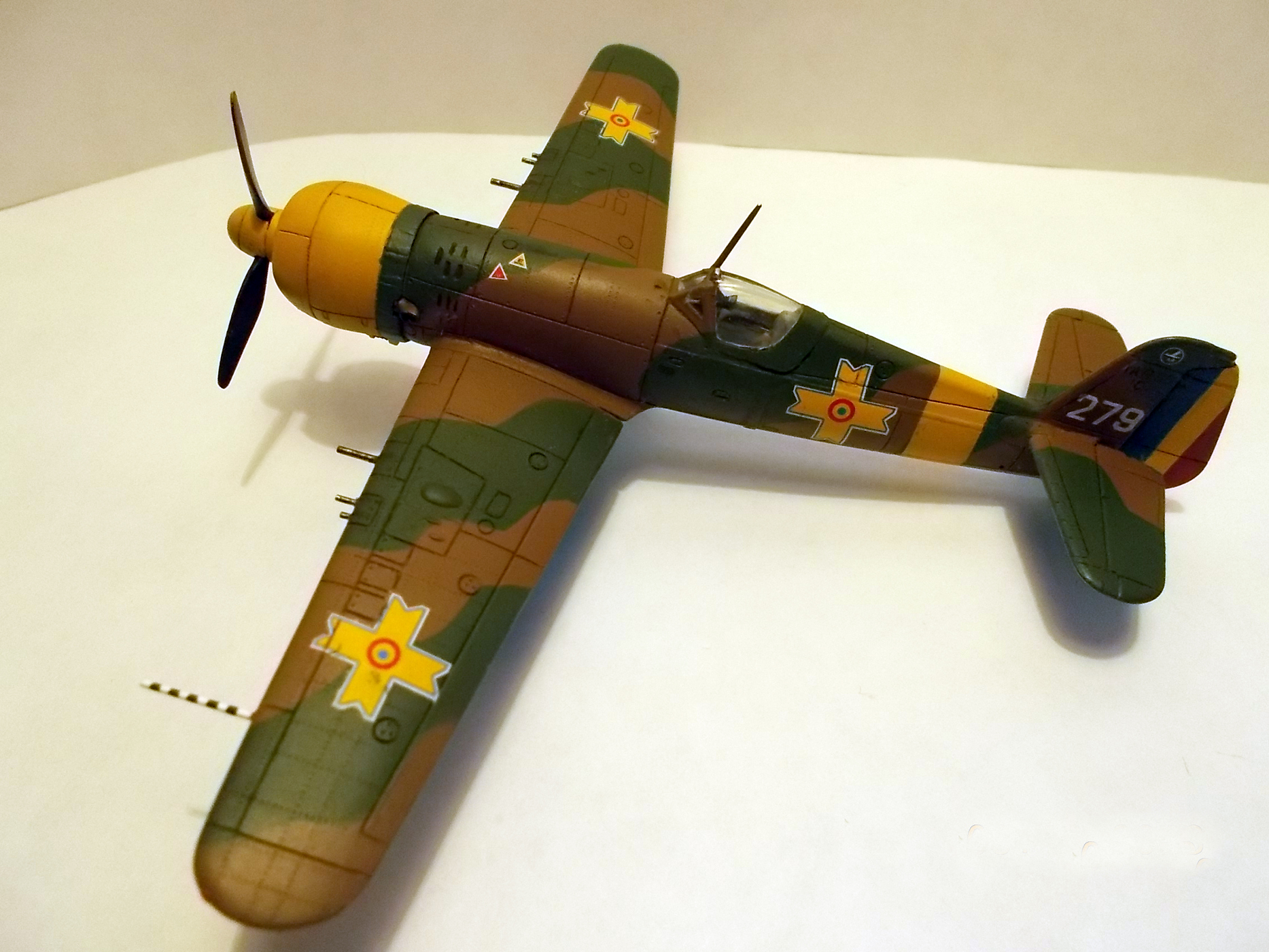 Давно мечтал иметь у себя на полке сей интересный истребитель румын. Что получилось - на фото. Сборка была с проблемами. Не понятно, как собирать кабину. Посмотрел кучу материалов, но кто во что горазд. Пытался сделать по чертежам кабины из сети. Но не сильно старался, т.к. мало что будет видно через полумутный фонарь. Сразу очень удивило не соответствие рисунка на коробке и схемы сборки с расшивкой предлагаемого крыла. Явно оружие должно быть другое и в большем количестве в соответствии с отверстиями для сбрасывания гильз. И верно, нашел чертеж именно этого крыла, где из вооружения было на крыло: по 2 пулемета и одна пушка. Это и притворил в жизнь! Пушки и пулеметы из игл шприцов разного диаметра. Заново сделал выпуклости для заднего костыля, ибо родные сточил из-за не симметрии и зазора между половинками корпуса. Помучился с установкой капота. Ну никак не хотел соосно становиться, то ли двигатель я криво приклеил, то ли ещё что. Пришлось делать незаметные вкладыши, выравнивающие капот для соосности с двигателем и фюзеляжем. Под капотом сделал самодельный воздушный фильтр из капроновой сетки от чулок натянув на выточенный под размер литник и пропитан супер клеем. Поверху наклеены полоски из полистирола для корпуса. Заново сделал цилиндры выпуска шасси, т.к. родные были со смещением формы. Со сборкой шасси проблем не было. Углубил местами расшивку. Немного накатал заклепок. Сделал для надежности ось вращения винта из самодельной пластиковой втулки. Вообще я редко применяю при сборке «изкоробочное» крепление винта для его вращения. Придумываю свои втулки и оськи из тянутого литника или стальные втулки от шприцов или делаю из прижимных трубочек для зажима электропроводов (бывают самых разных диаметров) для надежности и легкости вращения винта. Снизу на фюзеляже была сточена под ноль накладка идущая от крыльев к хвосту и добавлена полоса на это же место из тонкой полоски бумаги приклеенной на супер момент и пропитанная им.