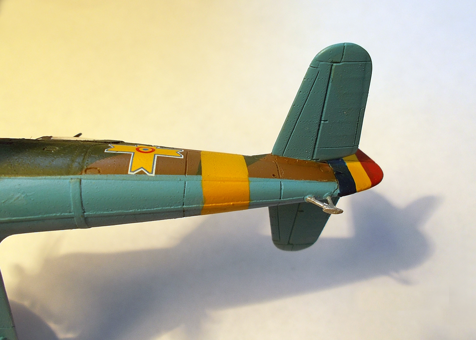 Есть пара косяков моей сборки. Это антенна, находящаяся на переплете фонаря, хотя она должна проходить насквозь в кабину. И чуть кривое загнутое крыло при виде спереди. То ли повело при склейке, то ли такие отливки кривые. Изменить не смог. Красил Тамией из аэрографа. Мешал краски сам. Предварительно не грунтовал, о чем пожалел, когда делал маски. Пришлось подкрашивать немного места от отлипнувшей краски. При переводе декалей сильных проблем не было, один крест надорвался при переводе, но успешно возвращен в нужное состояние. Руль поворота на хвосте красил кисточкой, предварительно разметив карандашом полосы. После задул полуматовым лаком.