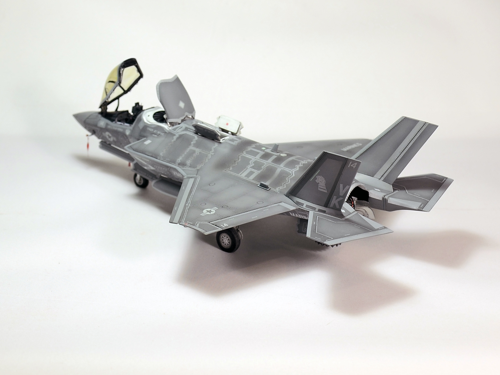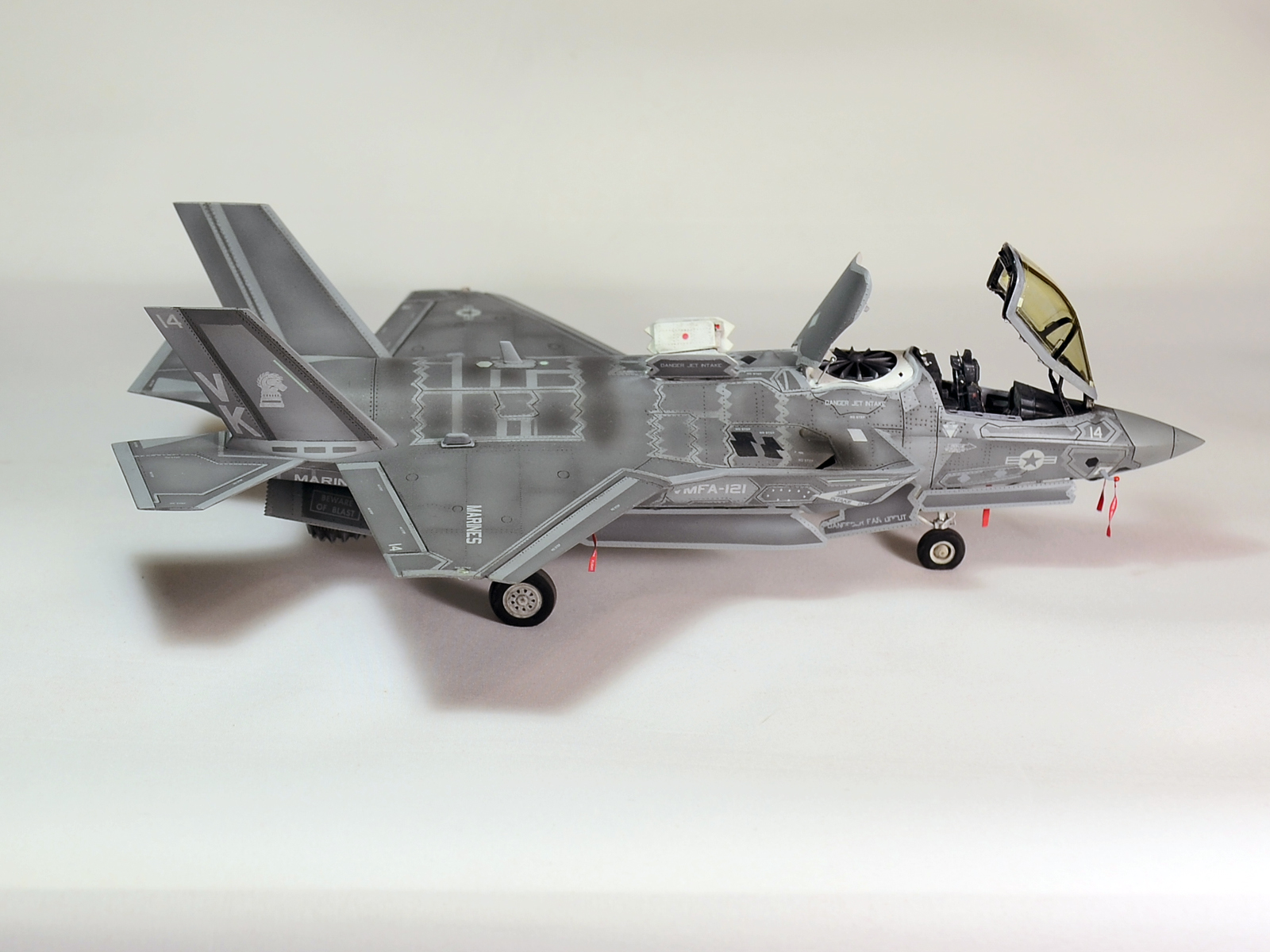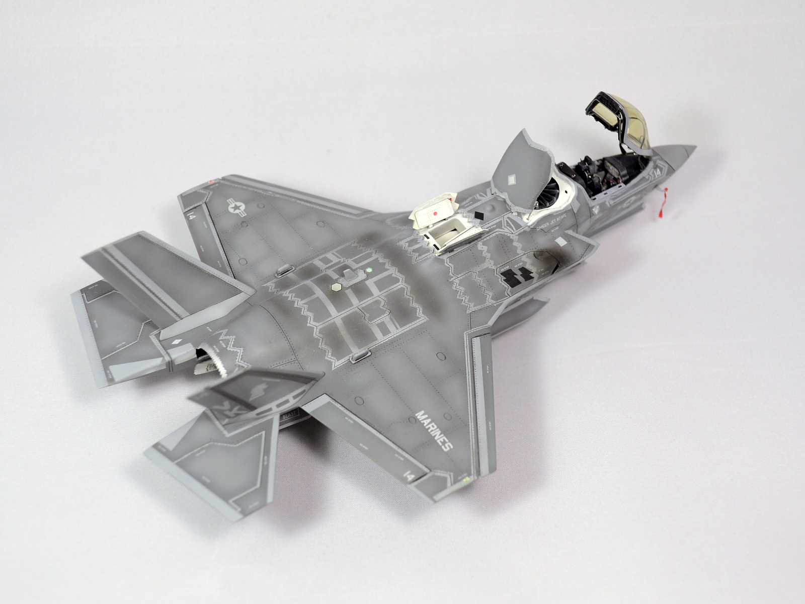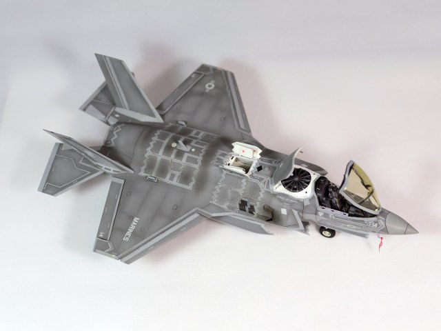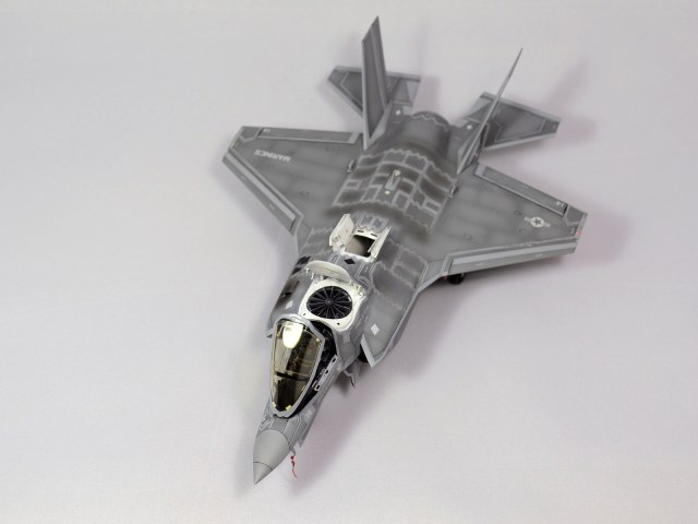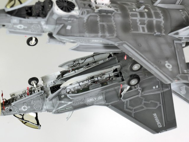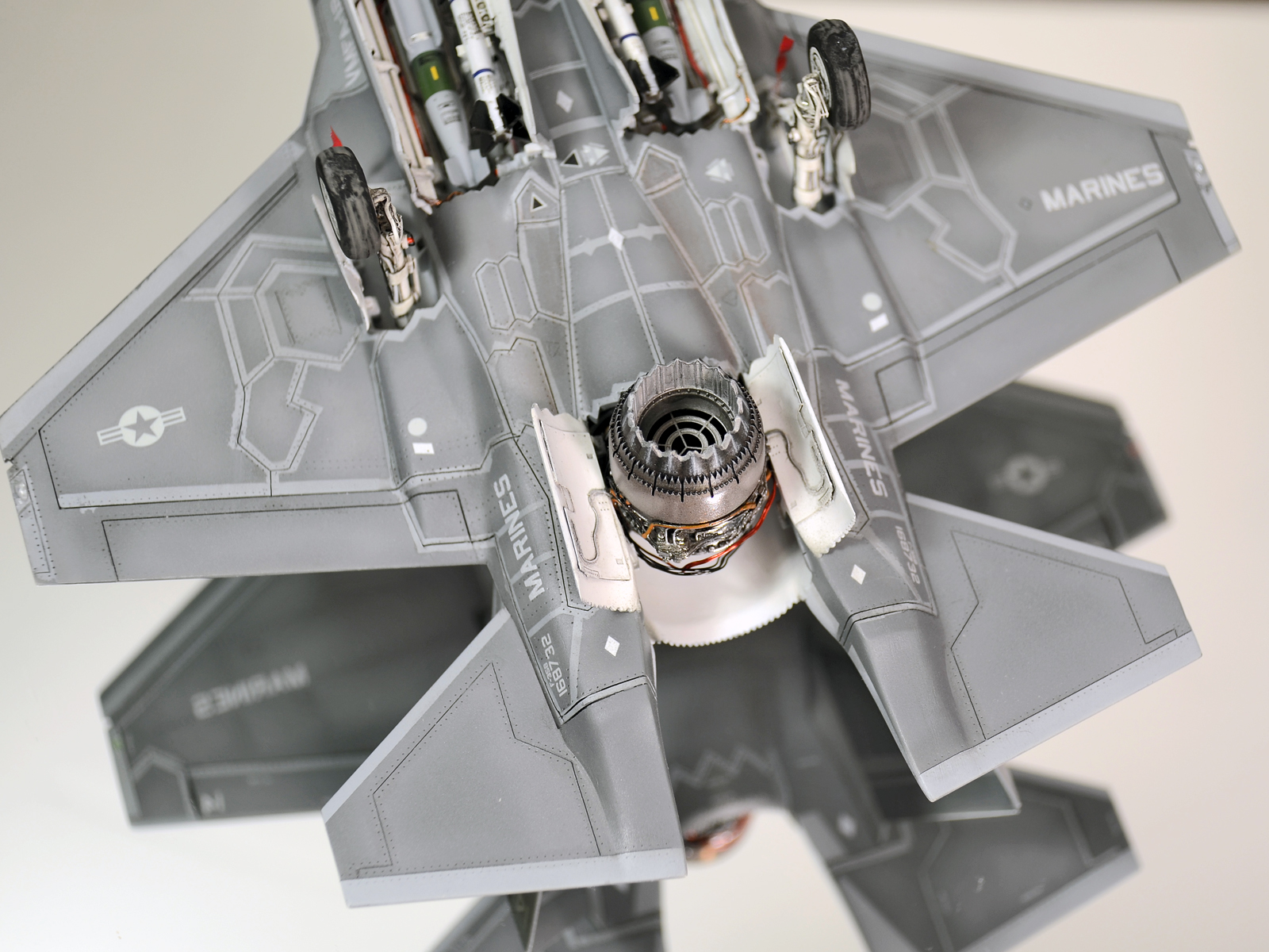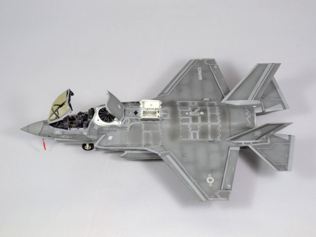 Немного просчитался. Предусмотренная по правому борту пушка, на этой модификации просто ни к чему и скорее всего её оттуда уберут. Во всех циркулярах и учебниках к этому самолёту, а именно к вертикалке, есть жёсткое требование не вступать в ближний бой. При первом же визуальном сближении пилоту советуют быстрей уносить ноги. Из-за медлительности и неповоротливости F-35B он становится лёгкой мишенью, а это минус 130 миллионов долларов за подбитый. Поэтому пушка вообще не понятно для чего? А я на своём сымитировал нагар от стрельбы. Скорей всего по воробьям))