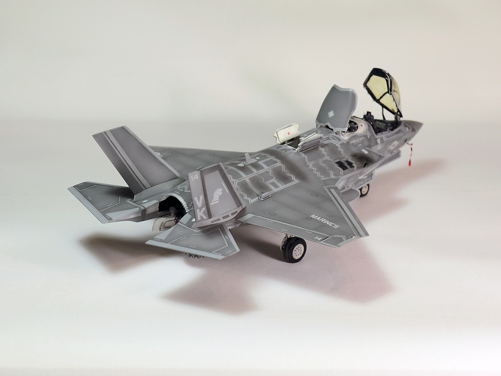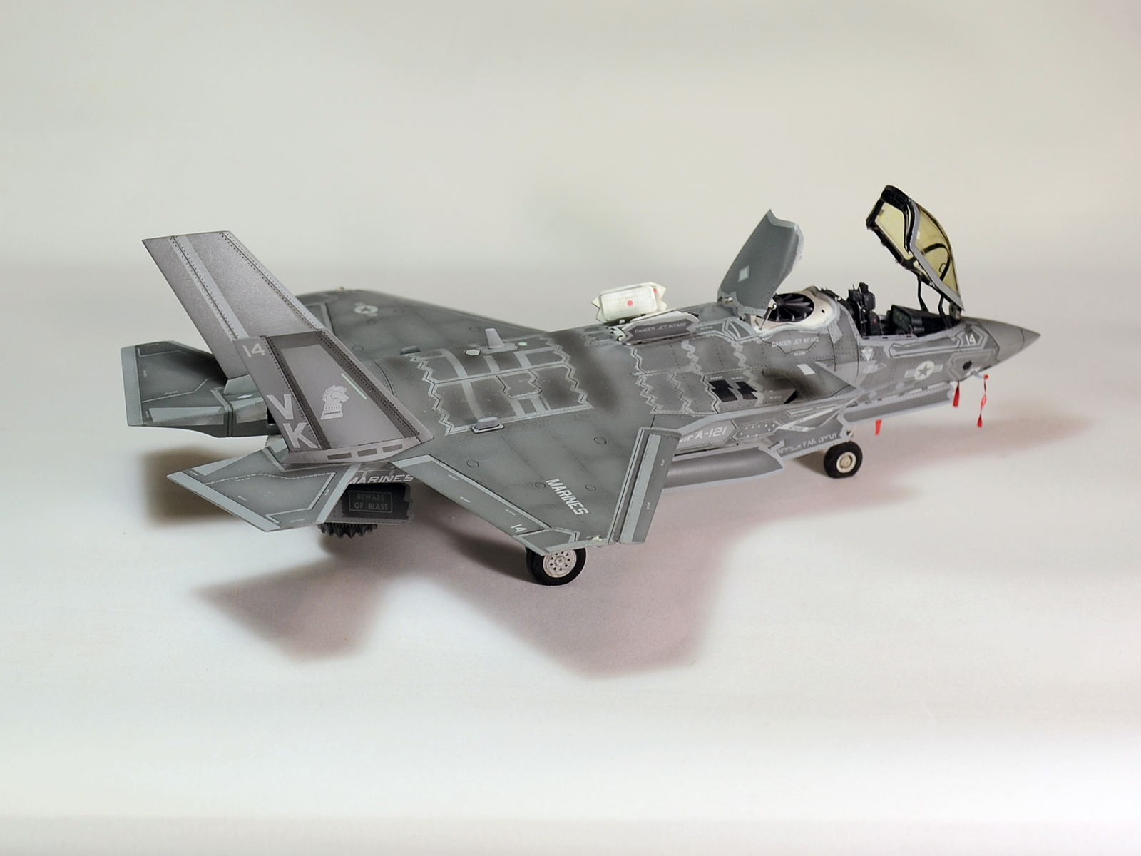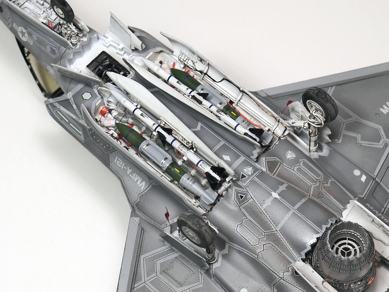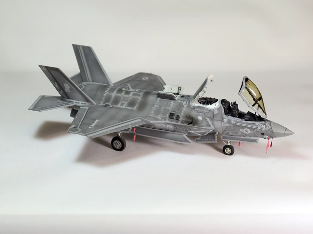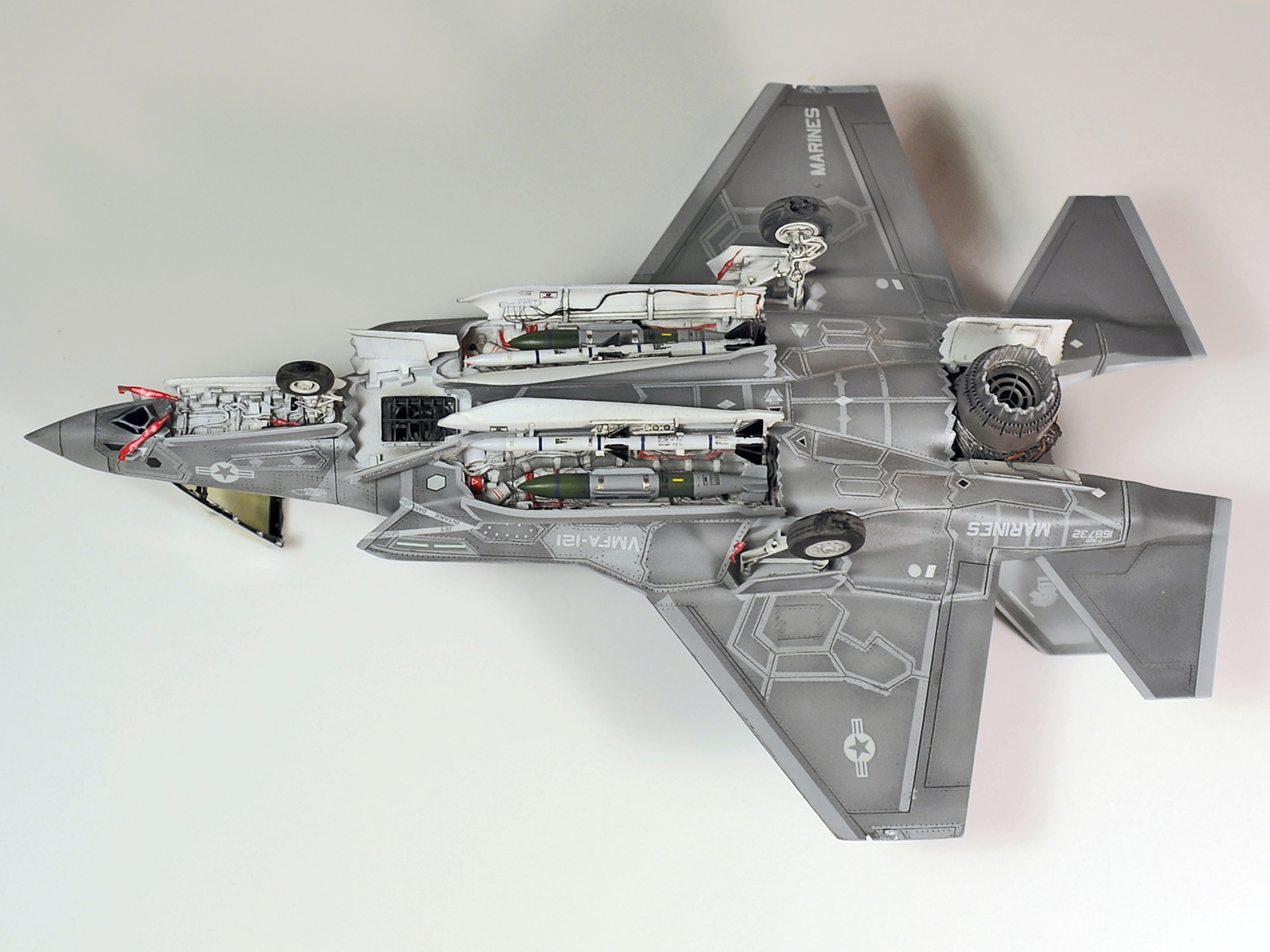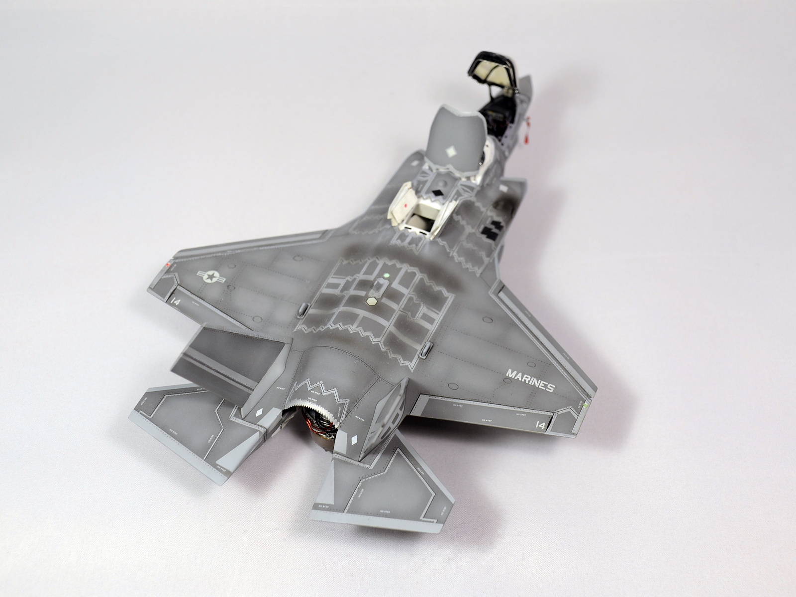 Немного просчитался. Предусмотренная по правому борту пушка, на этой модификации просто ни к чему и скорее всего её оттуда уберут. Во всех циркулярах и учебниках к этому самолёту, а именно к вертикалке, есть жёсткое требование не вступать в ближний бой. При первом же визуальном сближении пилоту советуют быстрей уносить ноги. Из-за медлительности и неповоротливости F-35B он становится лёгкой мишенью, а это минус 130 миллионов долларов за подбитый. Поэтому пушка вообще не понятно для чего? А я на своём сымитировал нагар от стрельбы. Скорей всего по воробьям))