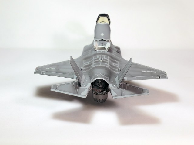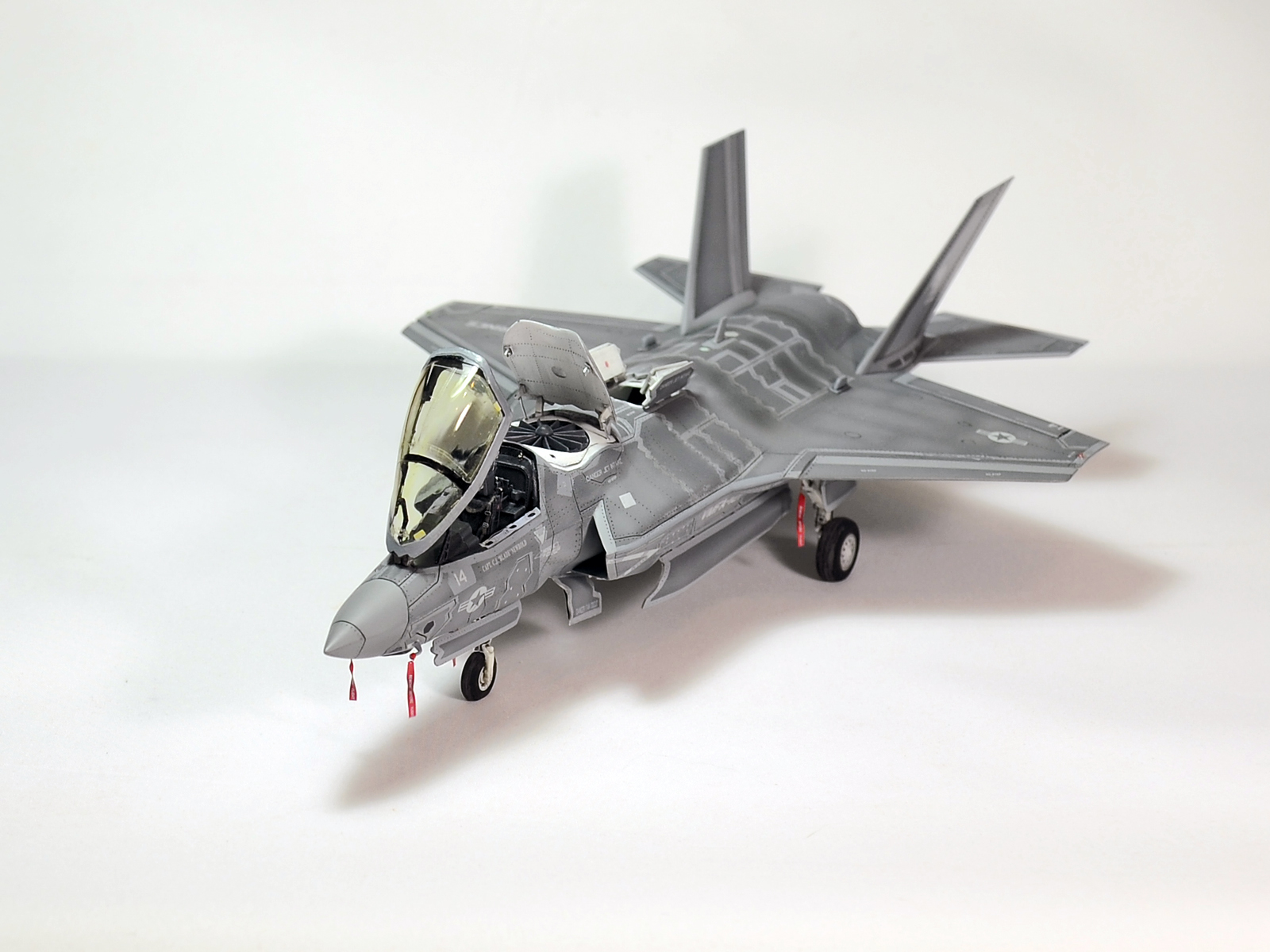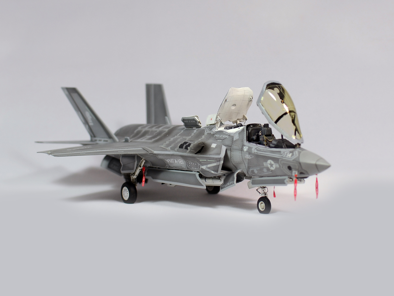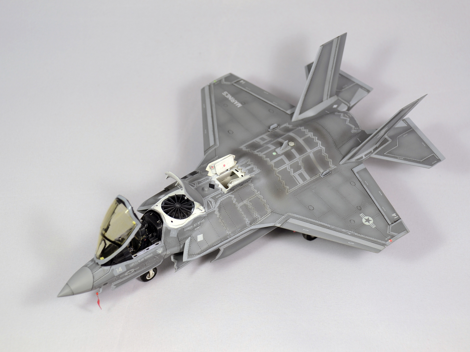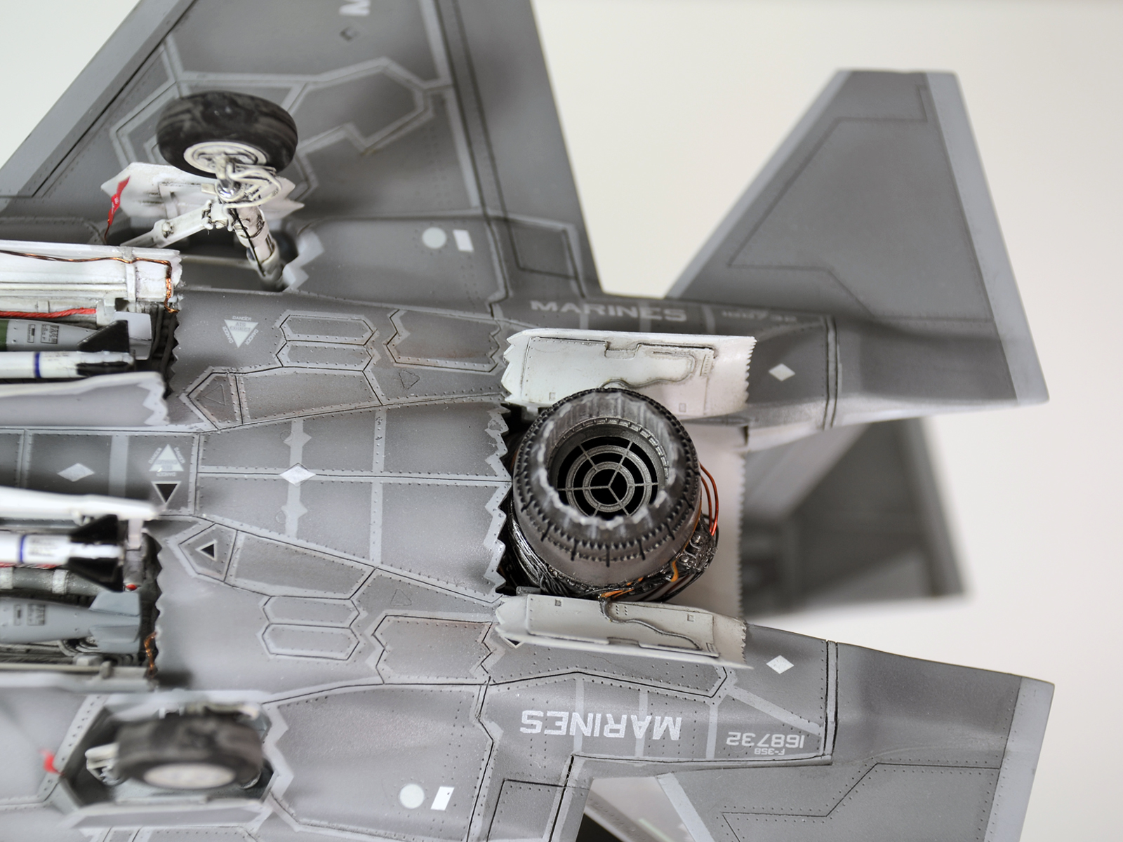 Немного просчитался. Предусмотренная по правому борту пушка, на этой модификации просто ни к чему и скорее всего её оттуда уберут. Во всех циркулярах и учебниках к этому самолёту, а именно к вертикалке, есть жёсткое требование не вступать в ближний бой. При первом же визуальном сближении пилоту советуют быстрей уносить ноги. Из-за медлительности и неповоротливости F-35B он становится лёгкой мишенью, а это минус 130 миллионов долларов за подбитый. Поэтому пушка вообще не понятно для чего? А я на своём сымитировал нагар от стрельбы. Скорей всего по воробьям))