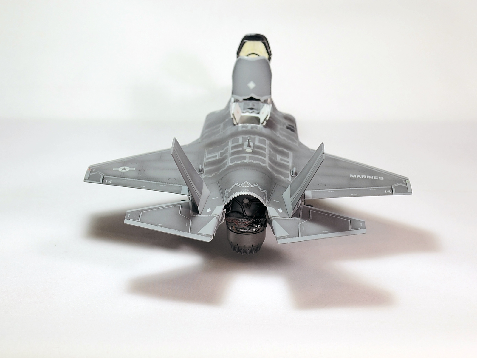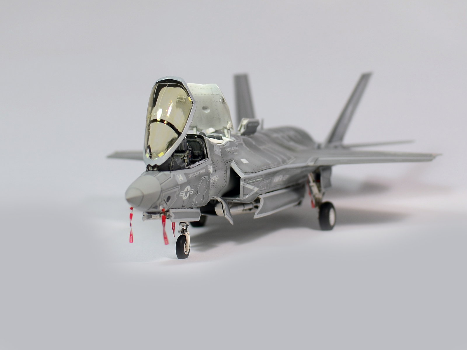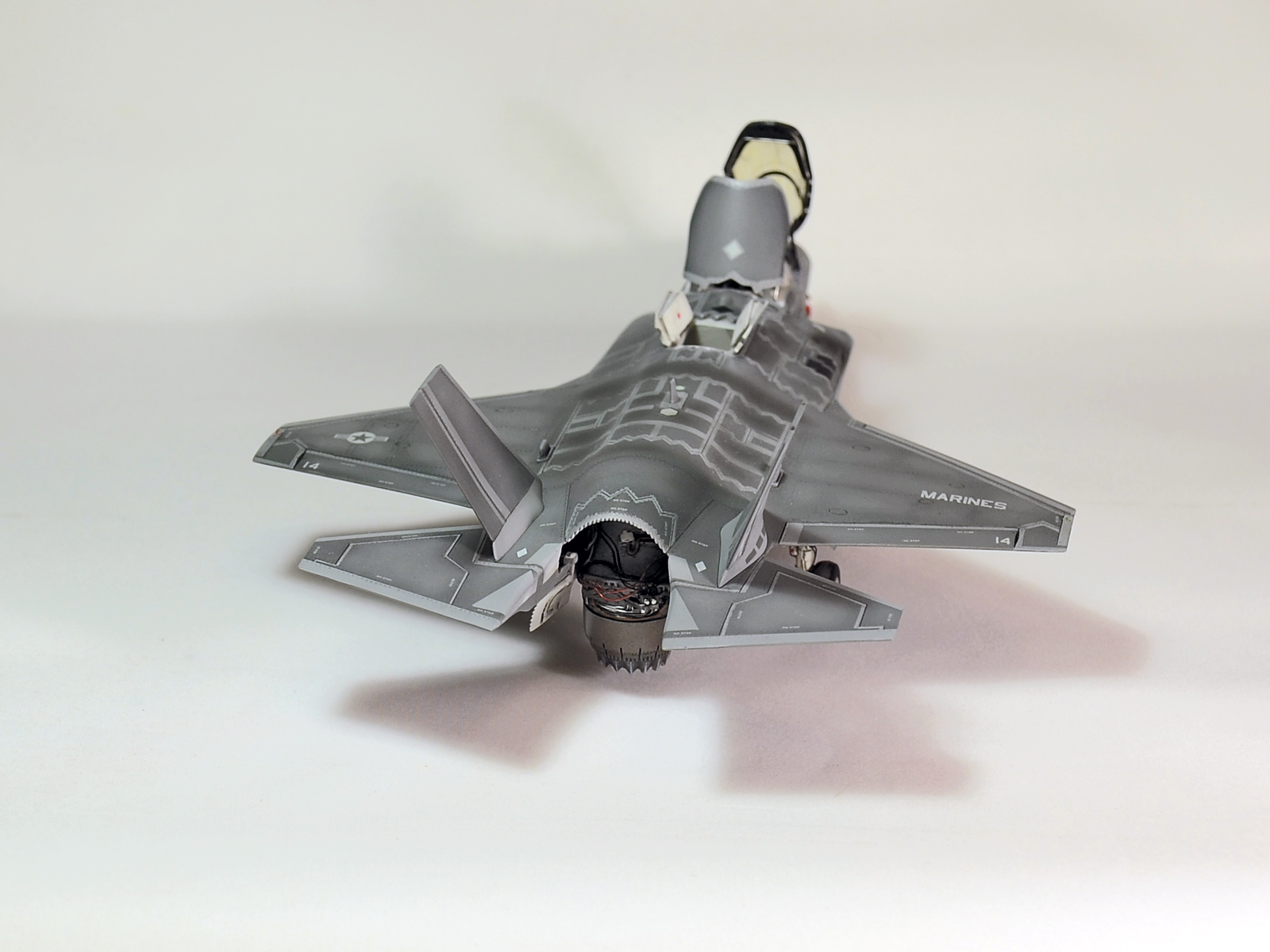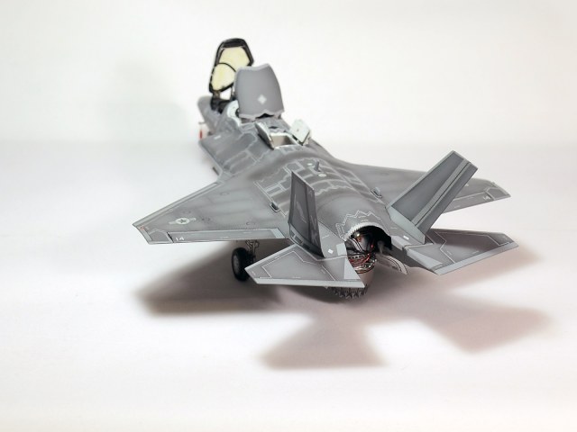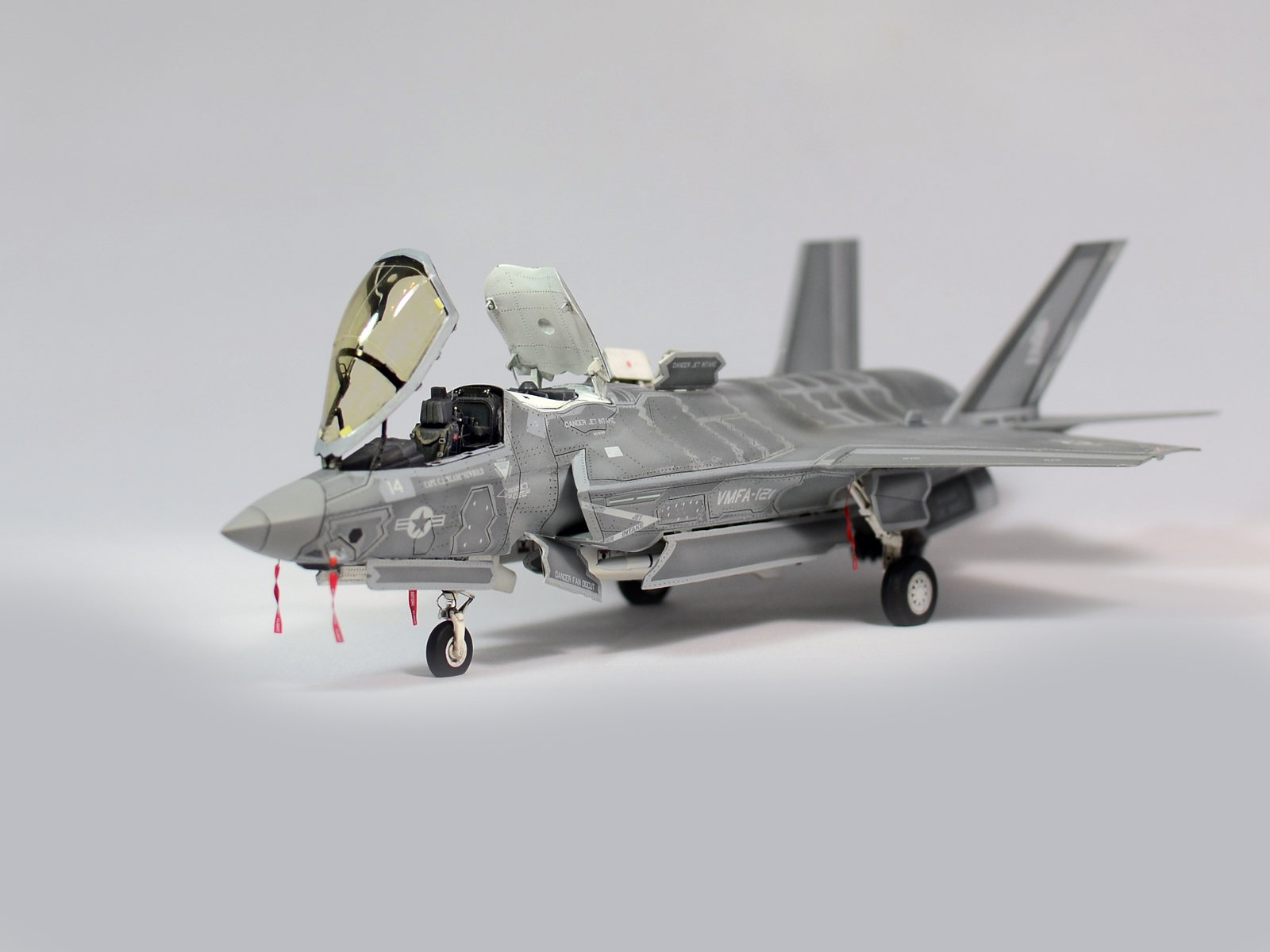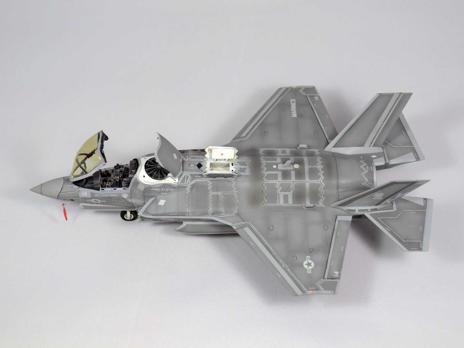 Немного просчитался. Предусмотренная по правому борту пушка, на этой модификации просто ни к чему и скорее всего её оттуда уберут. Во всех циркулярах и учебниках к этому самолёту, а именно к вертикалке, есть жёсткое требование не вступать в ближний бой. При первом же визуальном сближении пилоту советуют быстрей уносить ноги. Из-за медлительности и неповоротливости F-35B он становится лёгкой мишенью, а это минус 130 миллионов долларов за подбитый. Поэтому пушка вообще не понятно для чего? А я на своём сымитировал нагар от стрельбы. Скорей всего по воробьям))