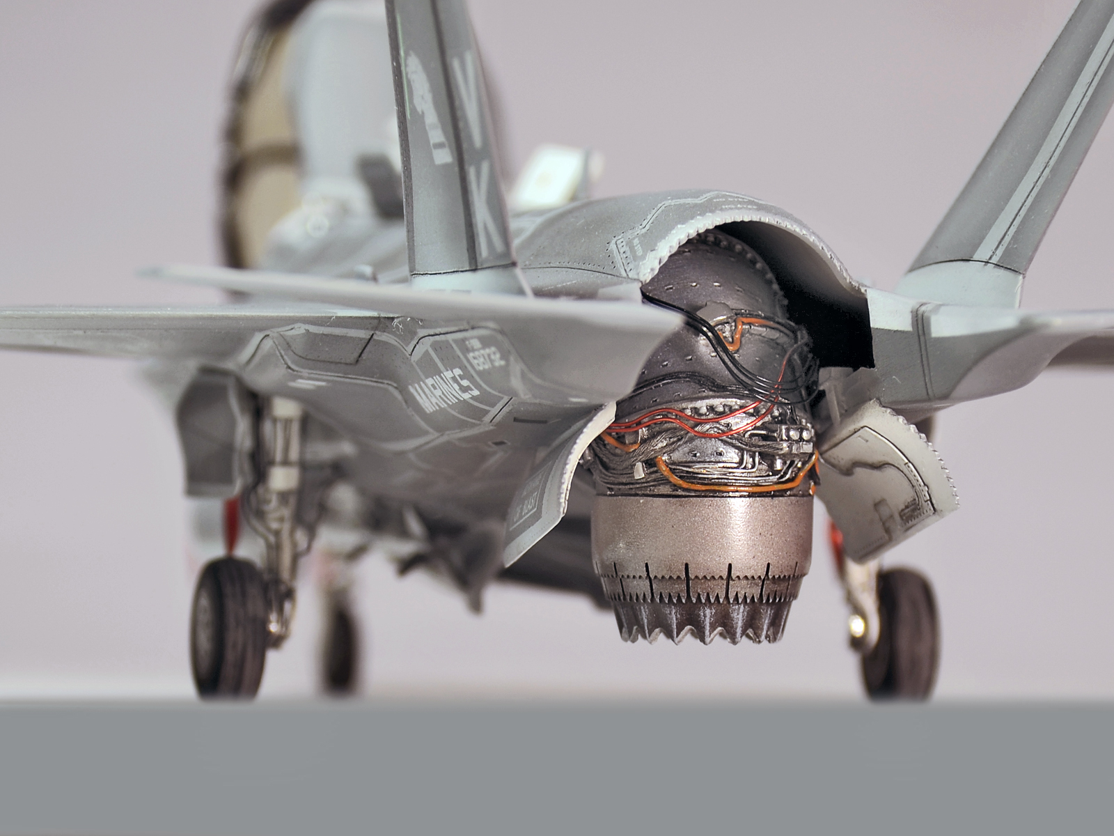 Немного доработал двигатель с его сервоприводами. Использовал проволоку разного диаметра. Доработал ниши отсеков вооружения. Добавил проводку и воздуховоды так же из проволоки.