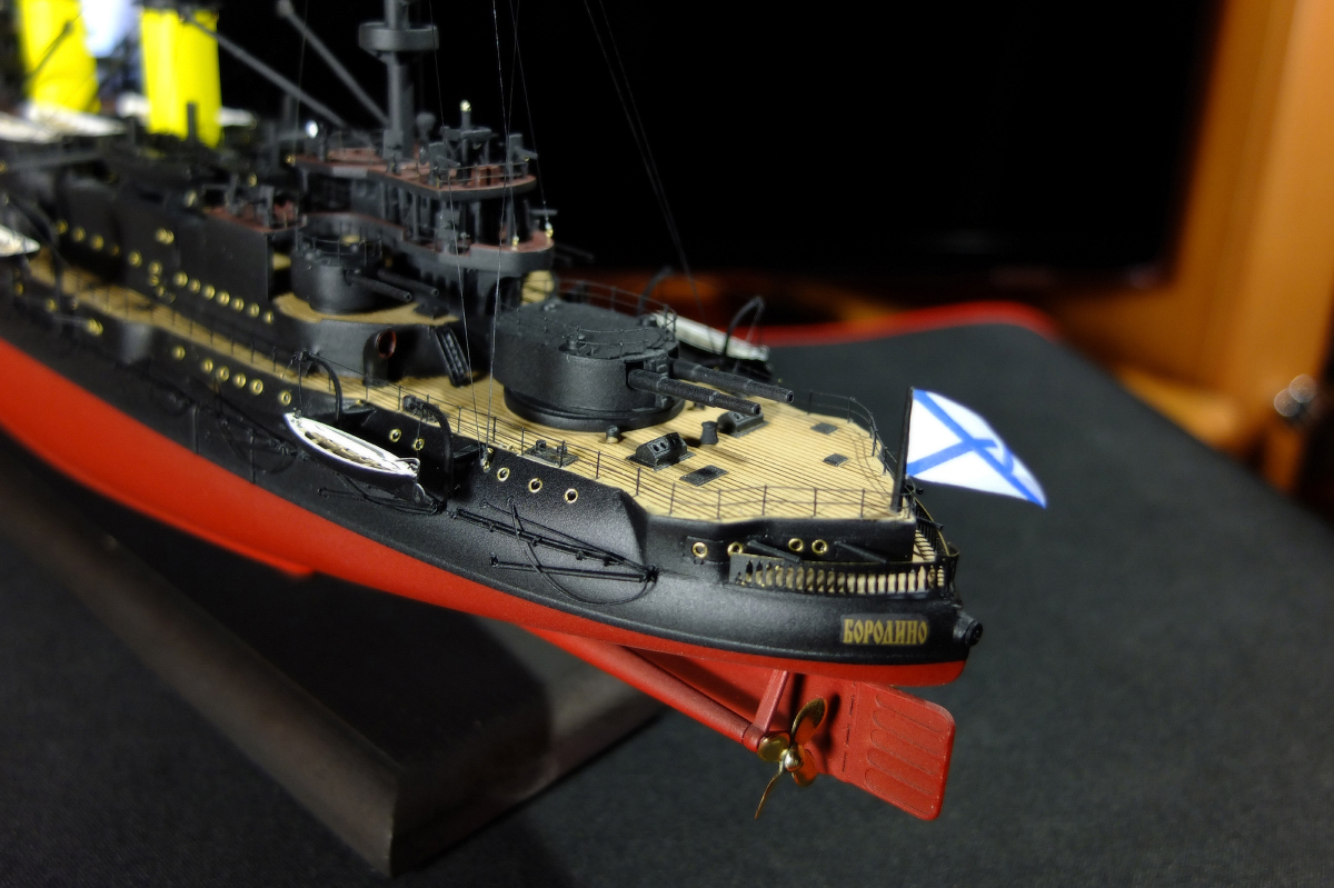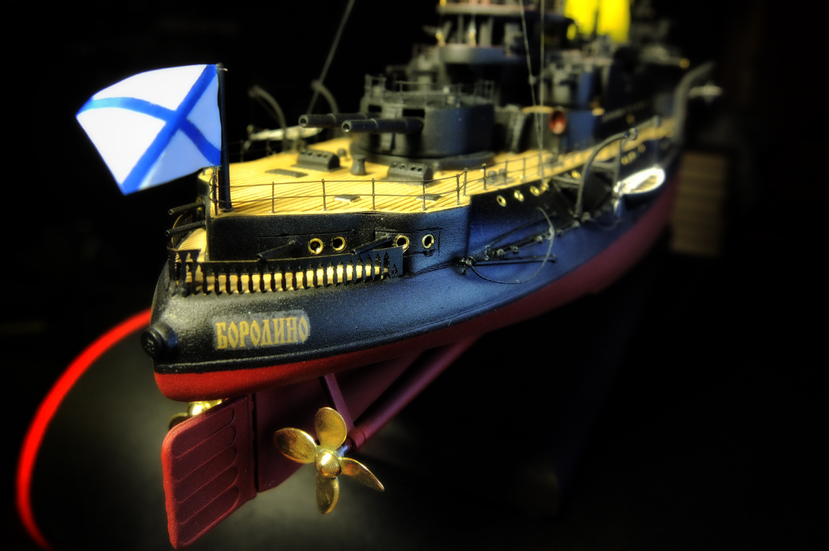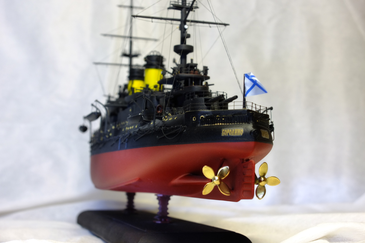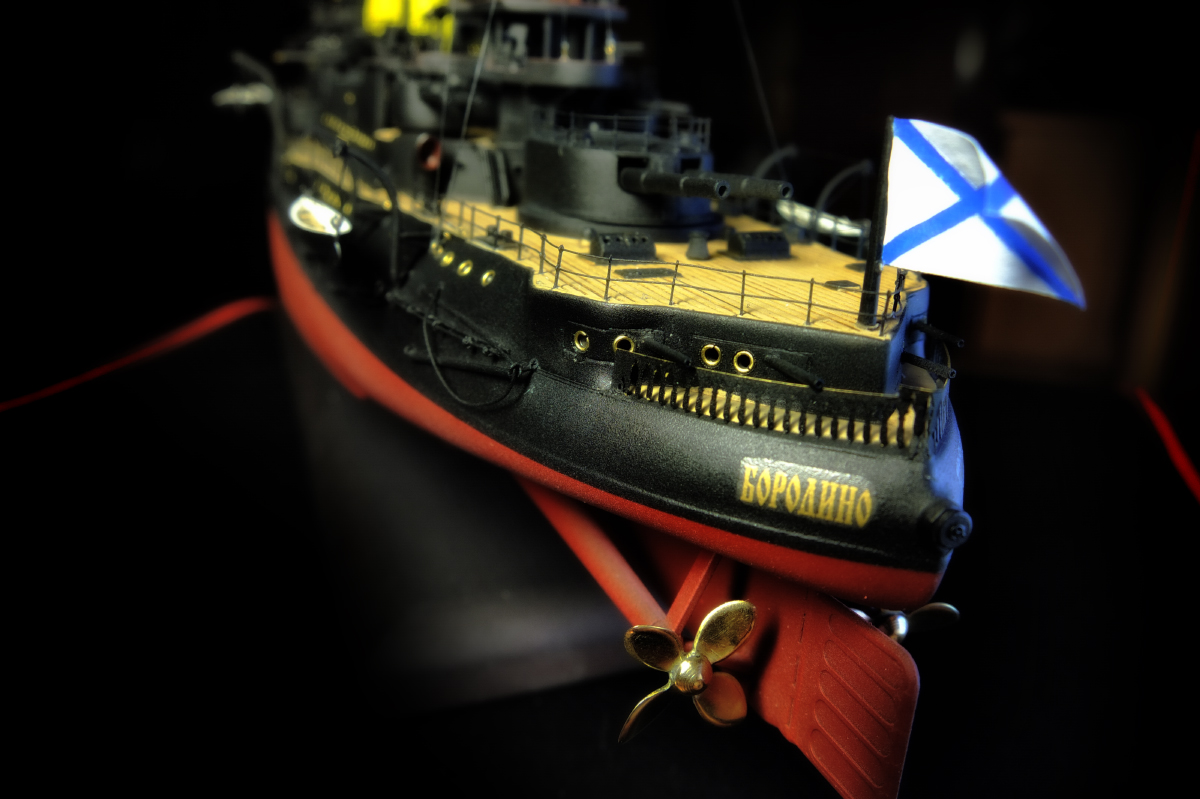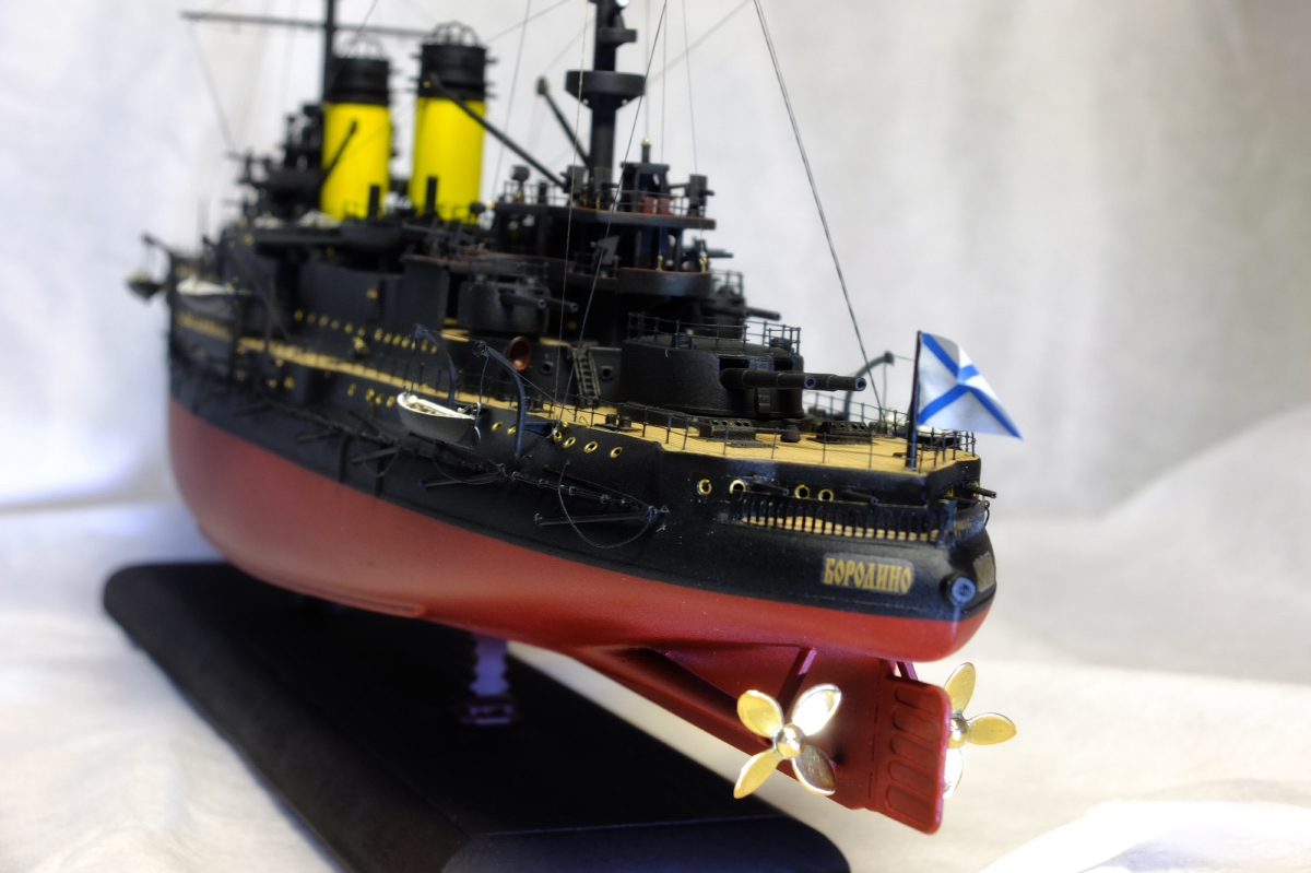 Разрешите представить модель, которую сделал мой отец. Модель российского броненосца «Бородино». Корабль известный, поэтому писать о нем не вижу смысла. Модель строилась без особой привязки к оригиналу, хотя использовалась книга В.Грибоского и описания, уже выставленных на каропке, моделей. Конечно, отец что-то подсмотрел, что-то добавил самостоятельно. Строилась модель 8 месяцев с небольшими перерывами. Если кому-то интересно, то иллюминаторы делались следующим способом: сначала высверливались отверстия, из проволоки 0.2мм изготавливались колечки с внутренним диаметром равным диаметру сверла, затем зубным бором, размером на 0.4мм больше диаметра сверла, делались углубления (фото прикреплено). После покраски, колечки (иллюминаторы) вставлялись на «щелчок», держались без клея и лака. Шлюпки переделаны: фрезой была убрана внутрянка и изготовлена приближенная к действительности. Леерные стойки от фирмы Aresin под леер диаметром 0.15мм. Мачты из зубочисток, весла из проволоки 0.2мм. Таккелаж из спандекса. Большой и средний калибры из игл. Лопасти винтов и ступицы из латуни. Подставка из ореха.