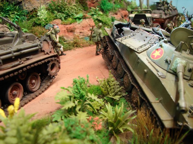 Многие модели и большинство фигур узнаю. С БРЭМ вообще история один в один - у меня был под "Бурю в пустыне" а хотелось под Вьетнам и пришлось перепиливать в более раннюю модификацию. В описании сюжета есть досадная ошибка - на вооружении Вьетконга танков никогда не было. Танками располагала только ВНА(вьетнамская народная армия - официальные войска ДРВ).