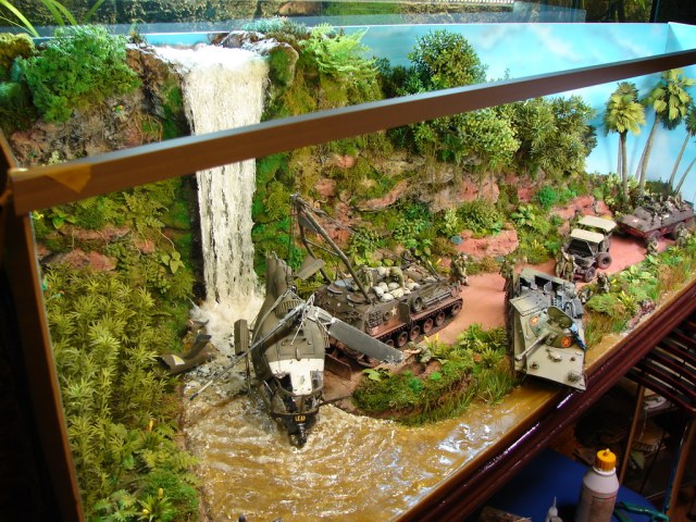Ладшафт выполненный из пенопласта,пены,эпоксидки.Со смолой случился неприятный инцидент:не учел летнюю температуру не очень подходящую для полиэфирки.Замешал большой объем и смола вскипела...Успел выдрать танк и вертолет...Всю растительность в воде, пришлось переделывать заново.(Пришлось долго вычищать стаместкой пену с берегов и техники.Задник нарисован акрилом.