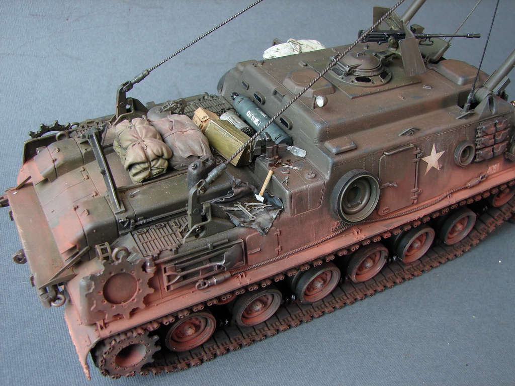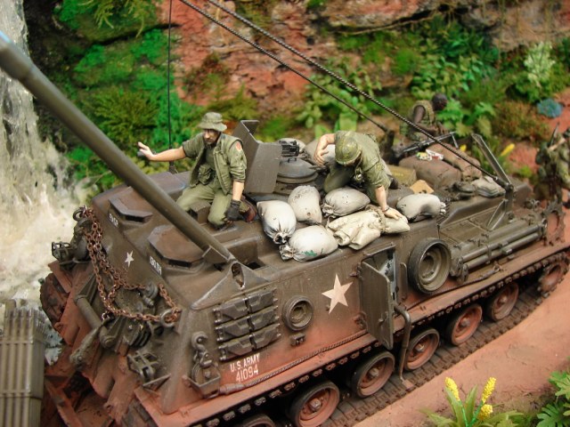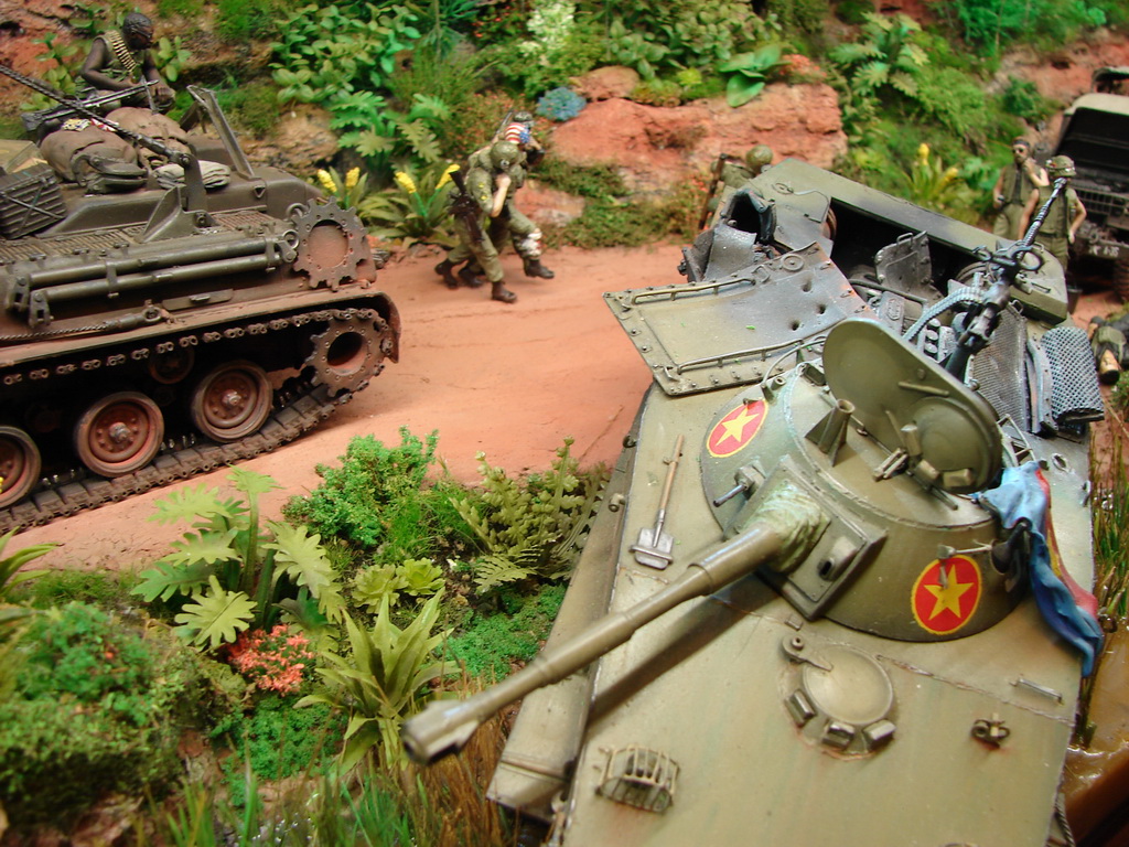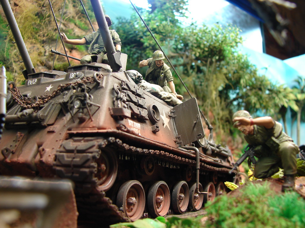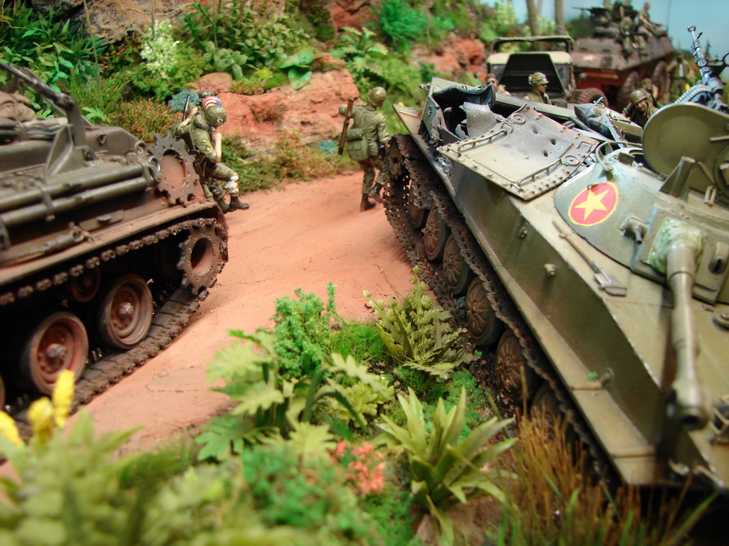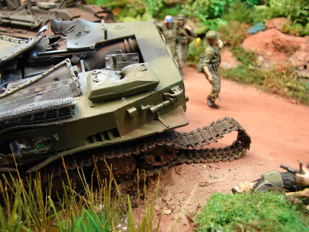 БРЭМ М88 от АФВ пришлось переделать в машину времен вьетнамской войны,так как у меня имелась в наличии более поздняя машина.(ПТ-76 от Восточного Экспресса у меня на полке пролежал лет 18(!!!) Он всем известен...Ему пришлось сделать интерьер башни,моторный отсек и исправить кучу багов по экстерьеру.М37-достаточно новая модель от Родена.Довольно копийная модель,но соирается "из под палки".(Кадиллак от Трумпа -простой и известный.Но у меня была модель позднего варианта....Пришлось ее тоже переделывать до нужного.Вертолет-стариный МРК.Некоторые вещи были добавлены для смотрибельности.Фигуры -смола от Хобби Фана,Легенд.Пластик от Мастер Бокса,Драгона.